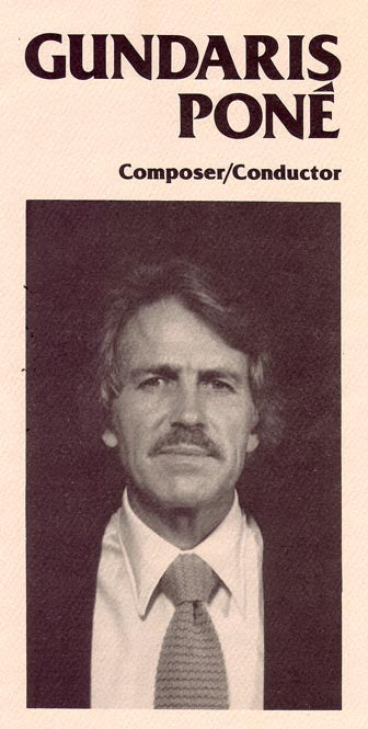 Composer, conductor and professor at State University College at New Paltz, Poné was born in Riga, Latvia, in 1932, and died in Kingston, NY 1993. He was a prolific and eclectic composer, educated in Europe and the U.S., receiving his Ph.D. from the University of Minnesota in 1962. He sought a middle ground between avant-garde techniques and neo-Romantic expressivity. He became a champion of American music and for several years directed the Poné Ensemble for New Music and the Music in the Mountains Festival series in New Paltz. He received the Kennedy Center Friedheim Award, and has won prizes from the Enescu Competition, the Trieste International Competition, the International Double Bass composition competition and the Louisville Orchestra International Competition.