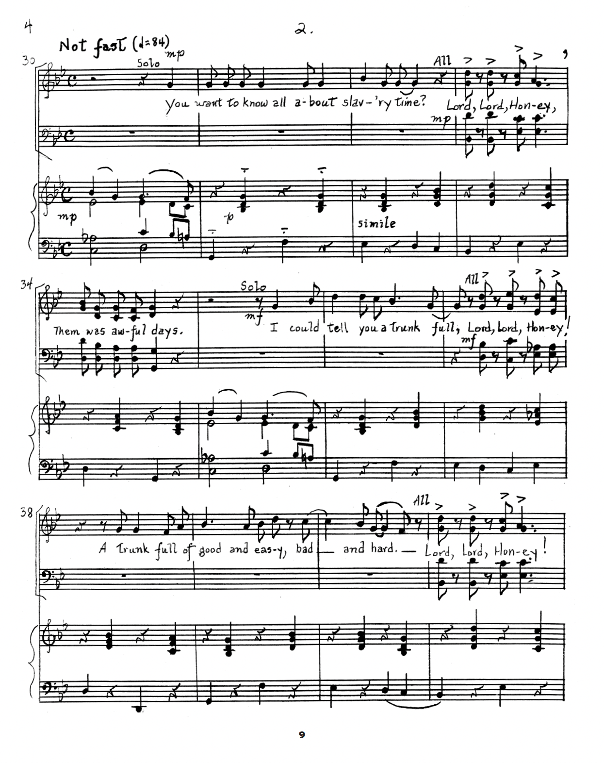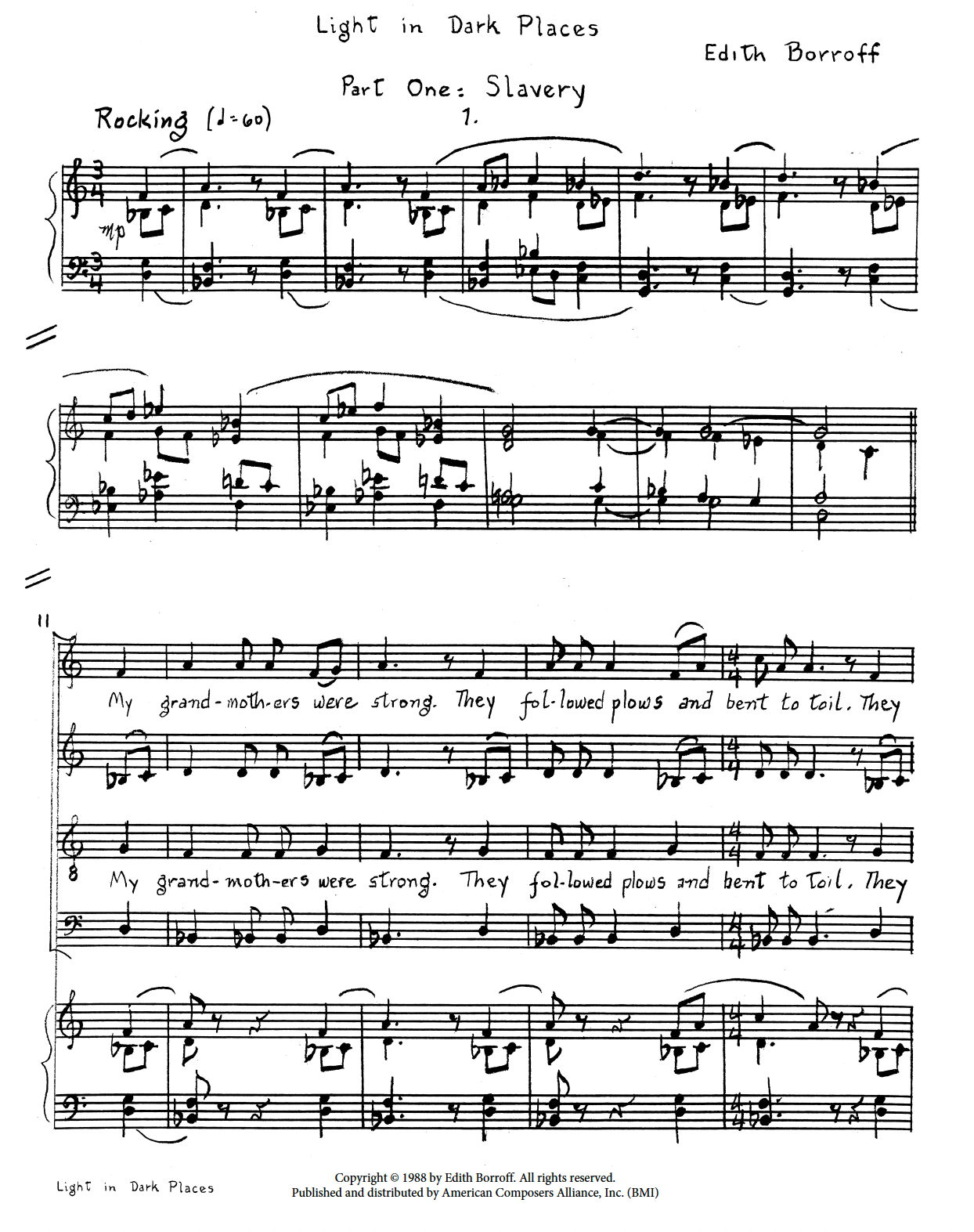 I turned to the past also for the musical basis operandi: to the Black shout and spiritual for part of the material, and to the seventeenth-century concept of "tone" for other parts. "Tone" was a transitional theory that bridged the considerable distance between "mode" and "key." Of course, a composer rethinks such concepts in putting them to use in another era, and although the principle is the same, I used it differently. In brief, it is the concept of tone as materials related to a scale, major or minor, in which the functions inhere as individual tones, without reference to key--notably omitting the defining role of upper and lower dominants. This concept allows for use of the scale materials of a key without the functions of the key. Dissonance is not necessary, though it occurs occasionally by context, and chord progressions can be free and rich. "Tone" also frees the rhythmic life of the work, which I considered basic to the language I wished to create.