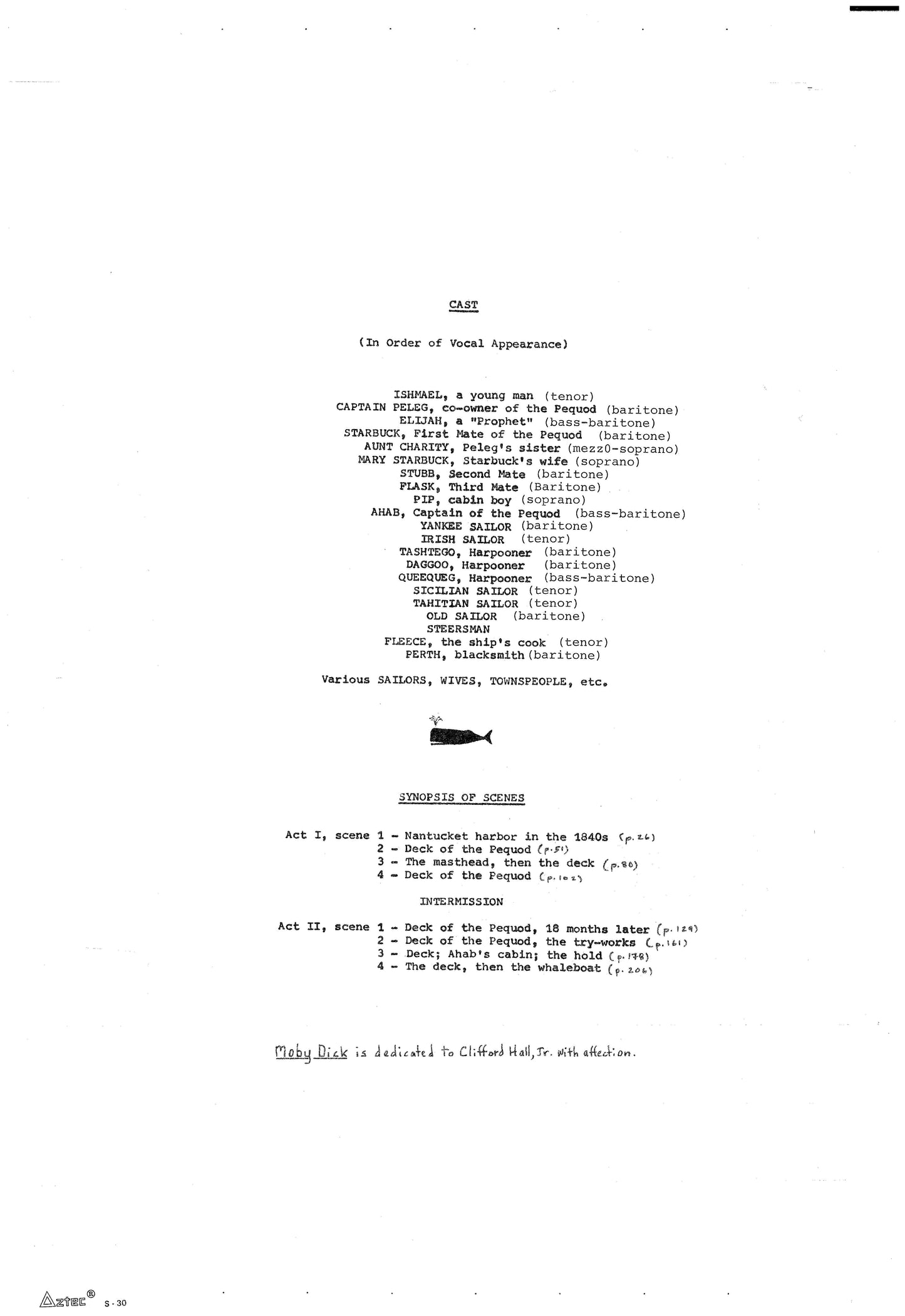 5 lead roles, 15 secondary, male chor, women's chor&orch:pic-2-2-eh-Ebcl-2-bcl- 2-cbsn,4-3-3-1,timp,perc(2 or 3),hp,str