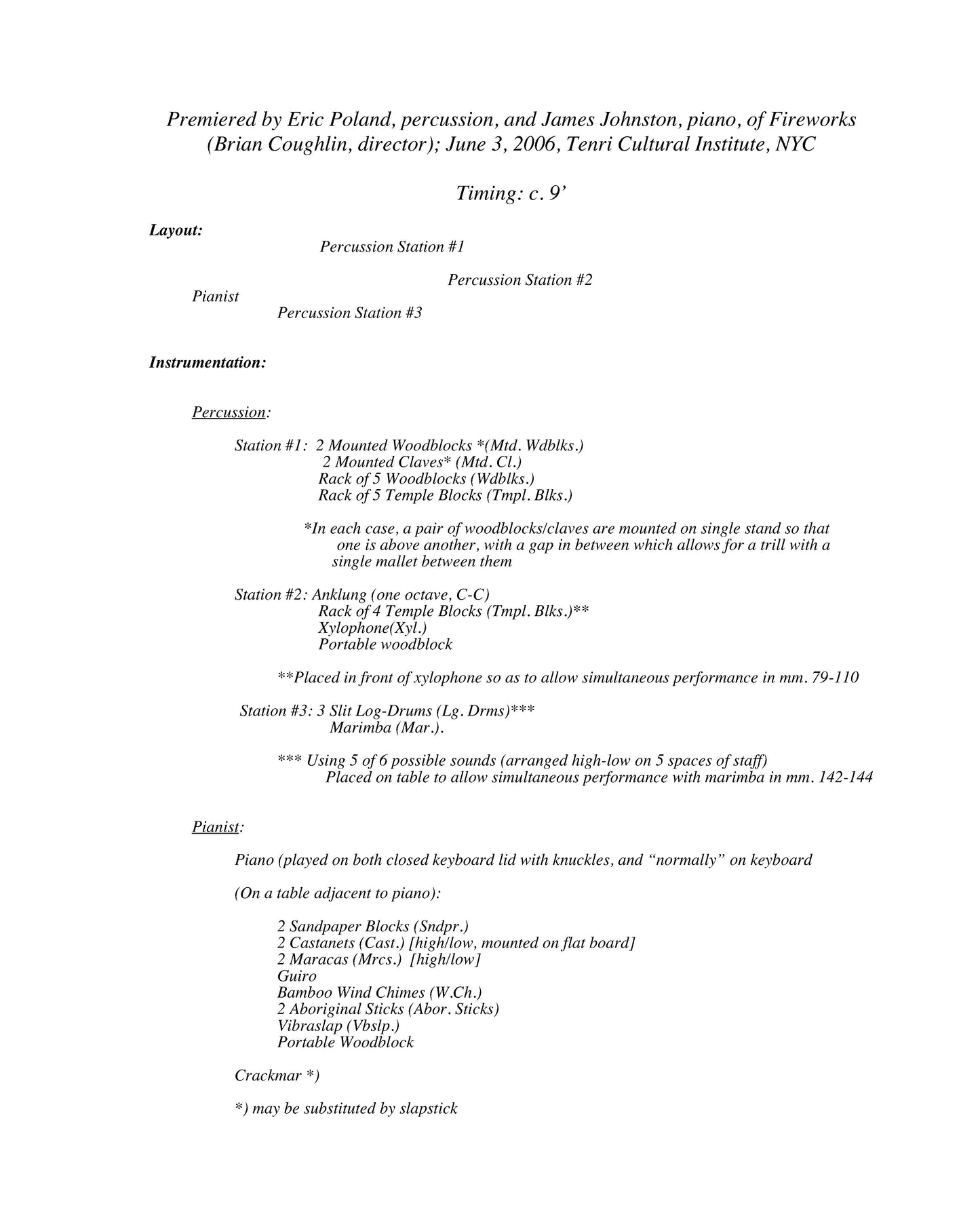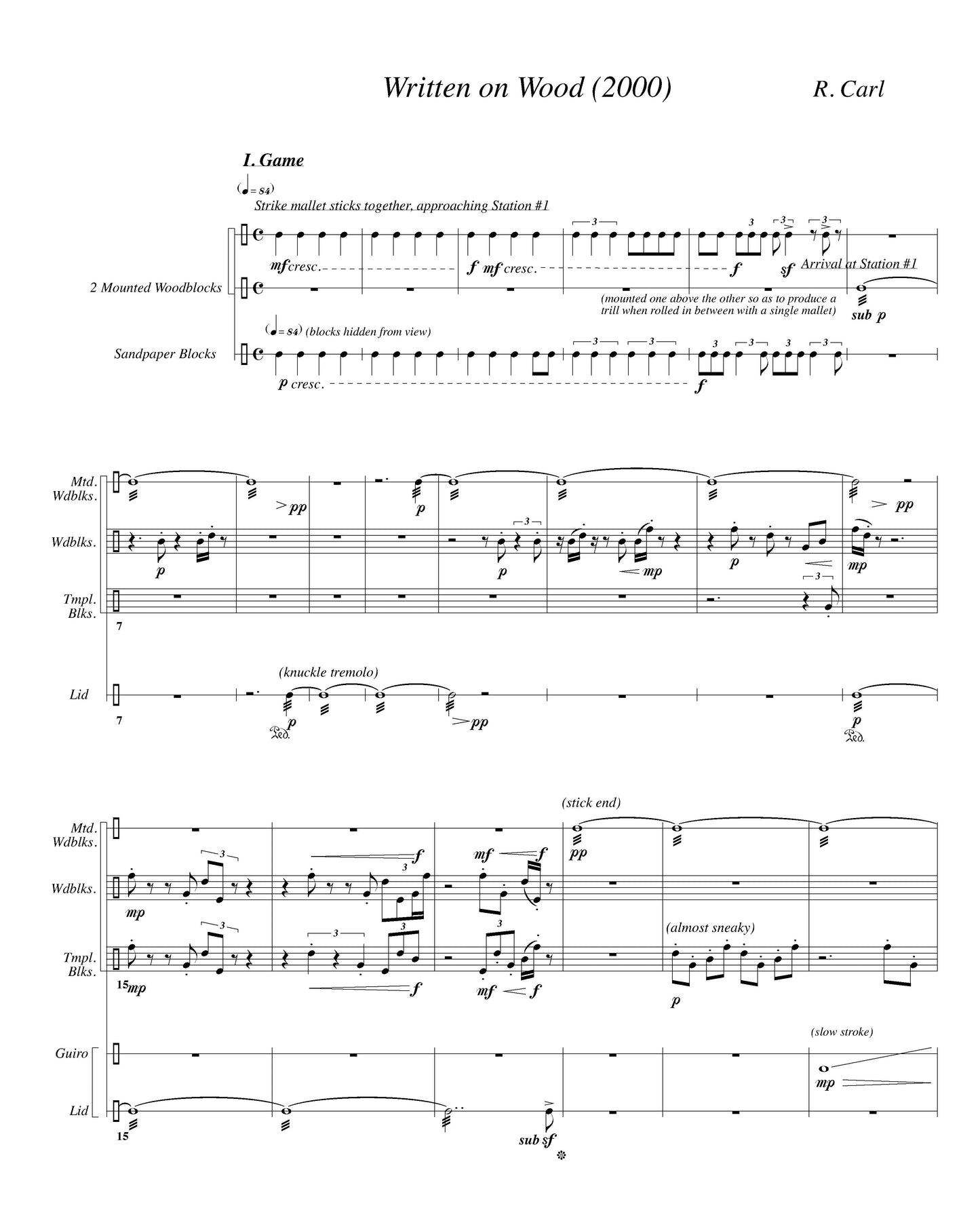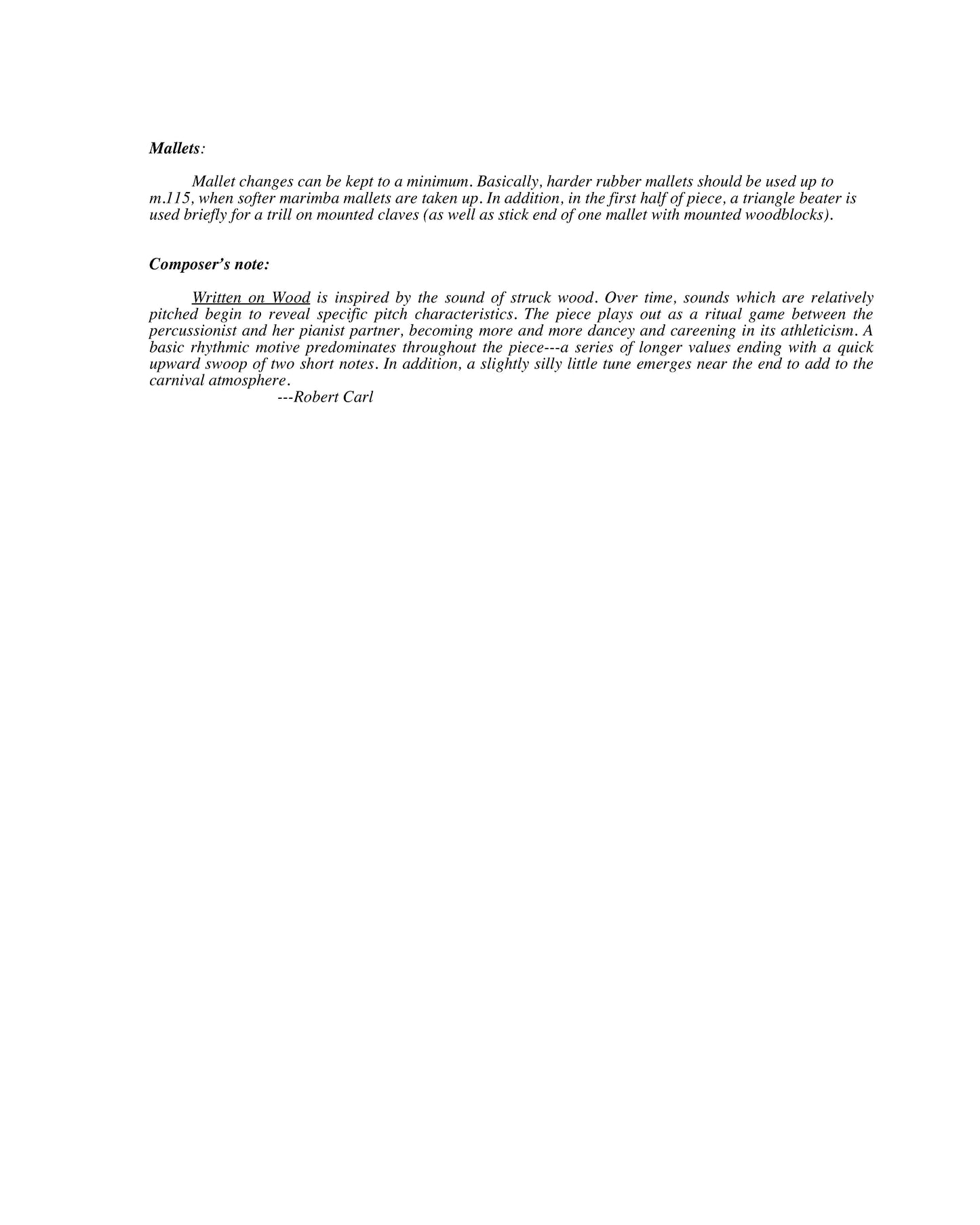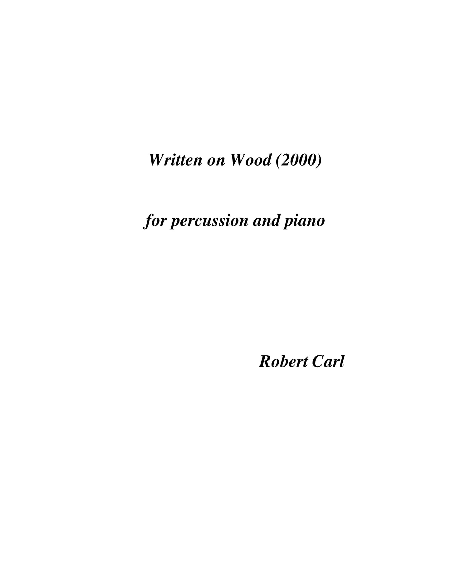 Composer's note:Written on Wood is inspired by the sound of struck wood. Over time, sounds which are relatively pitched begin to reveal specific pitch characteristics. The piece plays out as a ritual game between the percussionist and her pianist partner, becoming more and more dancey and careening in its athleticism. A basic rhythmic motive predominates throughout the piece---a series of longer values ending with a quick upward swoop of two short notes. In addition, a slightly silly little tune emerges near the end to add to the carnival atmosphere.