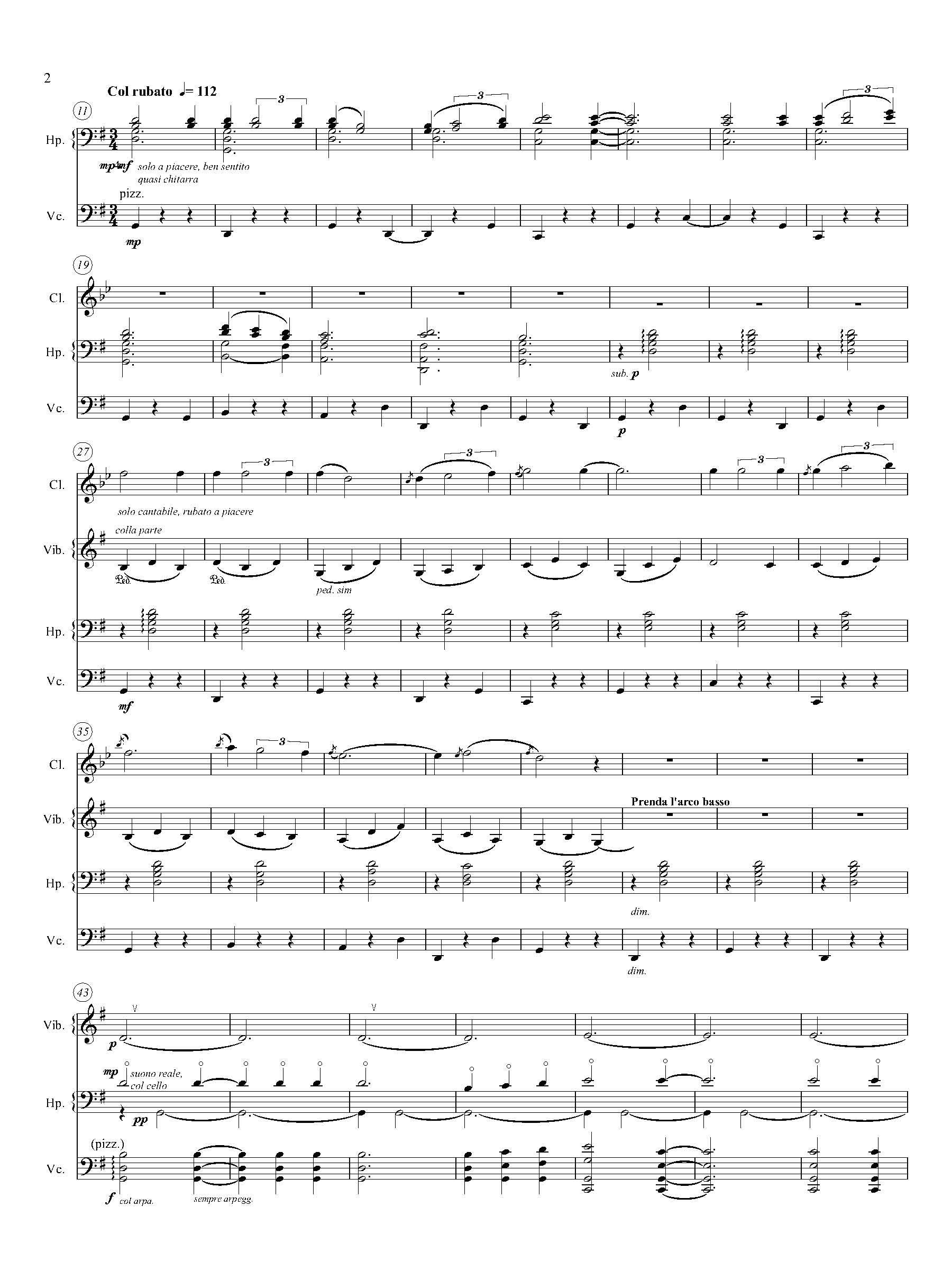 First performance: Friday, December 6th, 2019 at Chiesa Della Nunziatina, Todi, Italy by Natalia Benedetti, clarinet; Fabrizio D'Antonio, vibraphone; Maria Chiara Fiorucci, harp; and Ermanno Vallini, cello