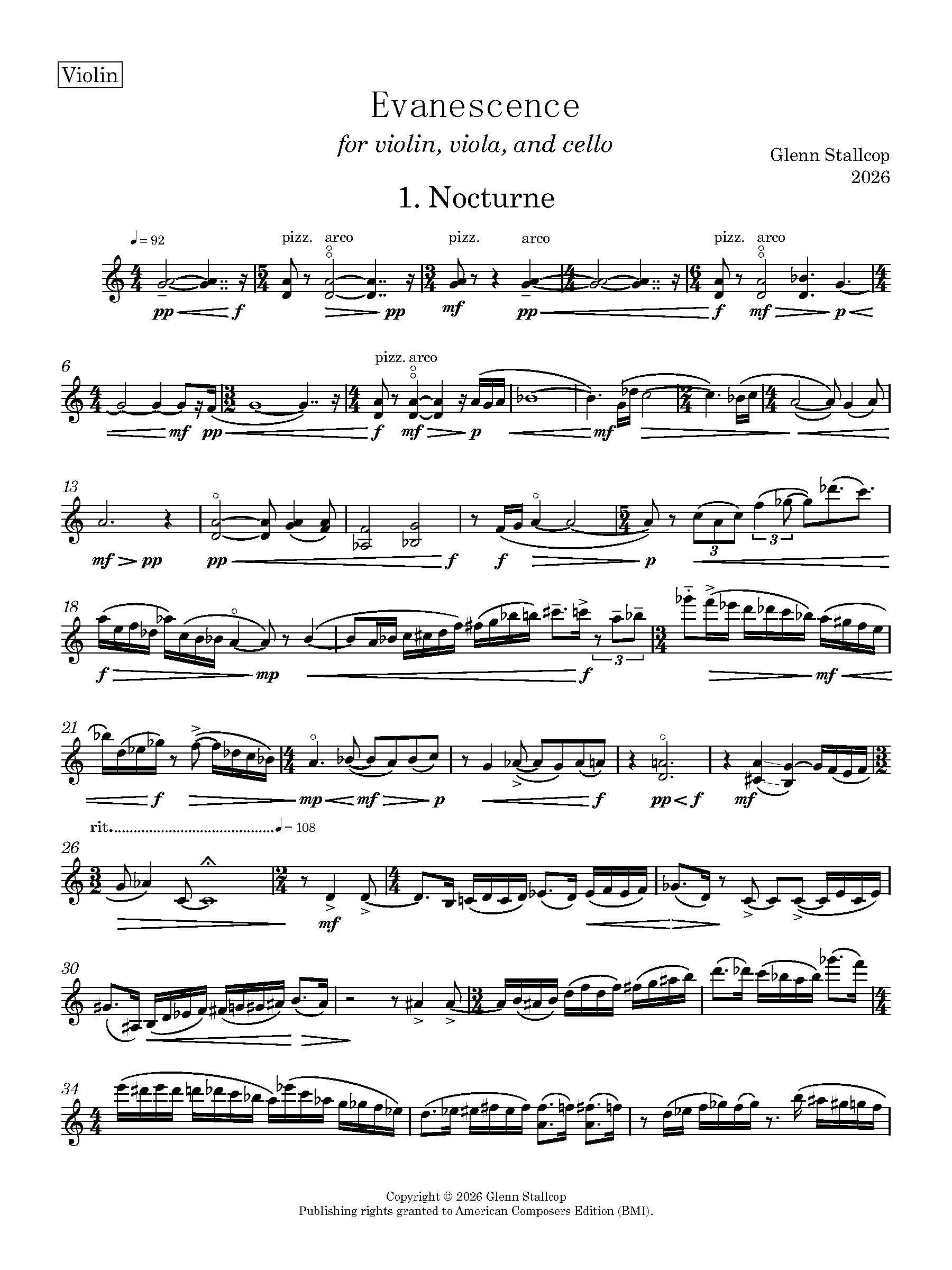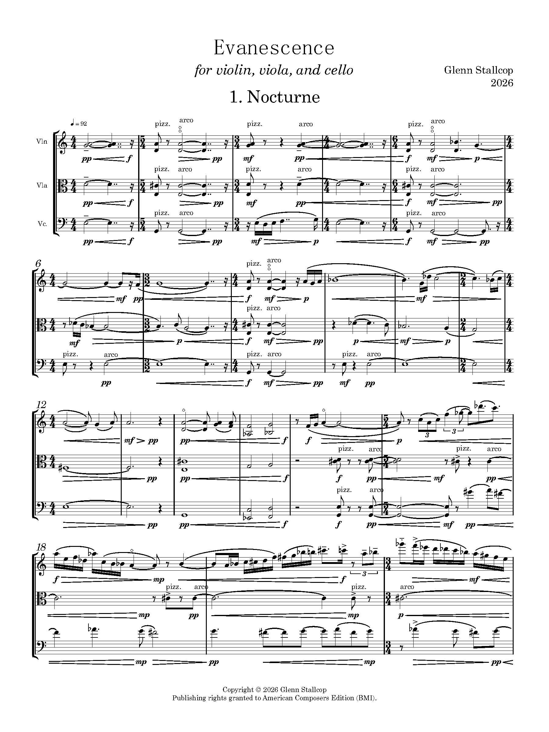 Evanescence (2026), for string trio, addresses the feeling of loss, but it also tries to celebrate that which we understand and cherish, despite its questionable future. The first movement, Nocturne, centers around a gesture which takes a deep breath. The music veers off in other directions but always returns to the breath, like meditation. I think the title refers more symbolically to the sunset of one’s life rather than nightfall, and is about attempting to hold on to that which we have found significant. The second movement, Elegy, is more directly about loss. There is a lot more to eulogize these days than close acquaintances.
