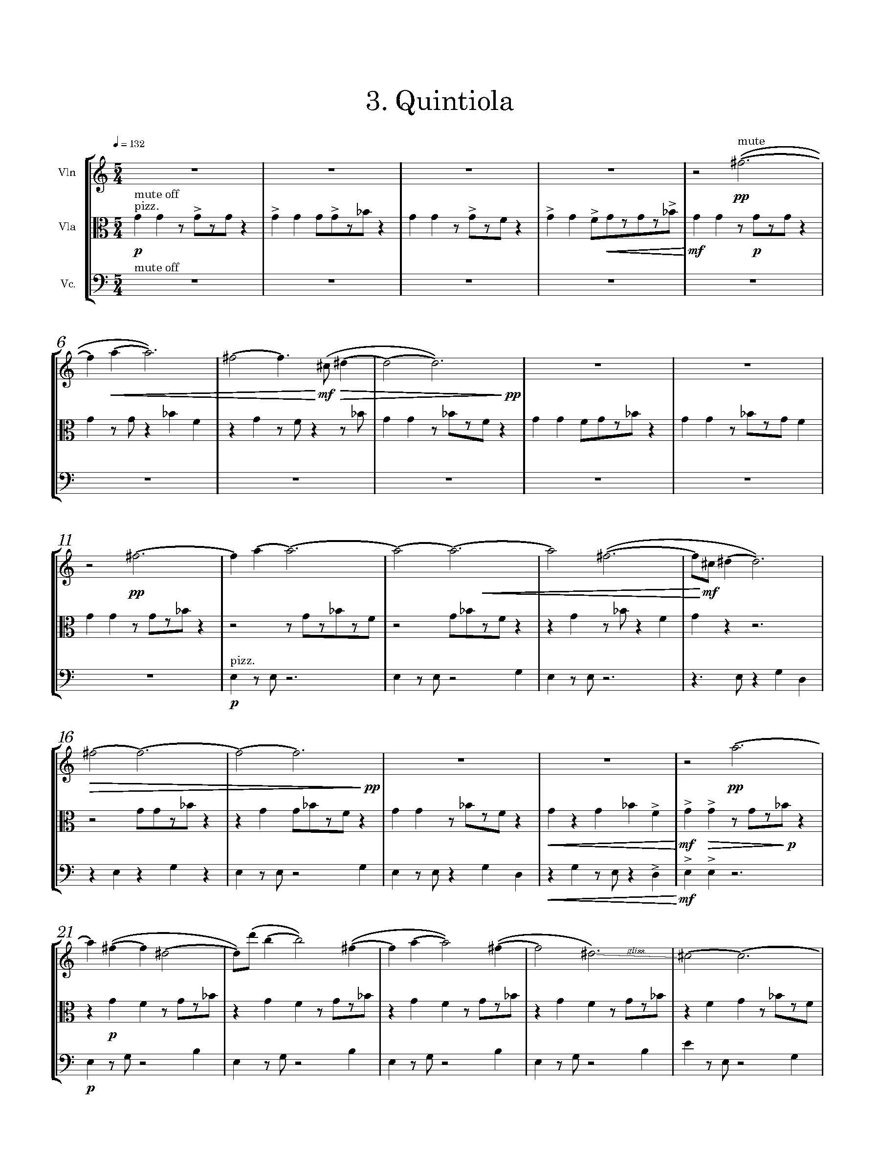 The last movement is more a celebration of now, an immersion in the present. The title “Quintiola” is a made-up variant of “hemiola,” but instead of 3:2, “quintiola” refers to 5:2. The actual musical term for that ratio is dupla sesquialtera, but that seems a bit cumbersome for the name of a movement. The work is a joyous dance, but the 5/4 meter actually gives the piece some breadth and an unusually relaxed atmosphere, despite the activity. The opening starts quietly with the pizzicato viola and cello, while the violin seems rather hung over from the emotional despair of the elegy but gets with the celebration eventually. The opening appears in the middle of the movement arco ponticello in a more light-hearted fashion and then returns triumphantly at the end.
