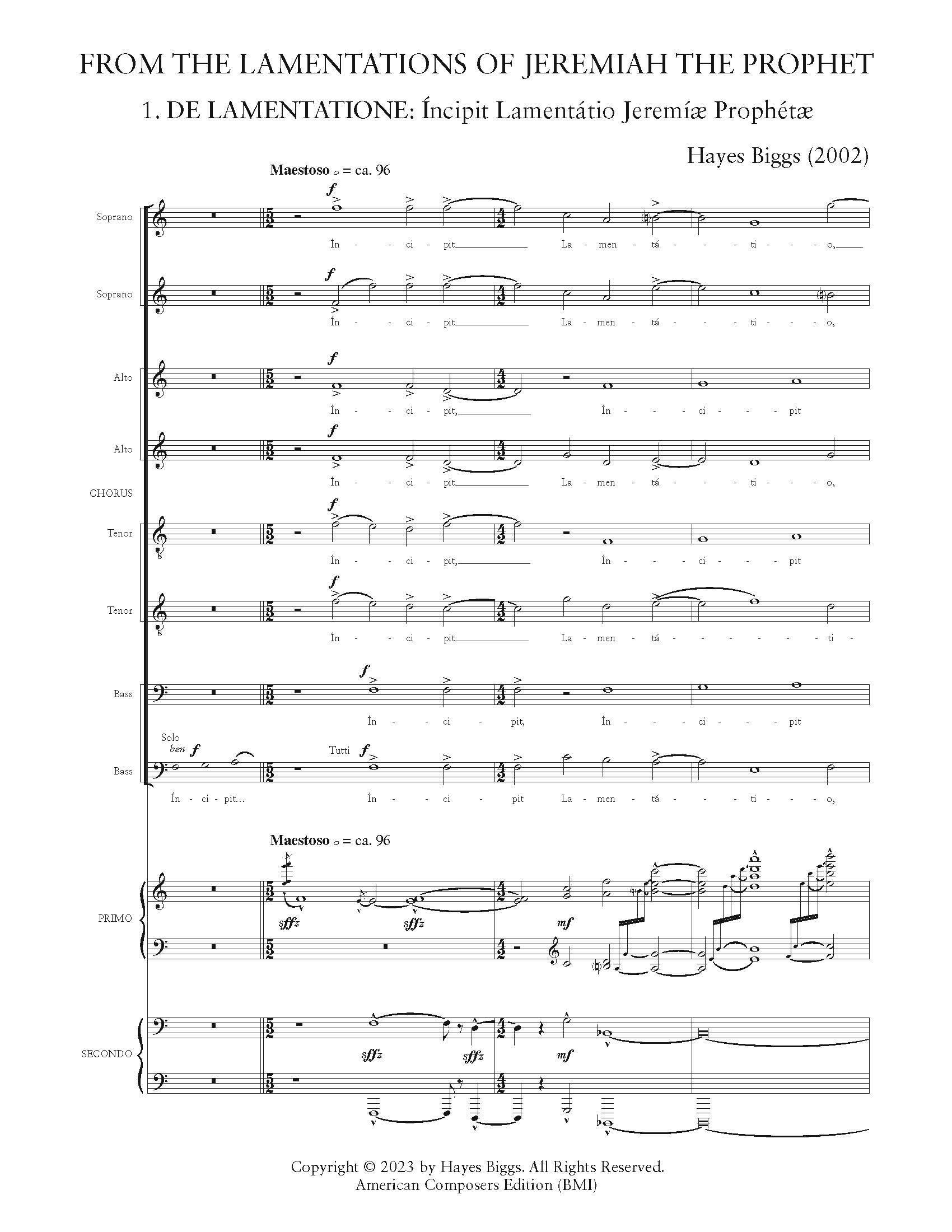My setting begins with the somewhat raucous Íncipit Lamentátio Jeremíæ Prophétæ (“Here begins the Lamentation of Jeremiah the Prophet”). A cantor attempts to begin the chant, but is interrupted by the pianists and double choir, the chant tone being appropriated by the lower voices. The pianists present a brief postlude in three parts: first the basic polychords—that is to say, the sounding of more than one harmony simultaneously—that form a significant part of the musical language of this piece; secondly, a rather pallid version of the traditional plainchant; and, finally, another polychord that will also serve to begin the first verse of the text proper.