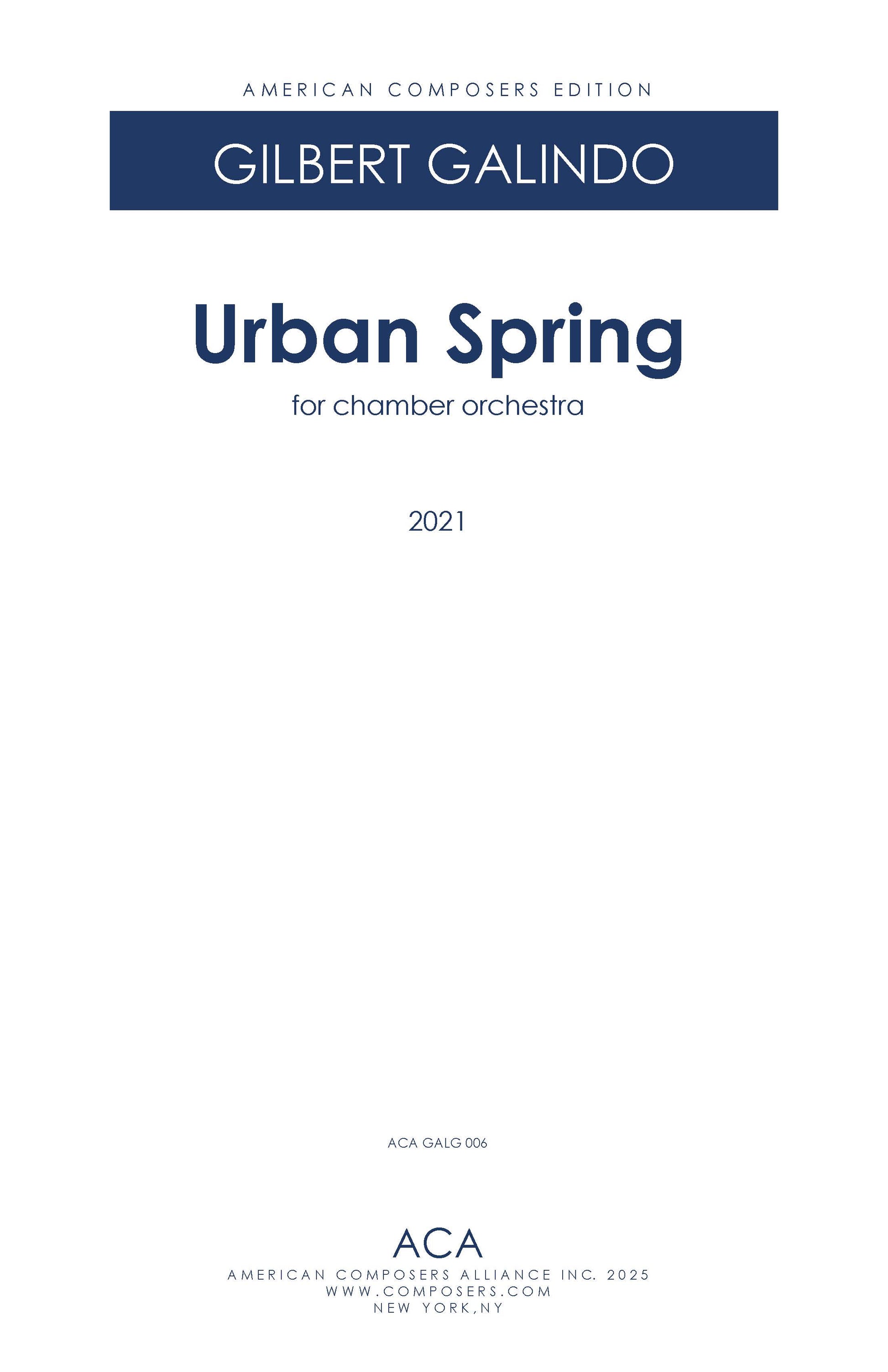 The sentiments are initially expressed as sentimental chords that slowly awaken the imagined city, echoing its loneliness in the trumpet, which triggers more tender moments. Eventually a signal in the timpani boldly declares a change of pace, ushering in greater rhythmic activity - perhaps the city awakening - that takes us to a new arrival. What sort of arrival? Well, in life after the pandemic, that's really up to us, isn't it? And that's also where the piece itself becomes less programmatic and the musical muse takes over. "Urban Spring" was commissioned by the Queer Urban Orchestra in celebration of pride 2021 with great gratitude.