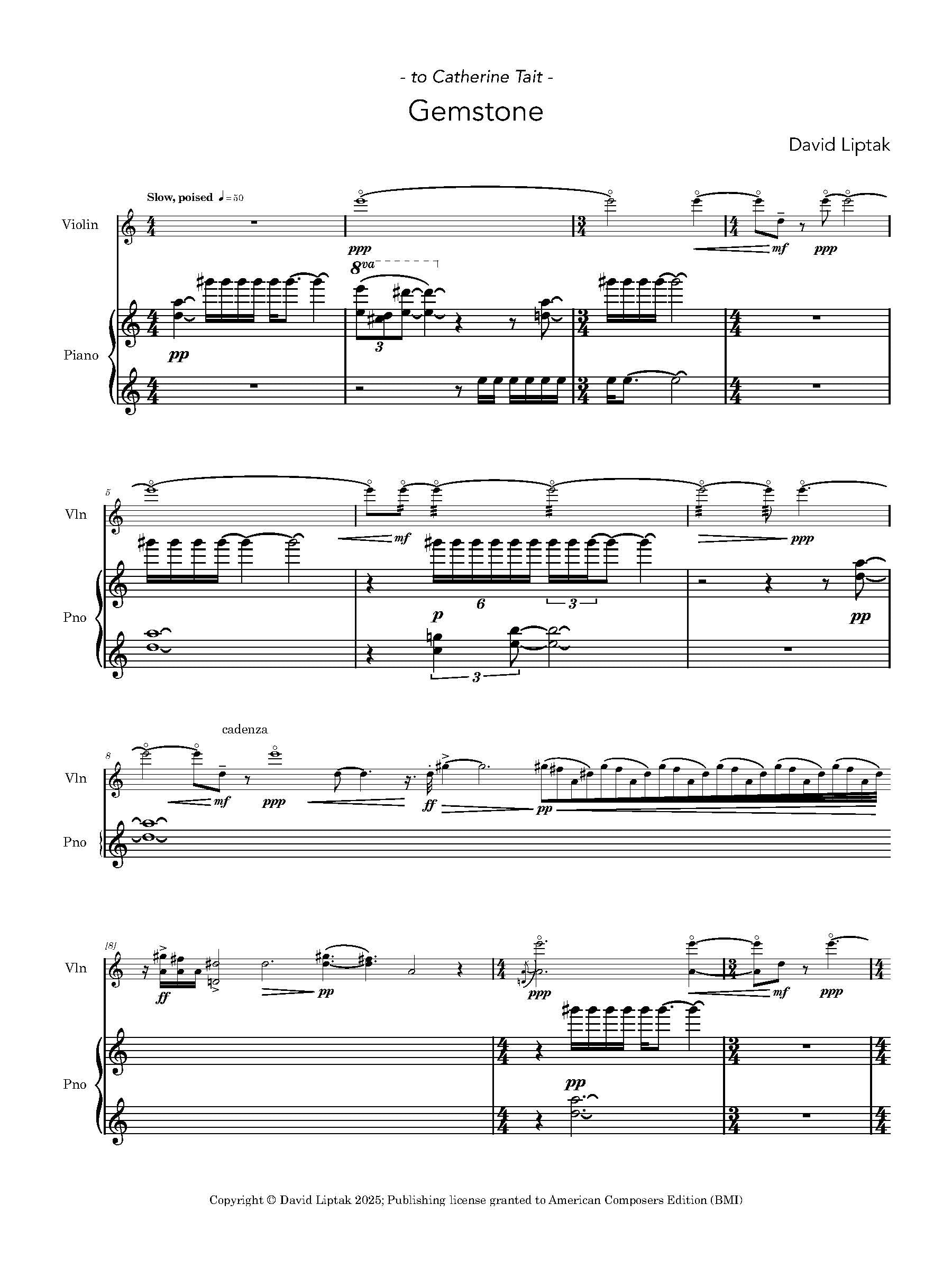 Gemstone was written for violinist Catherine Tait, and together we gave the premiere performance in the summer of 1979. Catherine performed the piece numerous times thereafter, often with pianist Anne Epperson. This was happening during a time of much change in our lives and work. Catherine and I married in 1980, moved twice to our new faculty positions at Illinois and Eastman, and endured the years of the illness that preceded her death at the age of 44. The piece - Gemstone - had been packed away during one of the moves, its pride of place taken by later and what I then thought of as more worthy efforts. Or perhaps it was just too personal for either of us. Now, unexpectedly, it appeared. A sealed box was opened, and there it was.