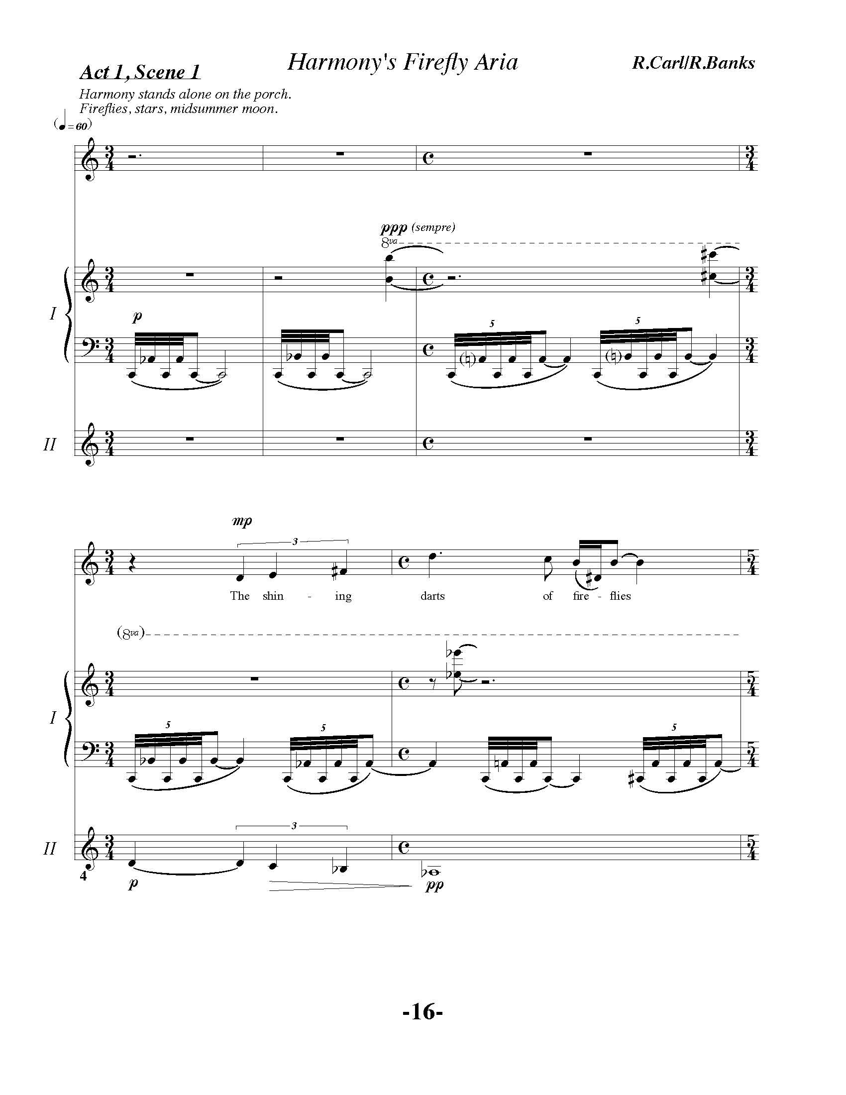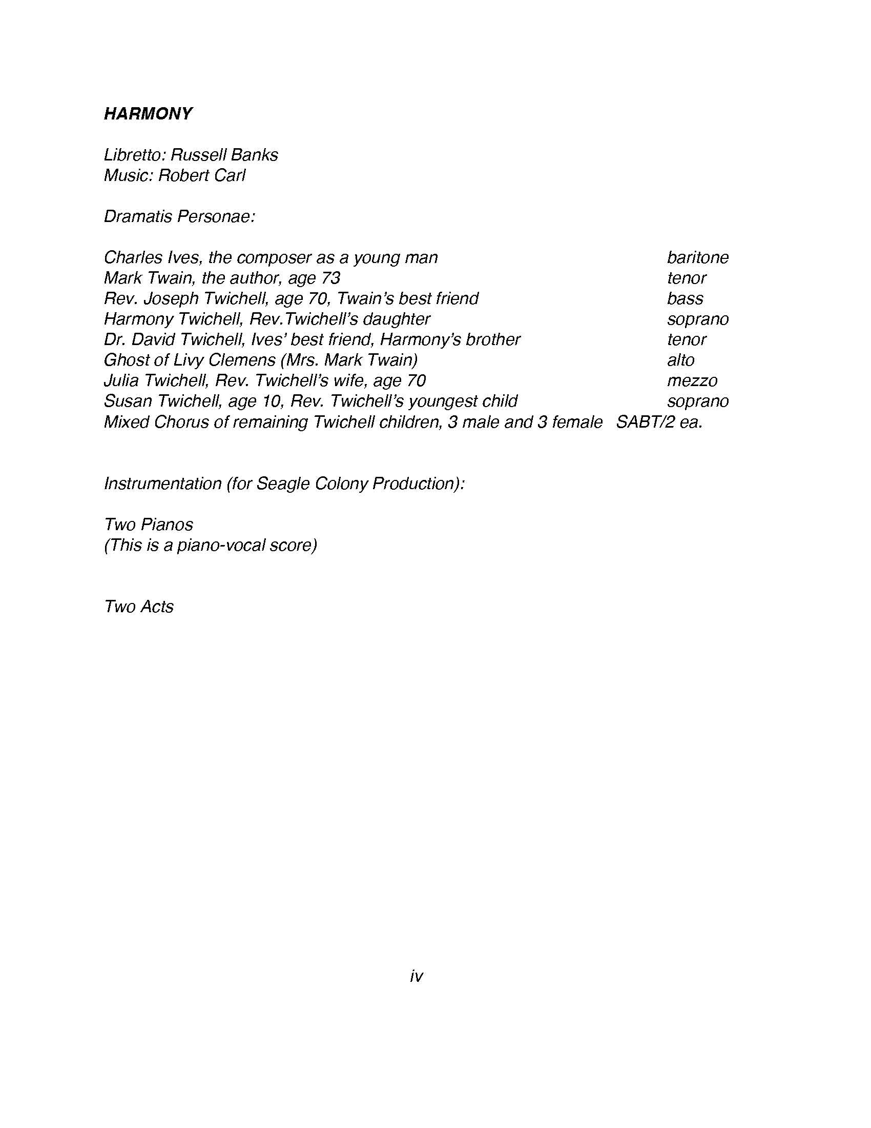 The opera, Harmony, with music by Robert Carl and libretto by Russell Banks, was premiered at the Seagle Festival in August 2021.
