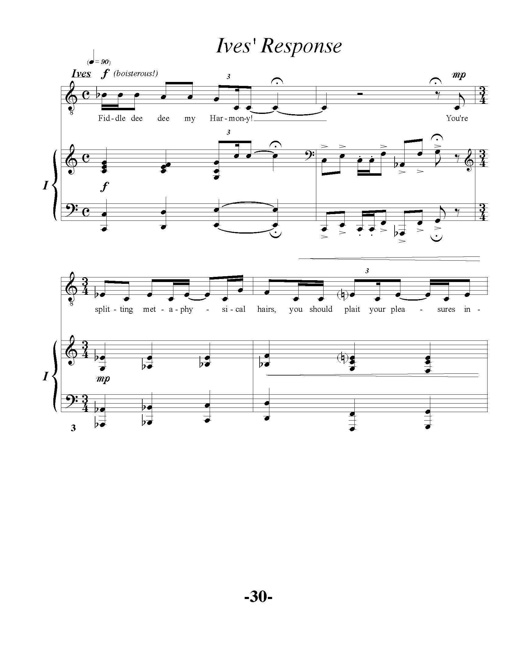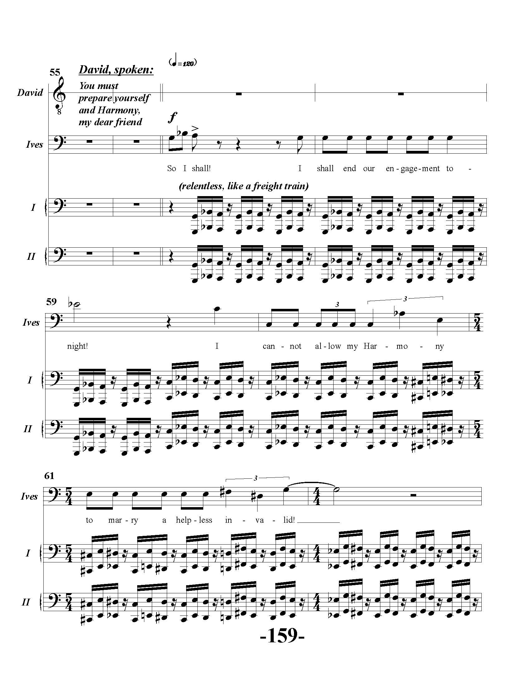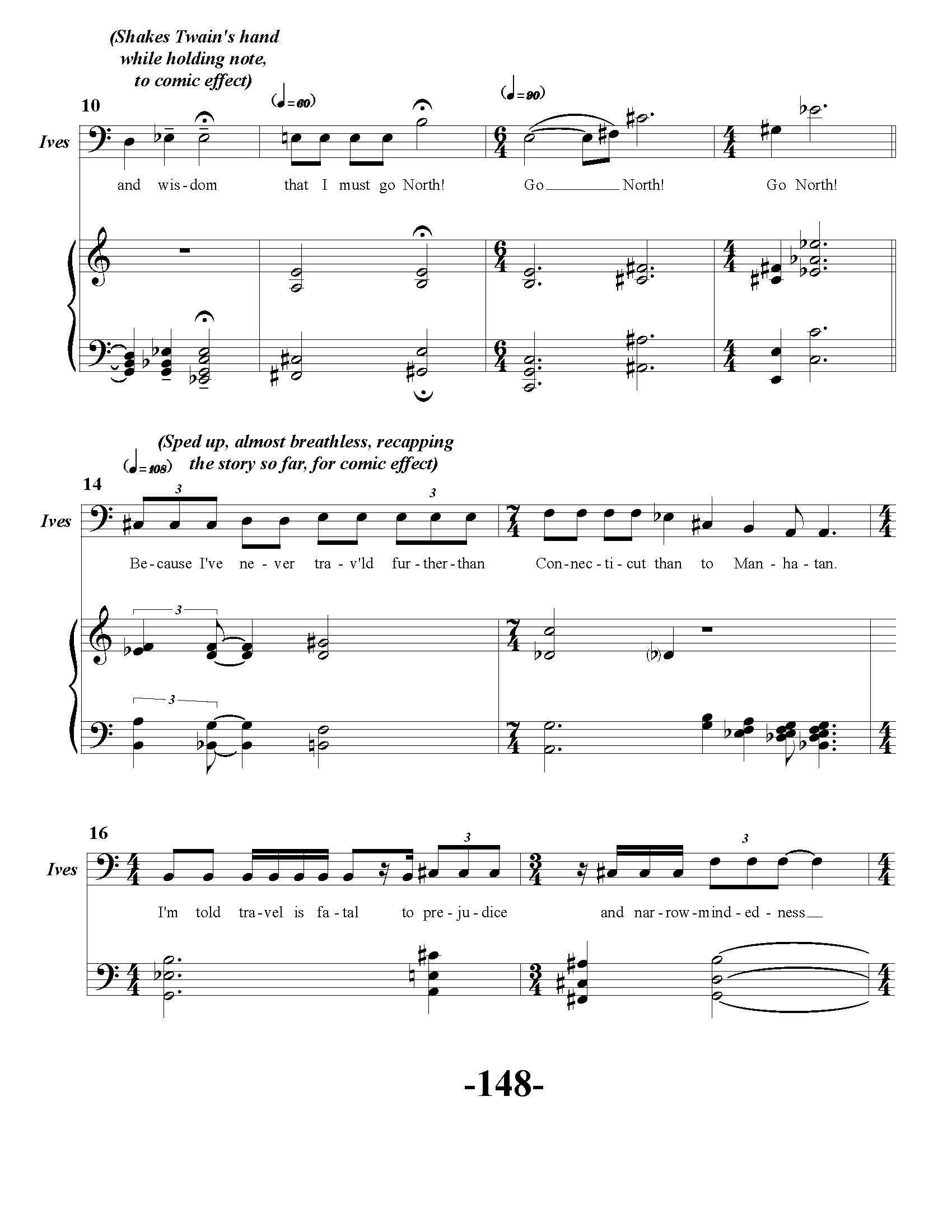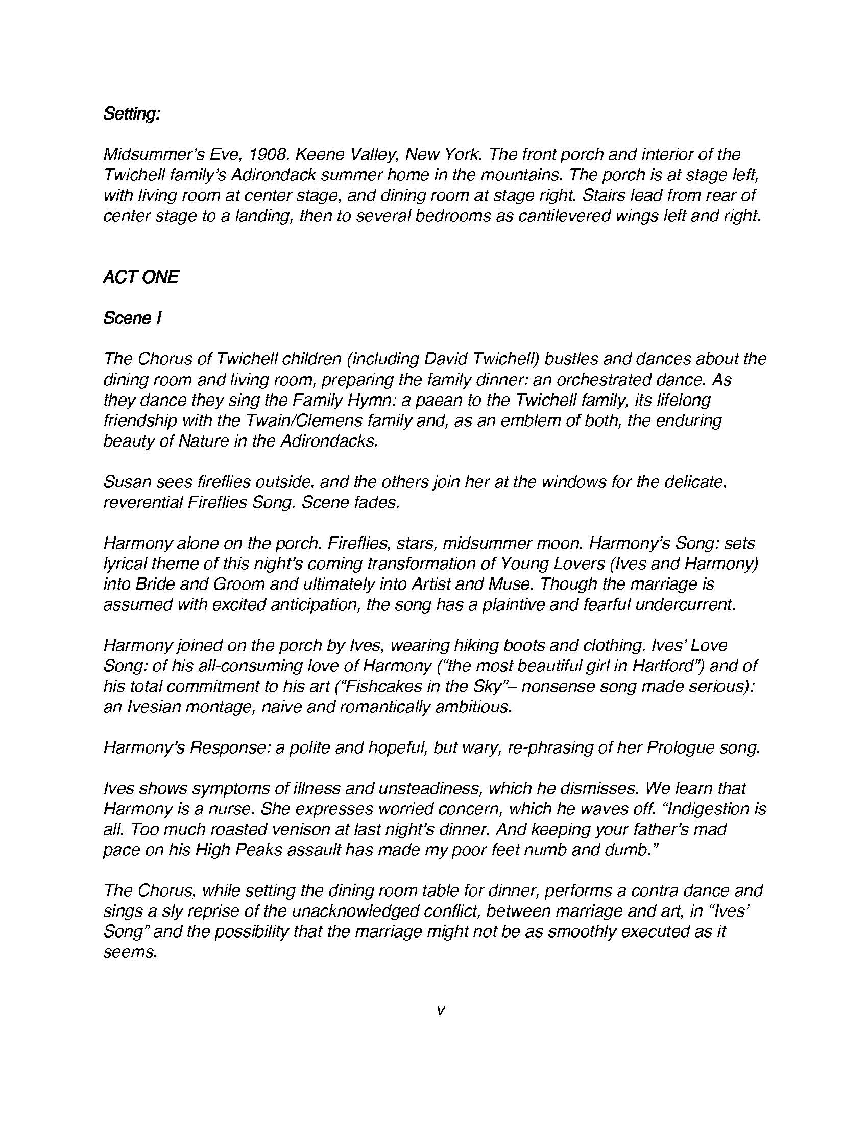The opera unfolds over one Adirondack night in 1908, on the eve of the betrothal of the composer Charles Ives to Harmony Twichell. But her godfather Mark Twain, the best friend of her father Joseph, is dismayed by the naive happiness of the couple and seeks to complicate the relationship. A romantic comedy of errors ensues on the way to reconciliation and lasting love.