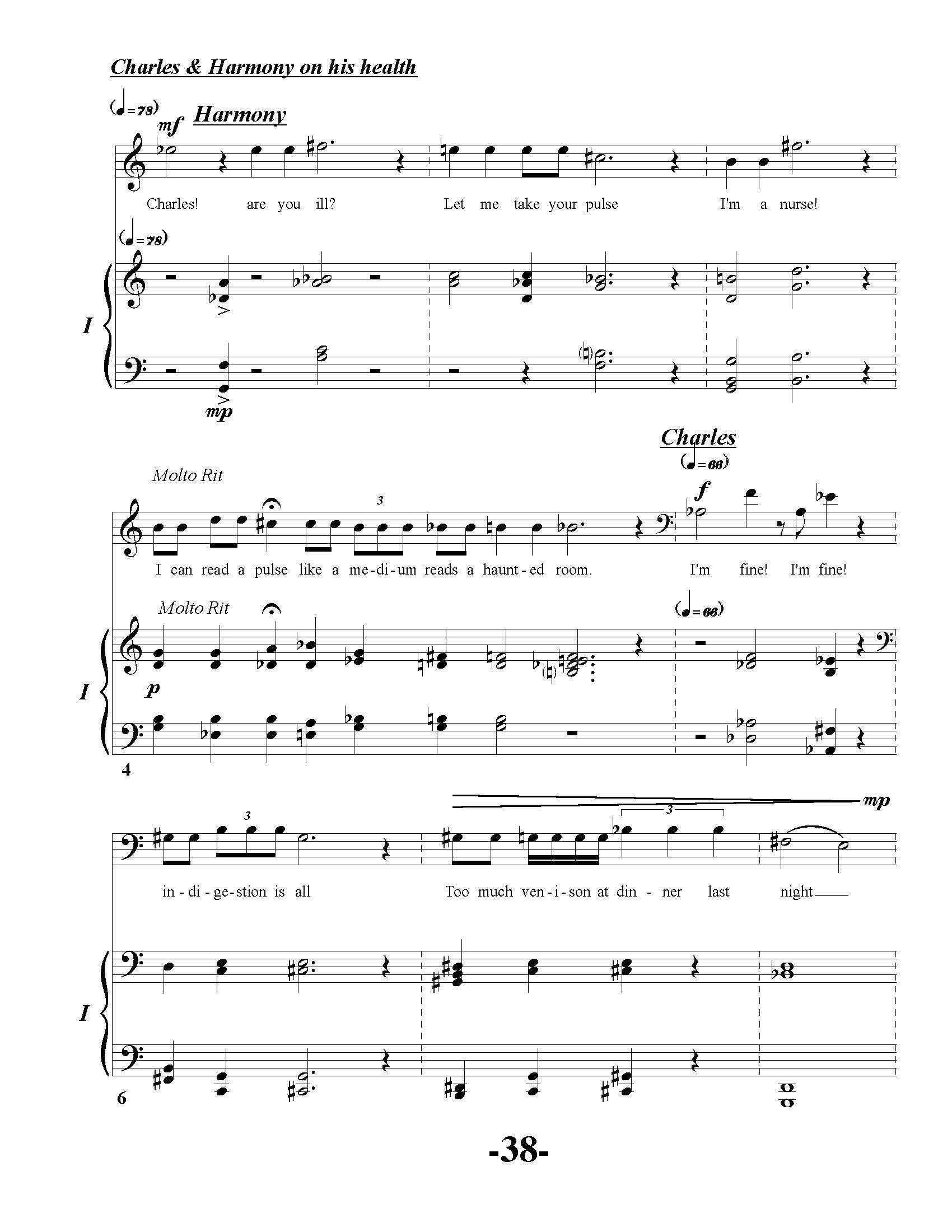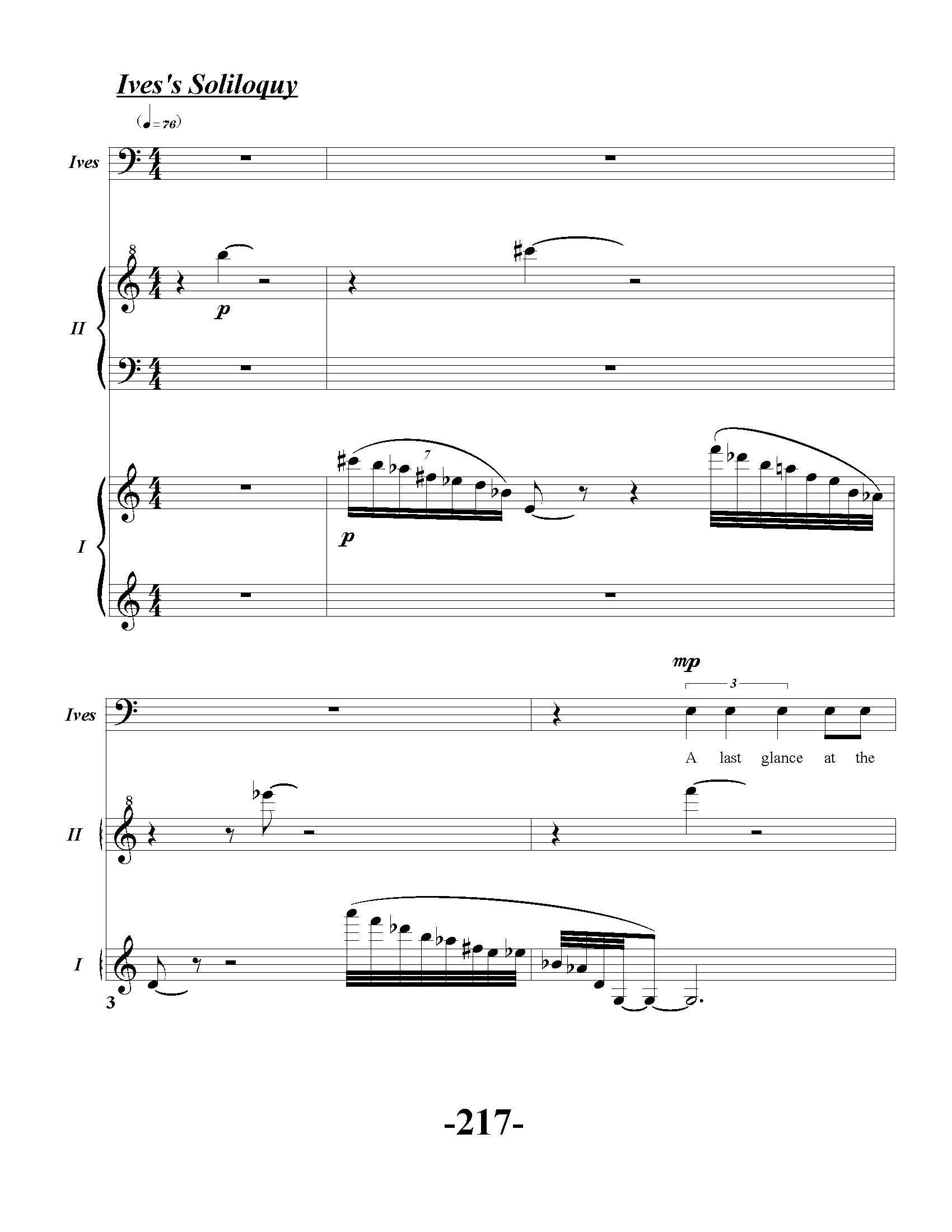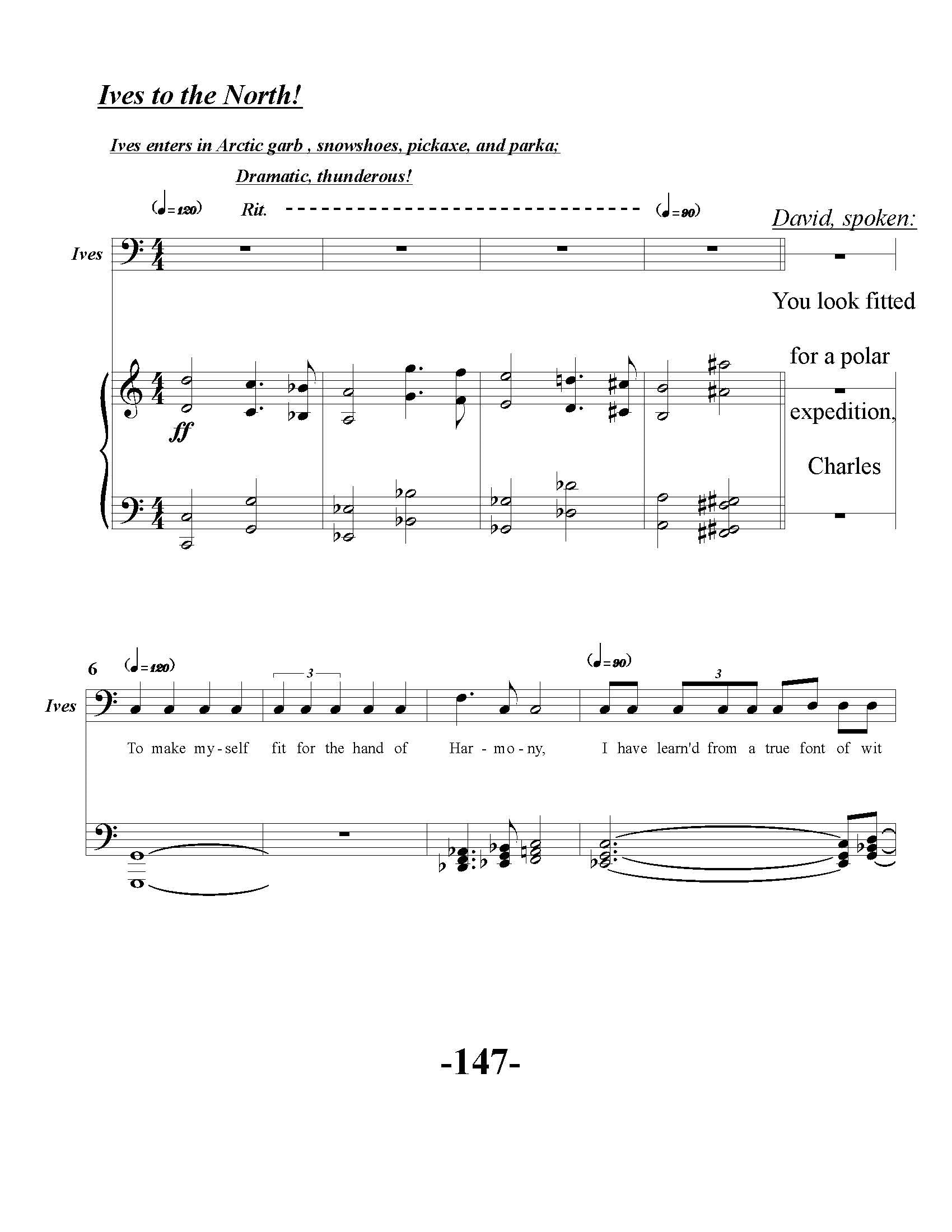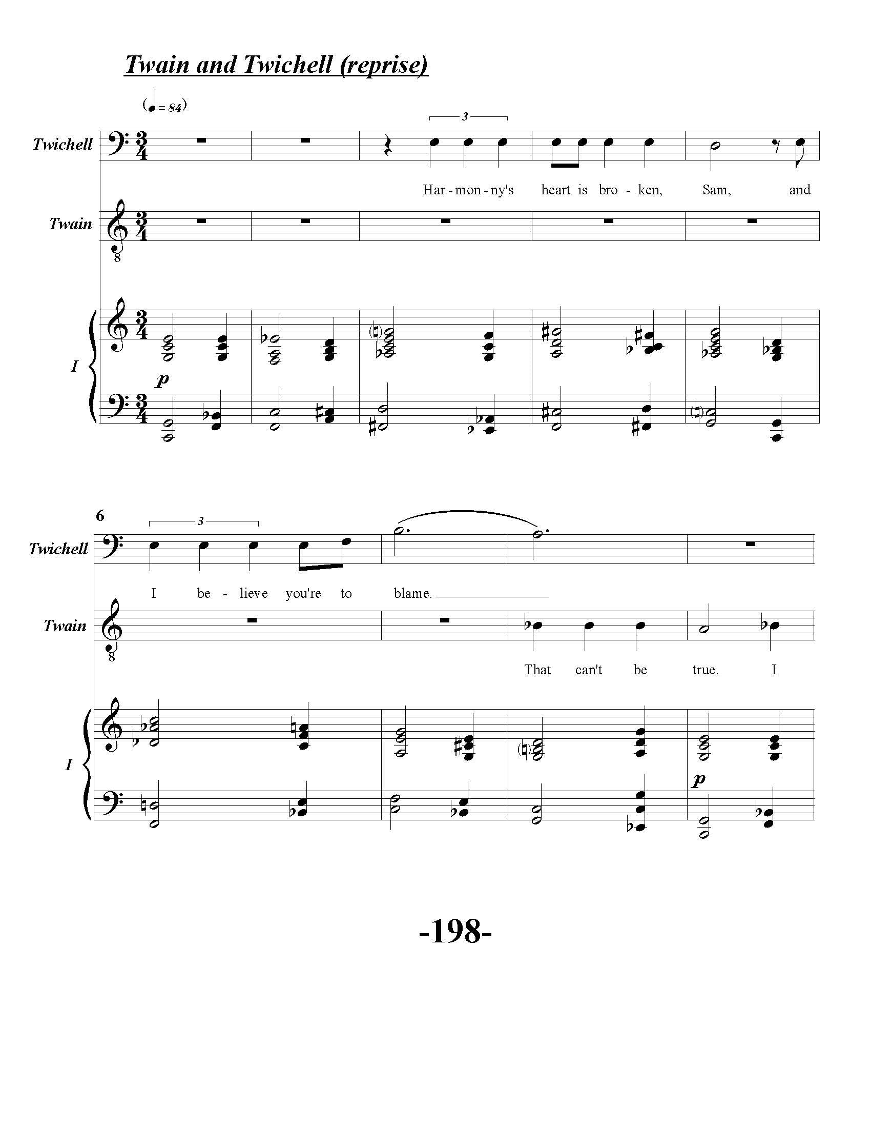 The opera unfolds over one Adirondack night in 1908, on the eve of the betrothal of the composer Charles Ives to Harmony Twichell. But her godfather Mark Twain, the best friend of her father Joseph, is dismayed by the naive happiness of the couple and seeks to complicate the relationship. A romantic comedy of errors ensues on the way to reconciliation and lasting love.