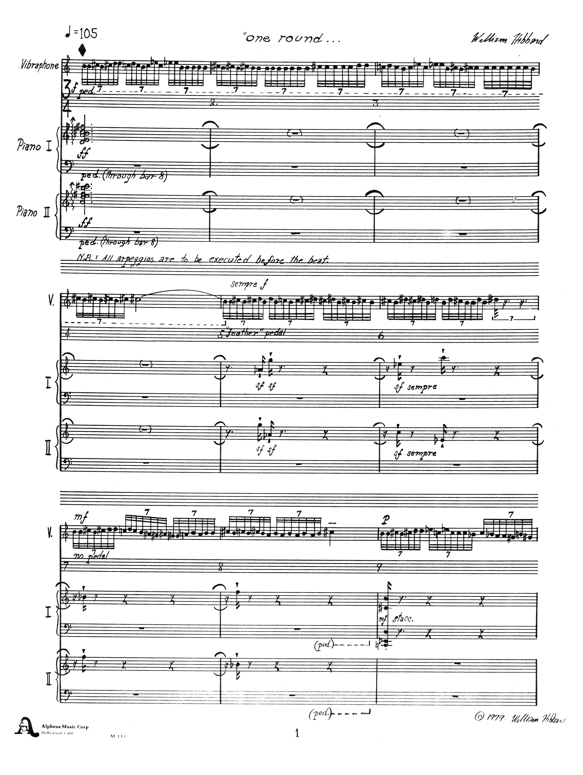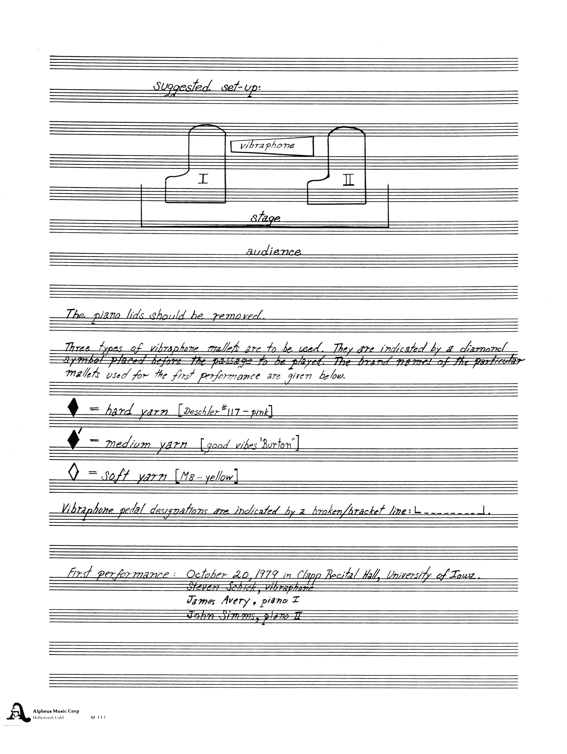 First performance: October 20, 1979 Clapp Recital Hall, University of Iowa. Steven Schick, vibraphone; James Avery, piano I; John Simms, piano II.