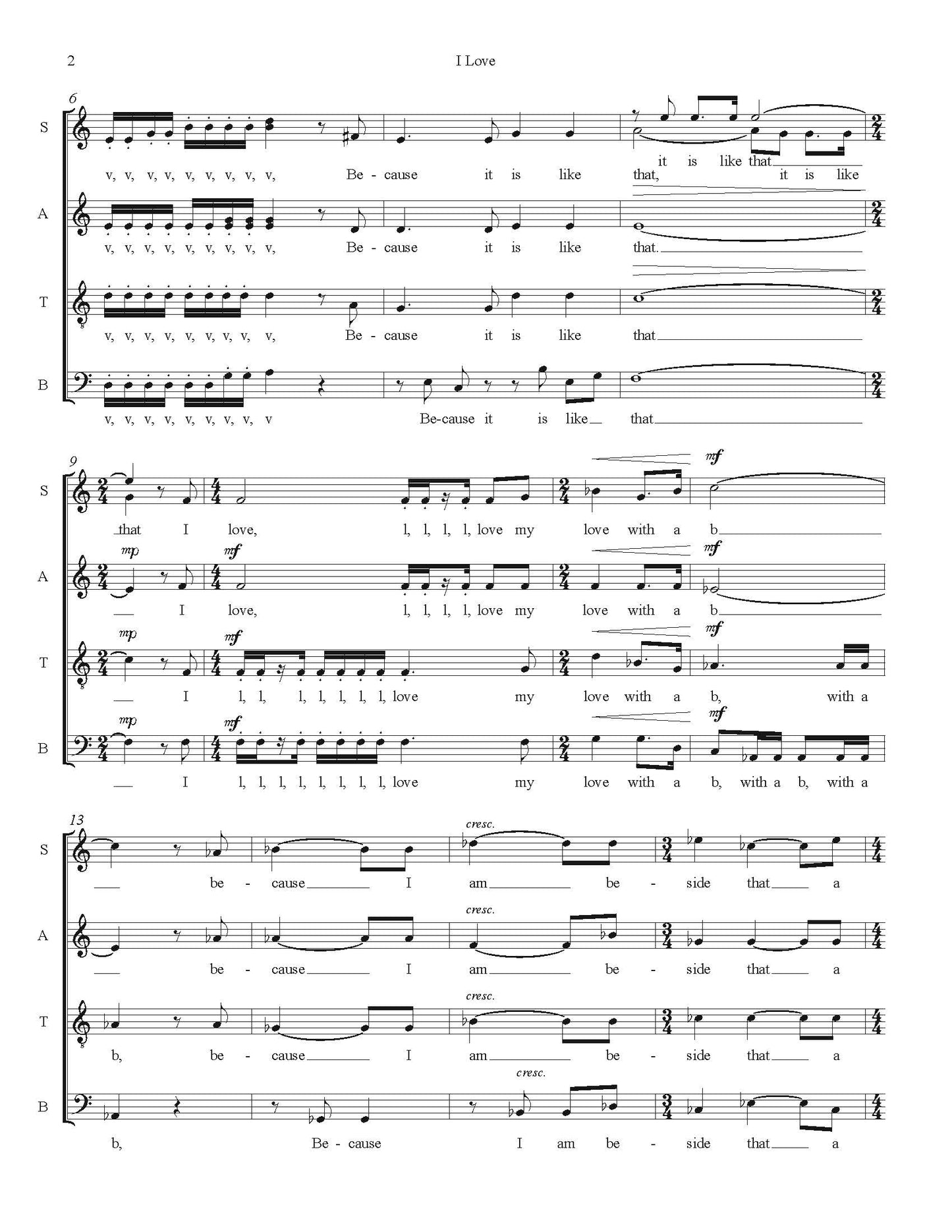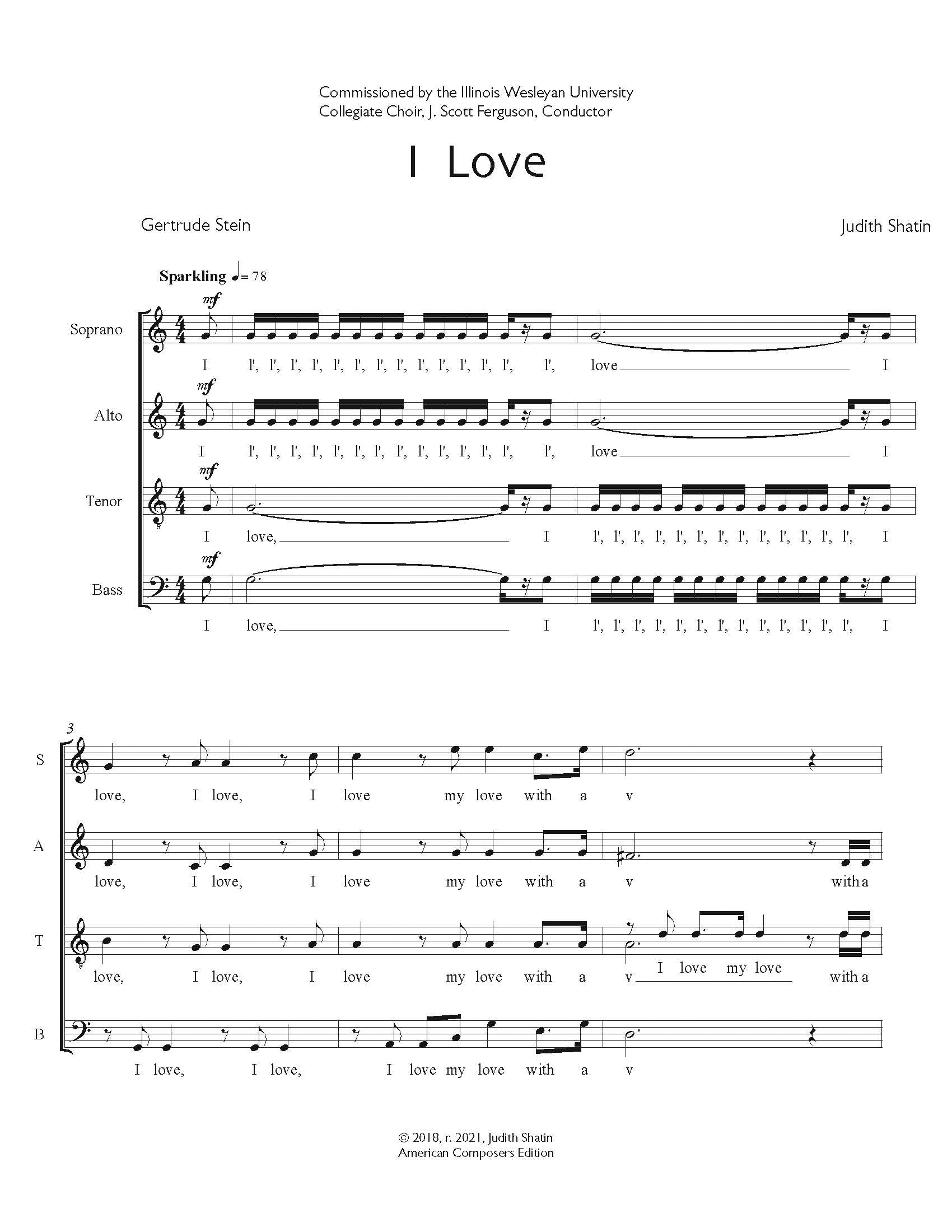 I Love is a setting of verse XXIX of the thirty in Gertrude Stein’s poem Before the Flowers of Friendship Faded Friendship Faded. Stein’s extended poem was inspired by Enfances , a poem by Georges Hugnet. Originally conceived as a translation of Hugnet’s poem, the transformation into her own piece led to a break in their friendship.  What drew me to this particular verse, quoted below in full, is its charming whimsy, its sudden twists and its linguistic and syntactic play. It is used by permission granted by the Estate of Gertrude Stein, through its Literary Executor, Mr. Stanford Gann, Jr. of Levin & Gann, P.A.  I Love was commissioned by the Illinois Wesleyan University Collegiate Choir, J. Scott Ferguson, conductor, and is dedicated to them. It was made possible by the Sylvia Monti Anderson Commissioned Choral Work Fund honoring Delta Omicron at Illinois Wesleyan University.