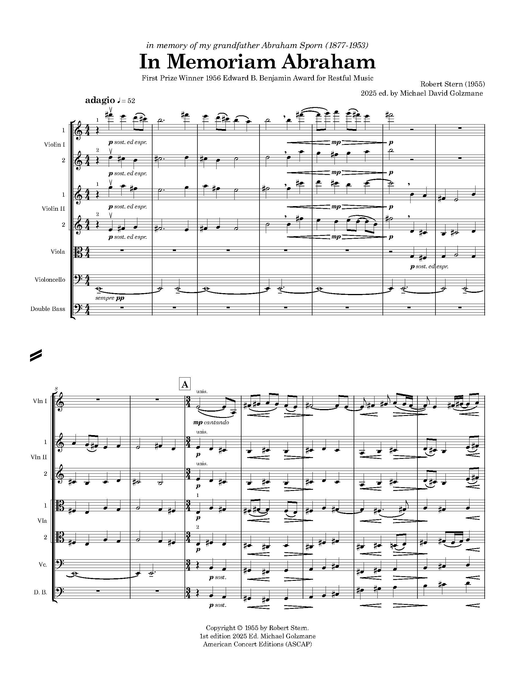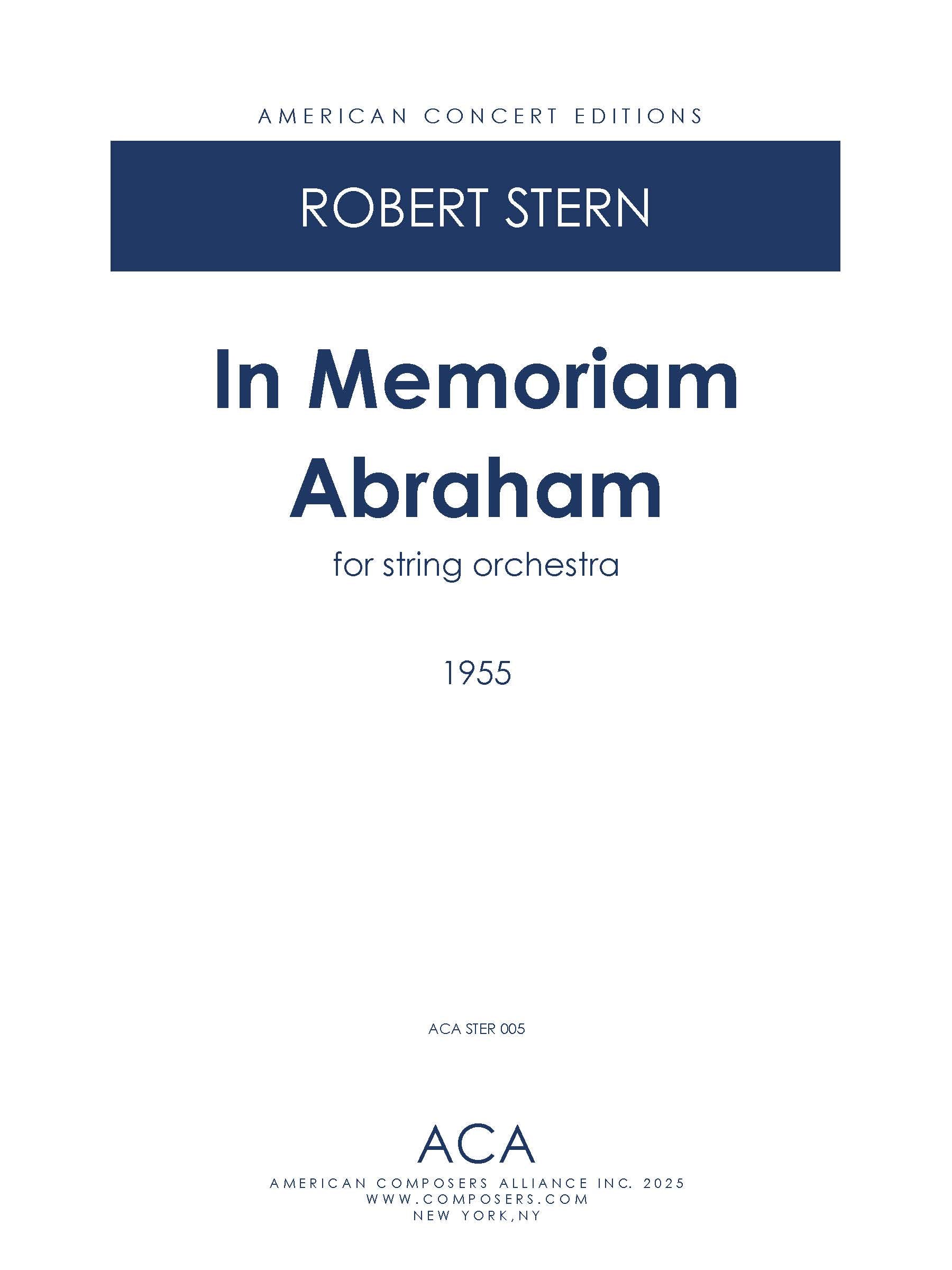 In Memoriam Abraham was composed in 1955 by Robert Stern while he was a student at the Eastman School of Music, studying composition with Bernard Rogers. The work is an elegy for string orchestra written in honor of the composer’s maternal grandfather, whose life and character left a lasting impression on him. Stern’s music from this period reveals an early affinity for seamless, lyrical line and clear contrapuntal texture—qualities that define the quiet eloquence of this work.