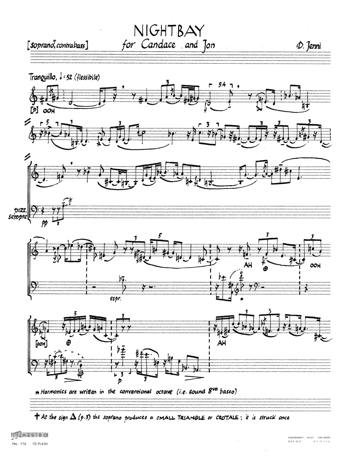 Composed for Candace Natvig and Jon English, during their sojourn in Amsterdam as a new music duo called Muziek Nu. Begun at Long Hill 8.VIII.75, completed 10.XI.75 at Fürli (Seelisberg CH) and performed in Utrecht the following month (14 November 1975). "Texted"_x009d_ impressionistically, with vowel timbres and interrupted fragments: "would I go in green,"_x009d_ "hard by the la[GOON] when new [A]gain to you,"_x009d_ "we Thee ever Thy beau[TY],"_x009d_ "rangi kamanye kunde nyeusitunda kama zambara u, wakati wafua kali"¦ umeme wa"¦upande"_x009d_ [Swahili, various fruits and vegetables], "when I"¦"_x009d_ "per desertum quadraginta a[NNI]"¦aut in quo contristavi te,"_x009d_ "would I de[PART]."_x009d_ Revised, Iowa City (September 1978) and performed by the CNM, Hibbard conducting(!).