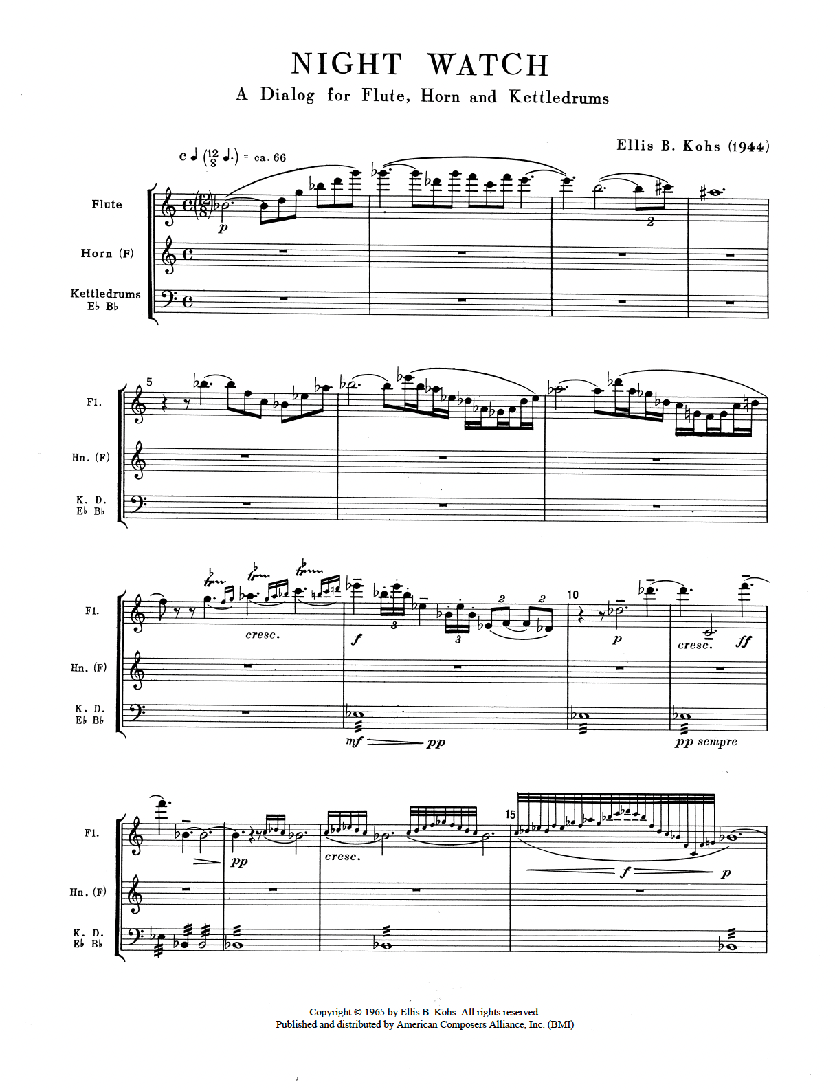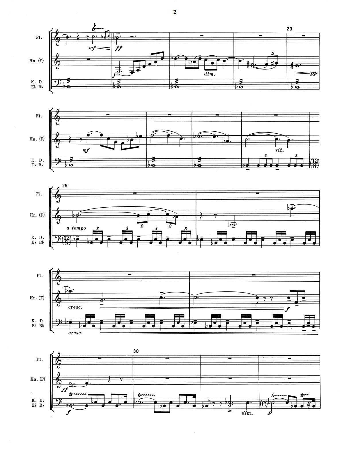 A single-movement work showing the best aspects of the three instruments. The flute and horn begin with their respective animal calls - birds and frogs - with an underlying beat in the timpani, before a full trio develops.