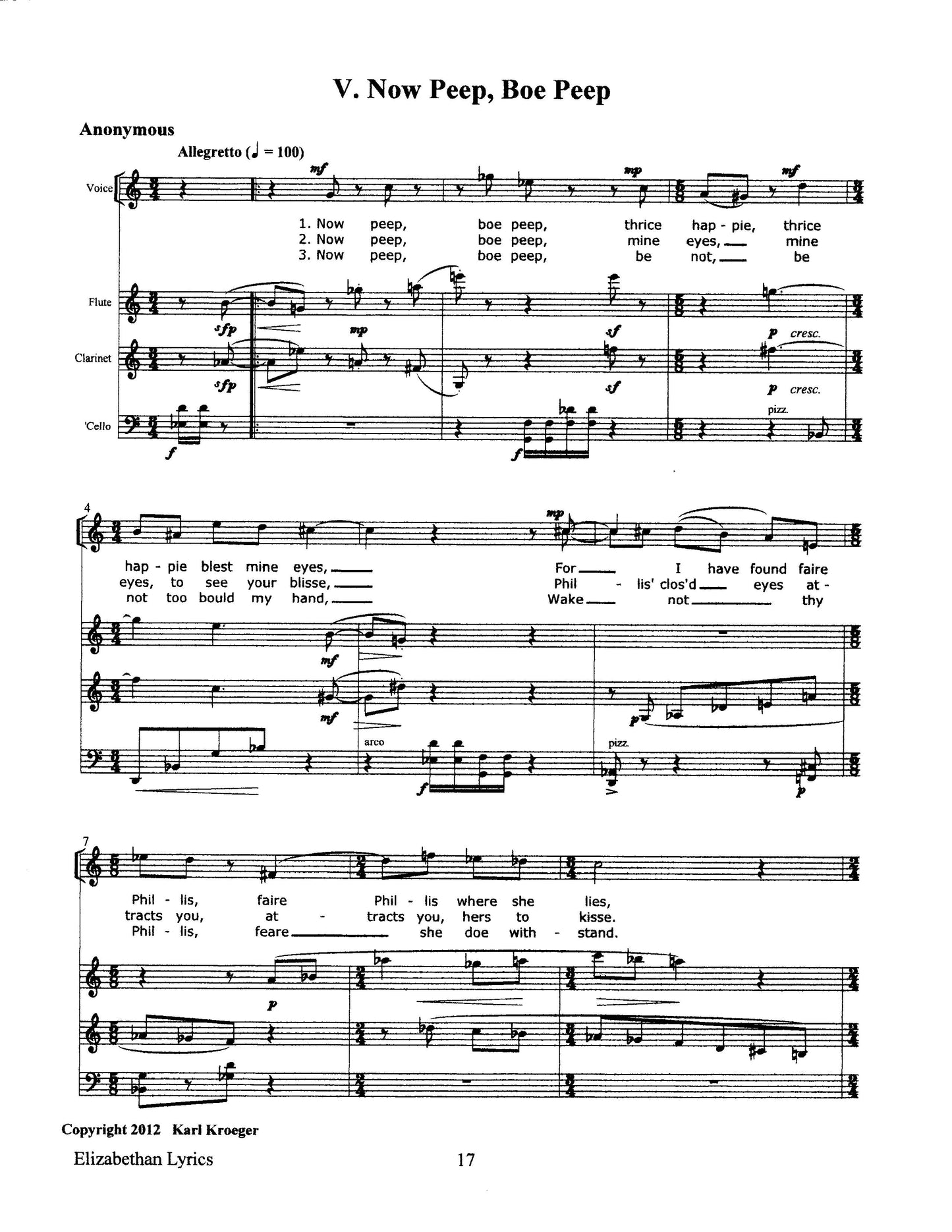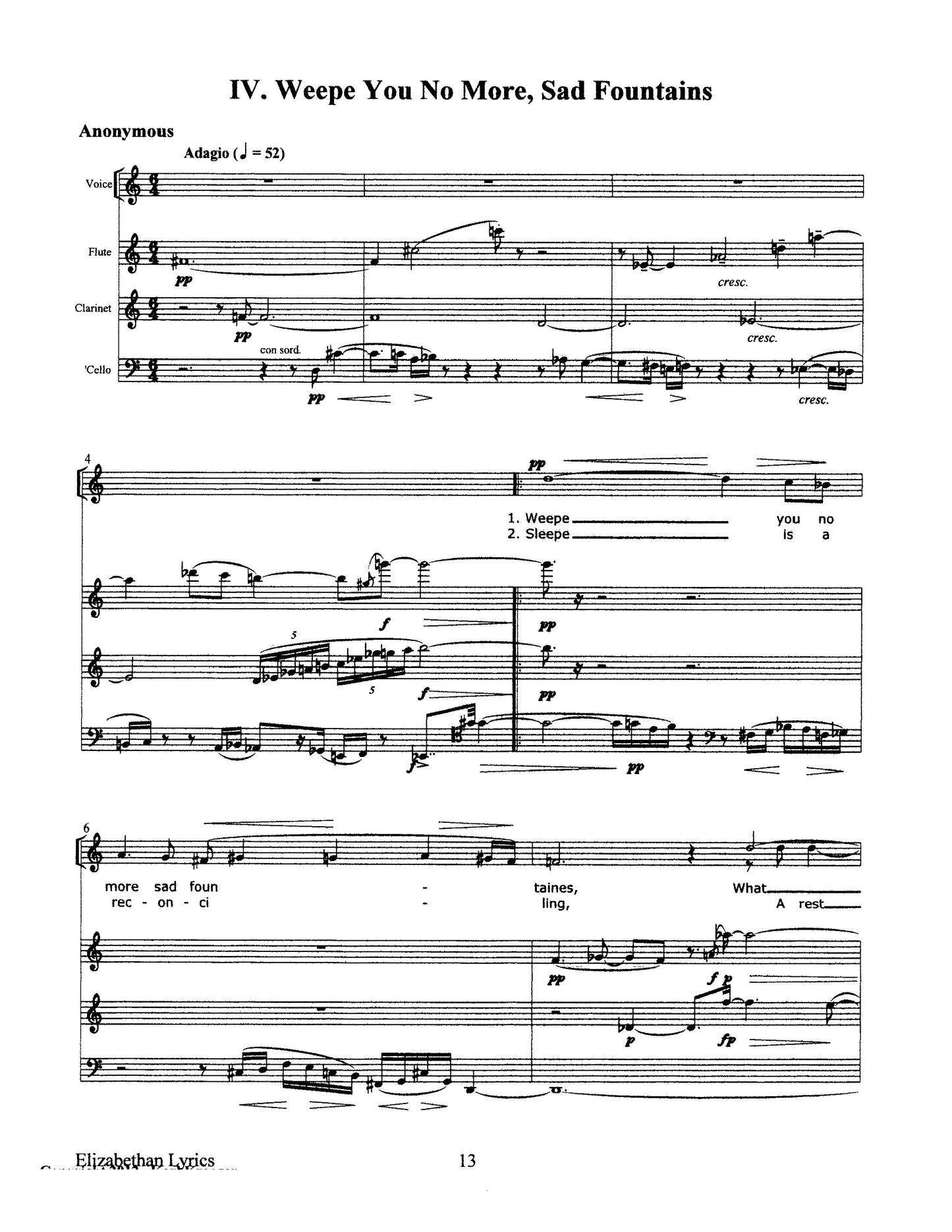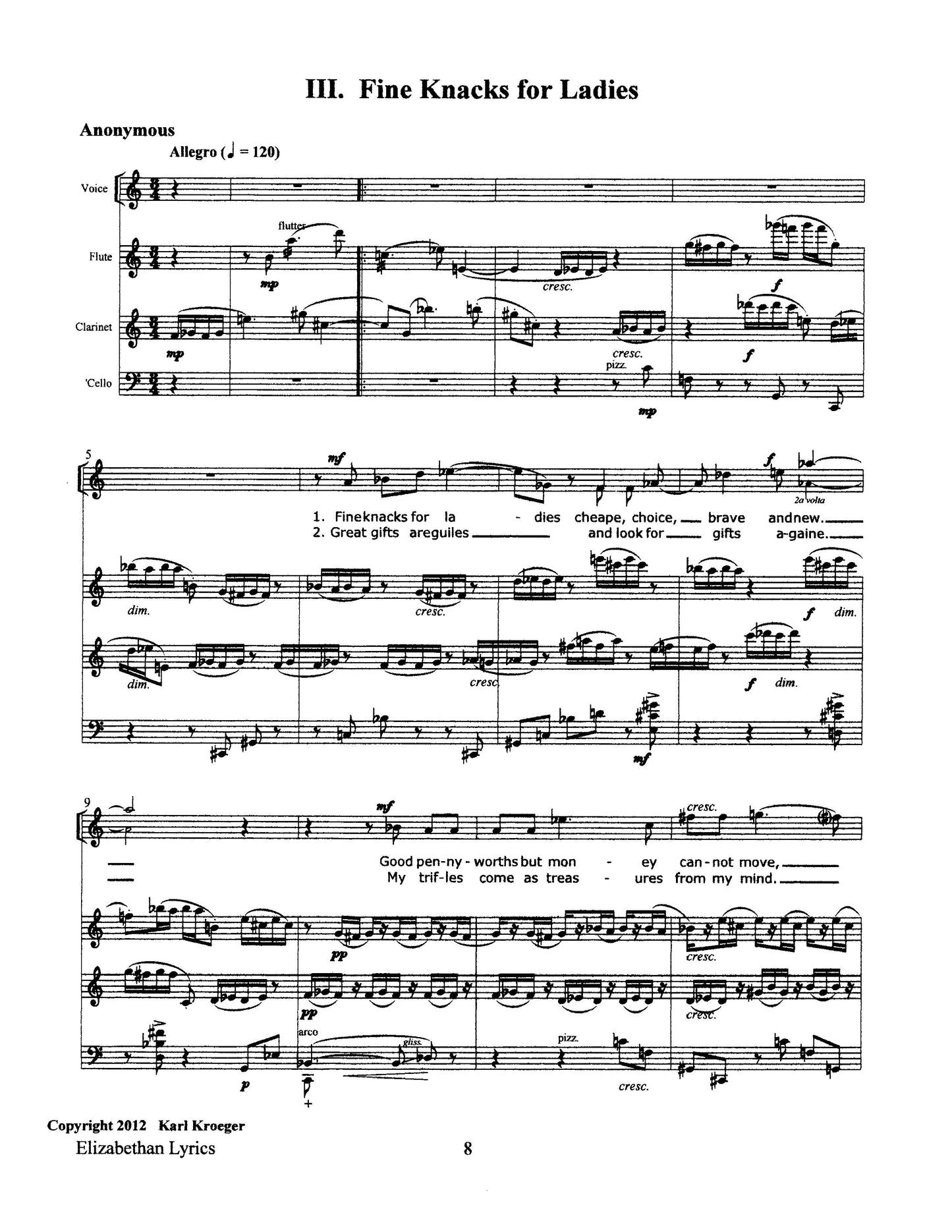 Five strophic songs based on English lute-songs of the Elizabethan period. Titles are: 1, Tyme, cruell tyme, 2. In Darkness let me dwell, 3. Fine Knacks for Ladies, 4. Weep you no more, sad fountains, 5. Now peep, boe peep. Musical style is atonal.