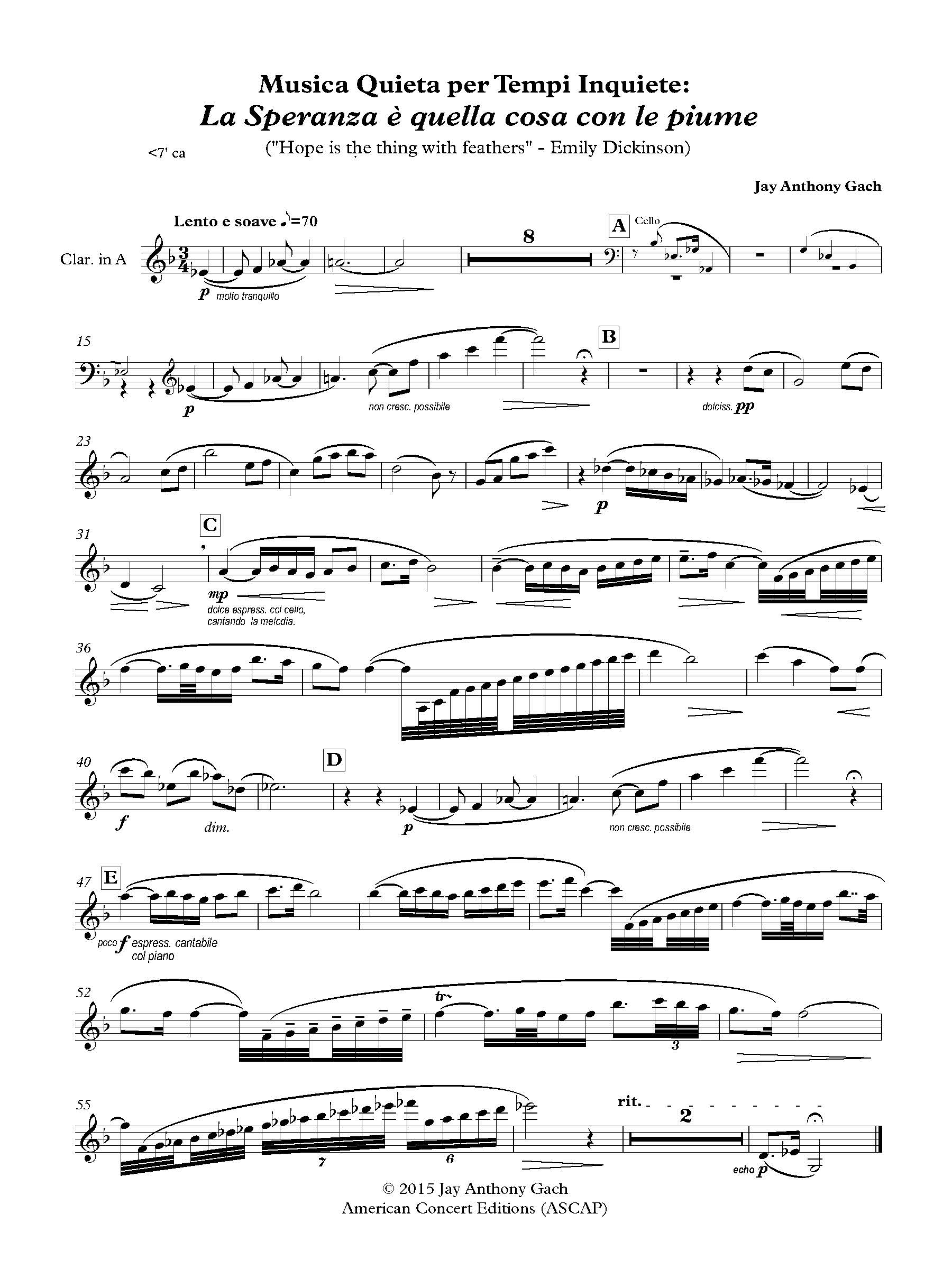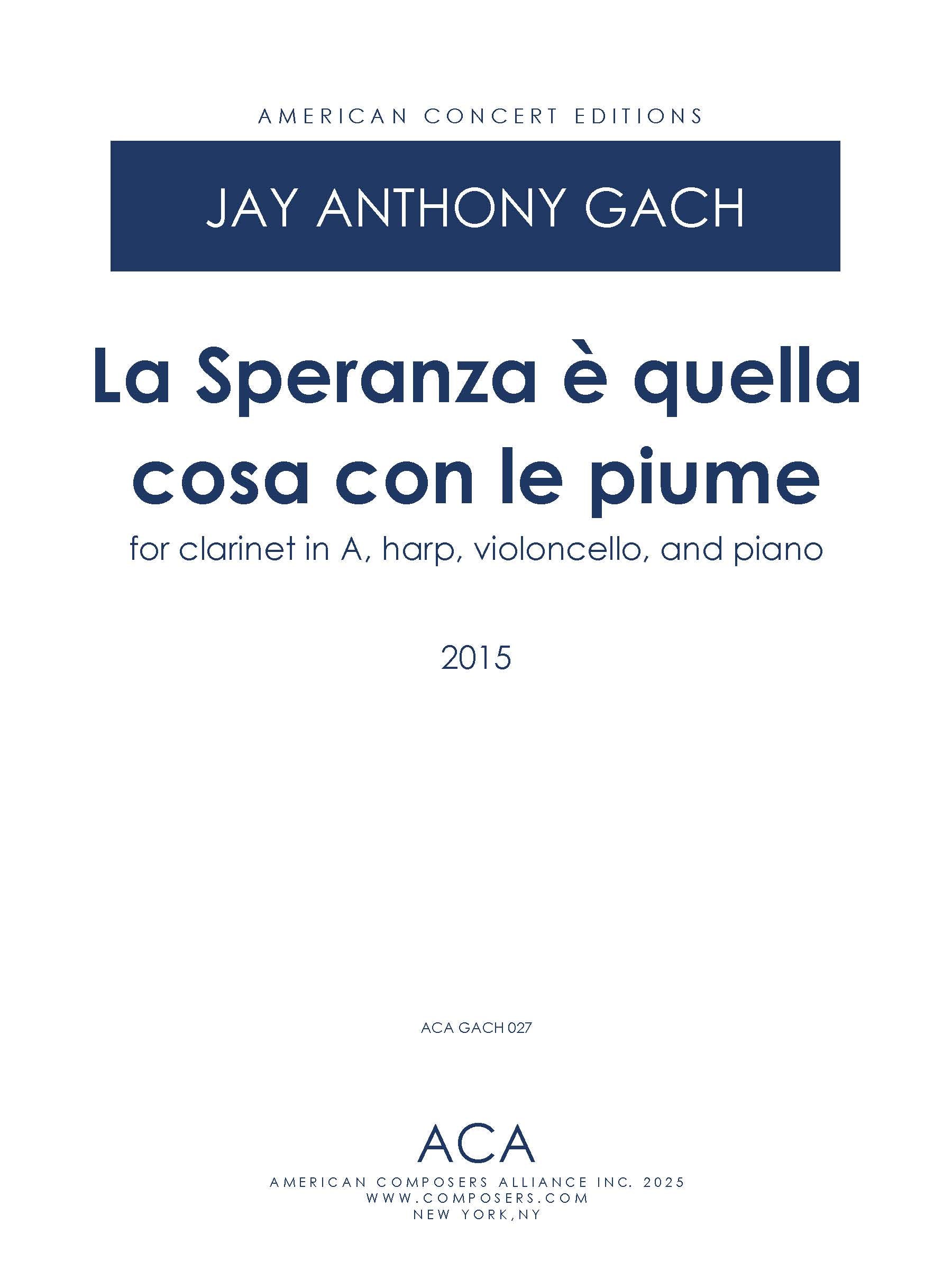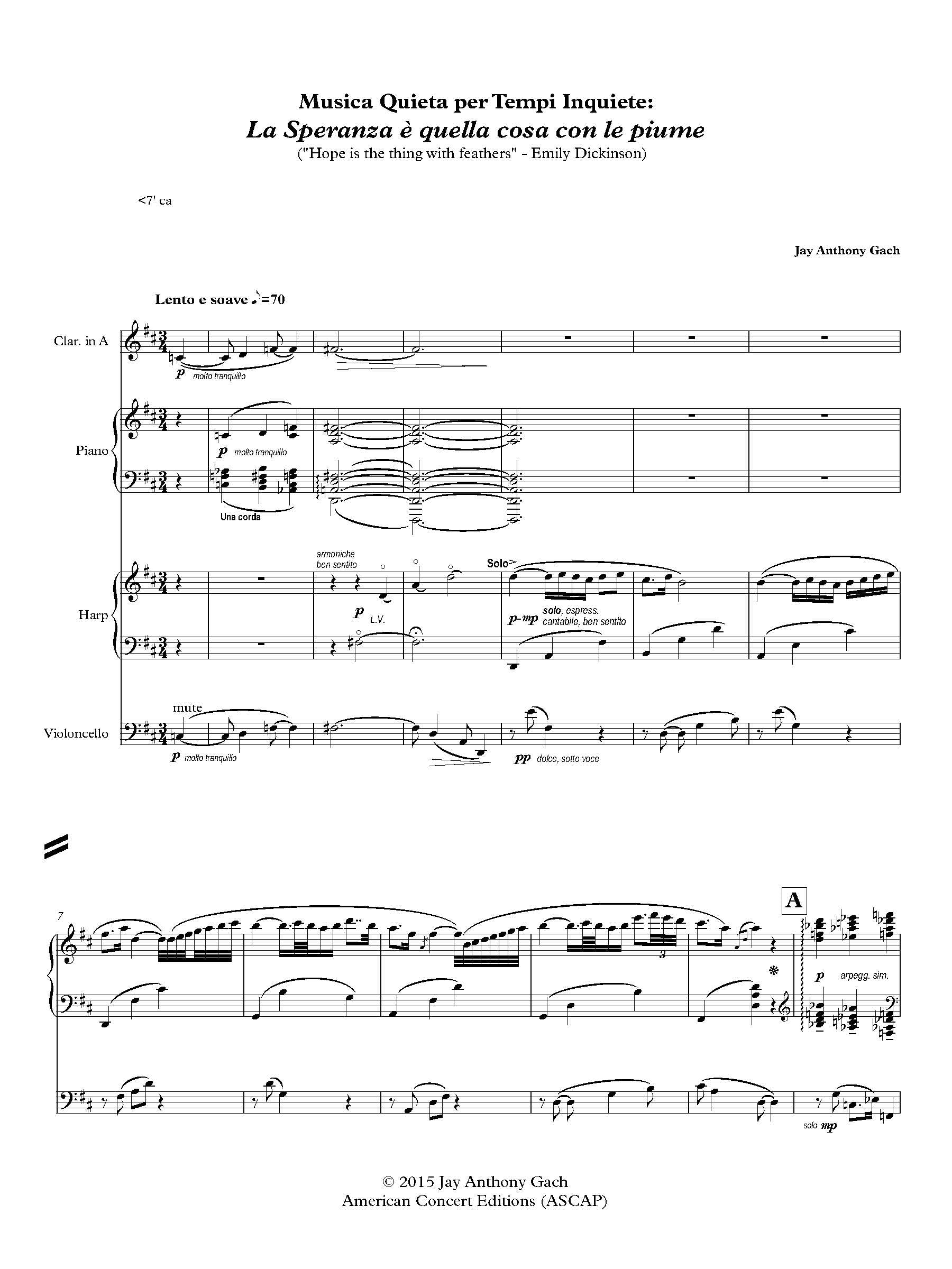 La Speranza è quella cosa con le piume ("Hope is the thing with feathers" - Emily Dickinson) is one of a series of short chamber music pieces in my collection Quiet Music for Unquiet Times (Musica Quieta per Tempi Inquiete).  This series of pieces was written for the Italian ensembles Assisi Souno Sacro, Namaste, and the Hot Jupiters.