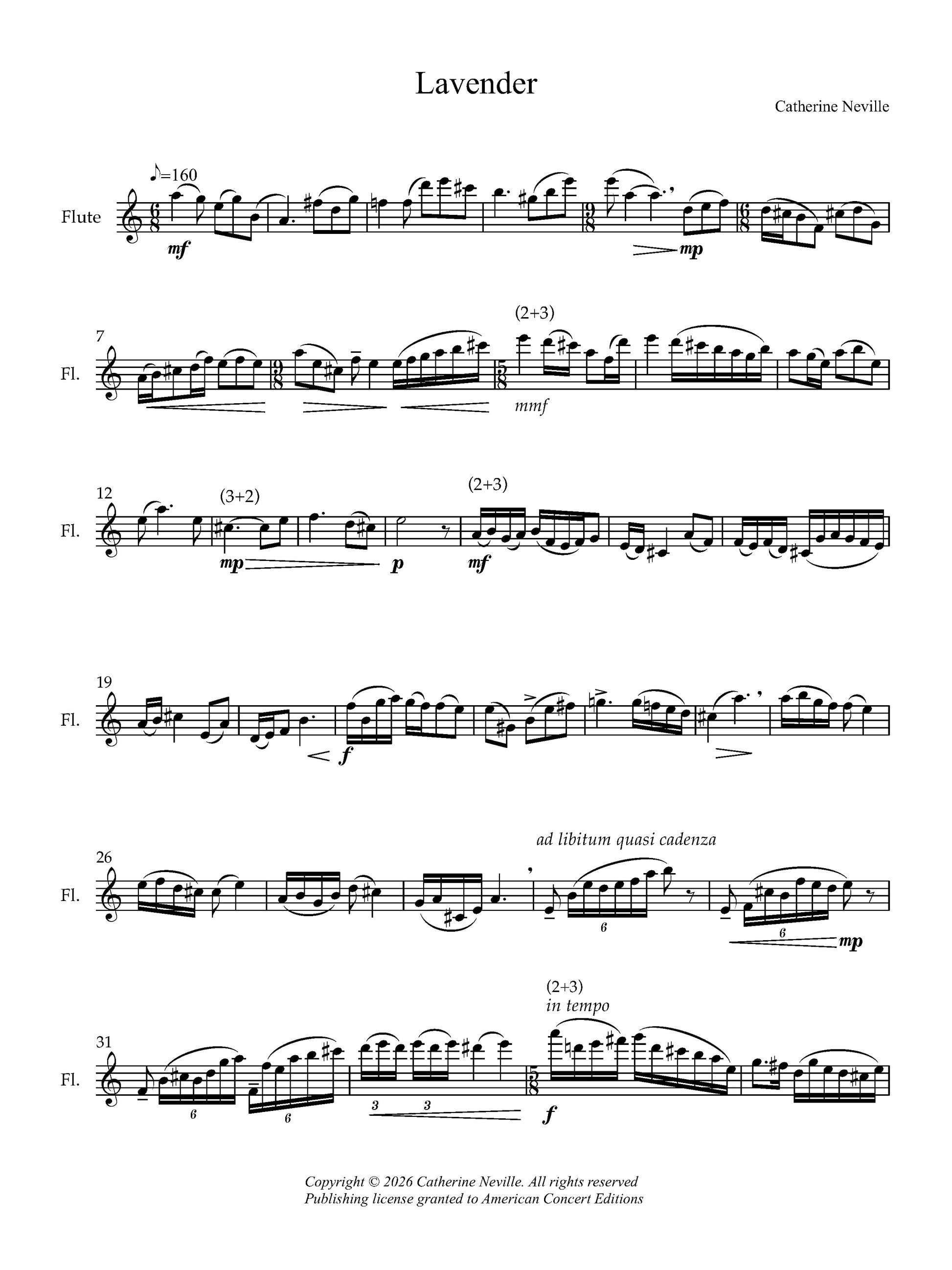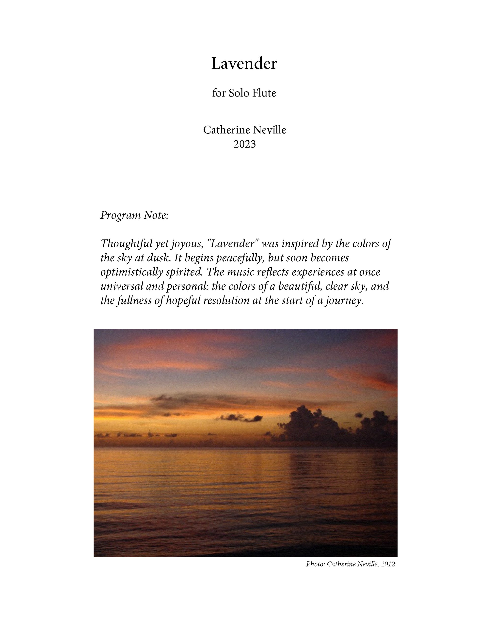 Thoughtful yet joyous, "Lavender" was inspired by the colors of the sky at dusk. It begins peacefully, but soon becomes optimistically spirited. The music reflects experiences at once universal and personal: the colors of a beautiful, clear sky, and the fullness of hopeful resolution at the start of a journey.
