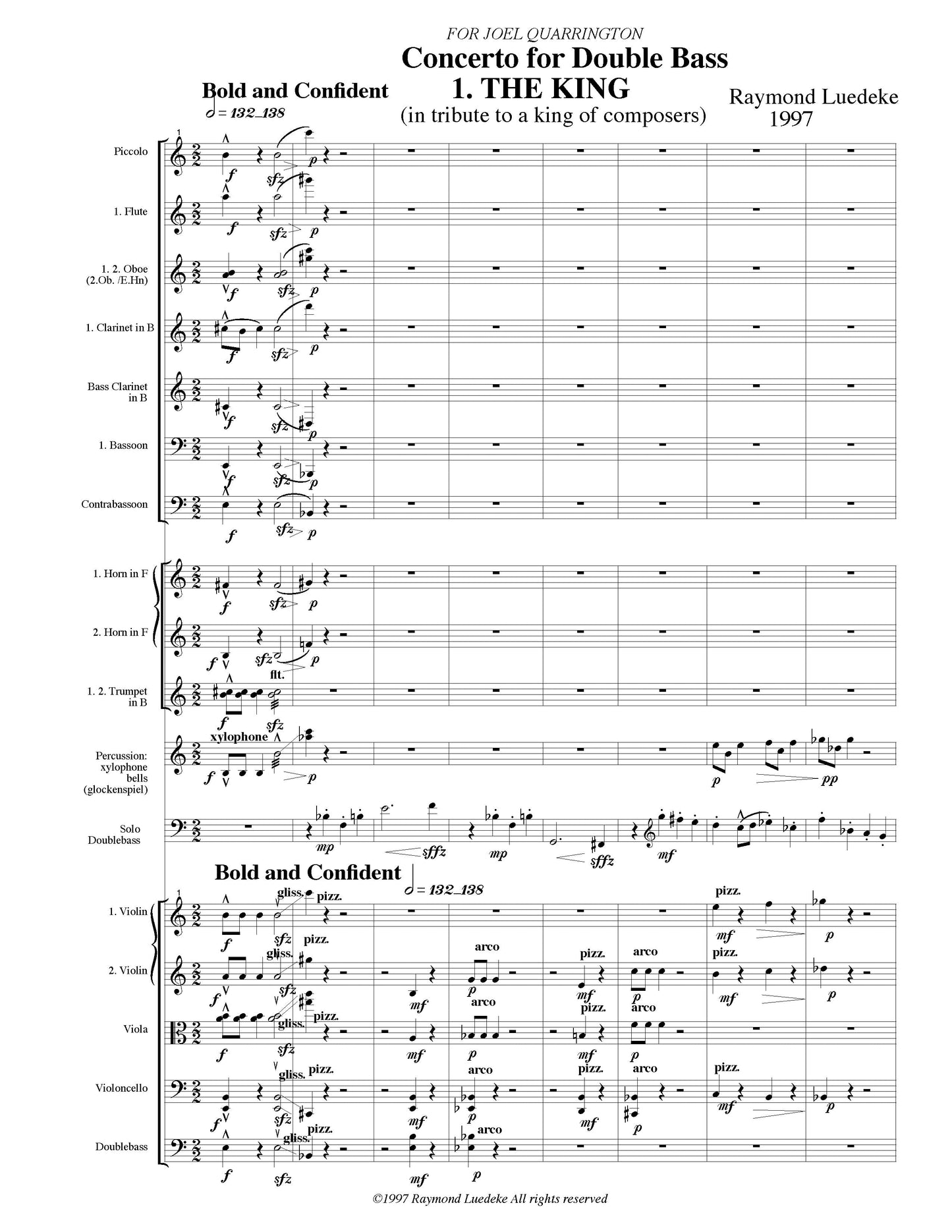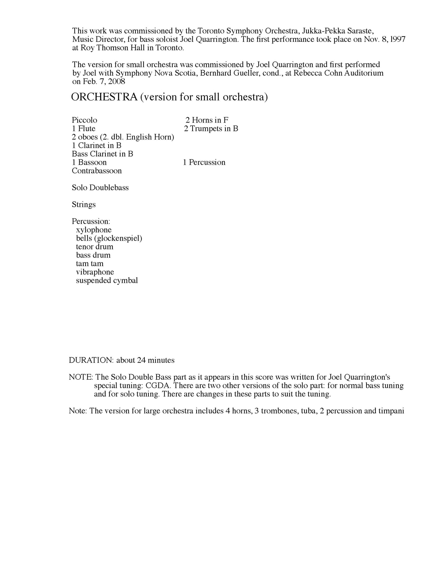 1. The King (in tribute to a king of composers)2. The Lover / The TricksterCadenza3. The Warrior Percussion: xylophone bells (glockenspiel), tenor drum, bass drum, tam tam, vibraphone, suspended cymbal;This work was commissioned by the Toronto Symphony Orchestra, Jukka-PekkaSaraste, Music Director, for bass soloist Joel Quarrington. The first performance tookplace on Nov. 8, l997 at Roy Thomson Hall in Toronto.The version for small orchestra was commissioned by Joel Quarrington andfirst performed by Joel with Symphony Nova Scotia, Bernhard Gueller, cond.,at Rebecca Cohn Auditorium on Feb. 7, 2008