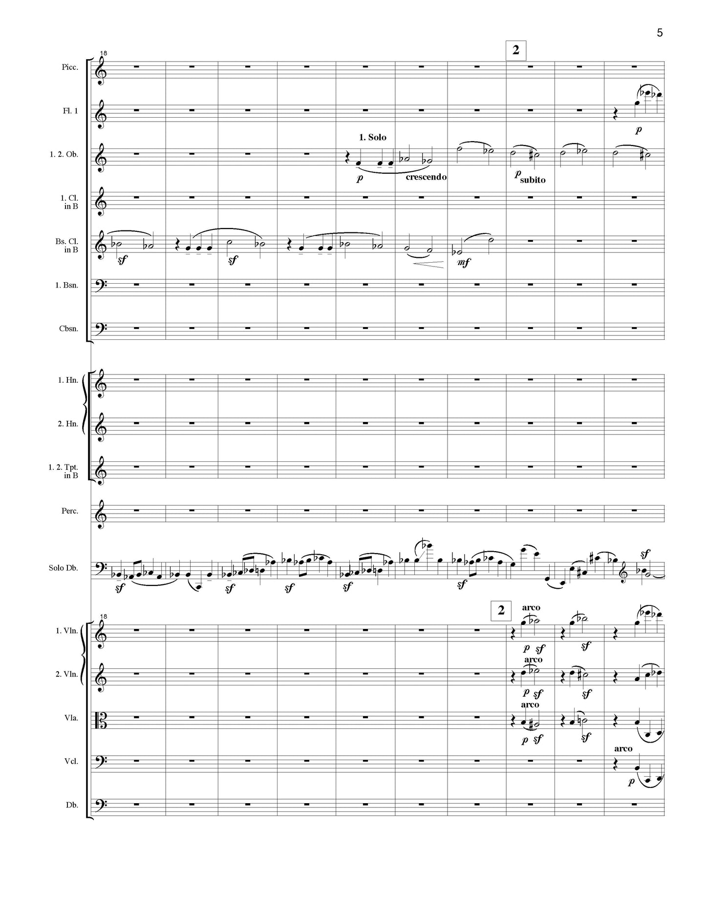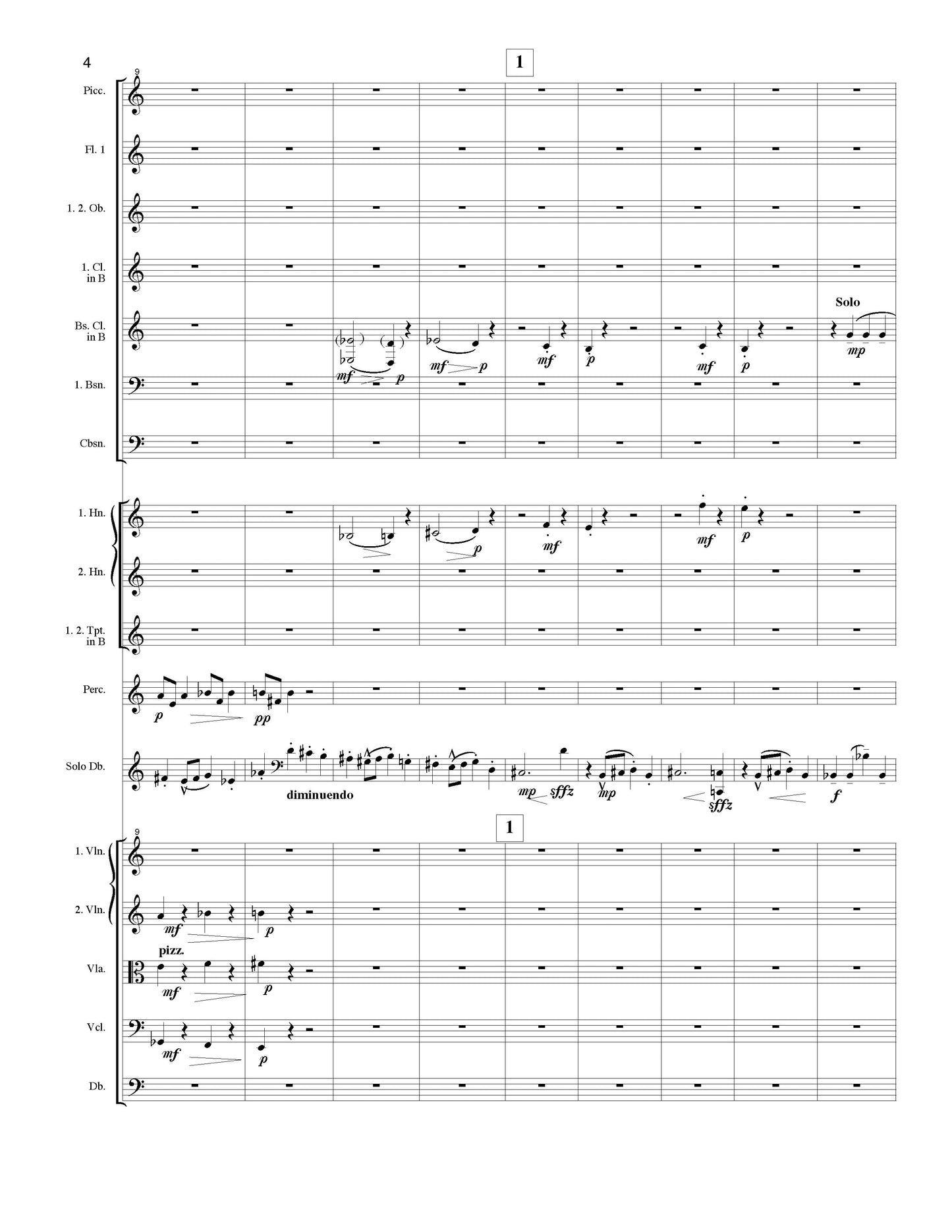 Picc, 1 Fl, 2 ob (2. dbl. EH), 1 Cl, bscl, 1 bsn, cbsn, 2 Hn, 2 Tpt, 1 Percussion; solo double bass, strings