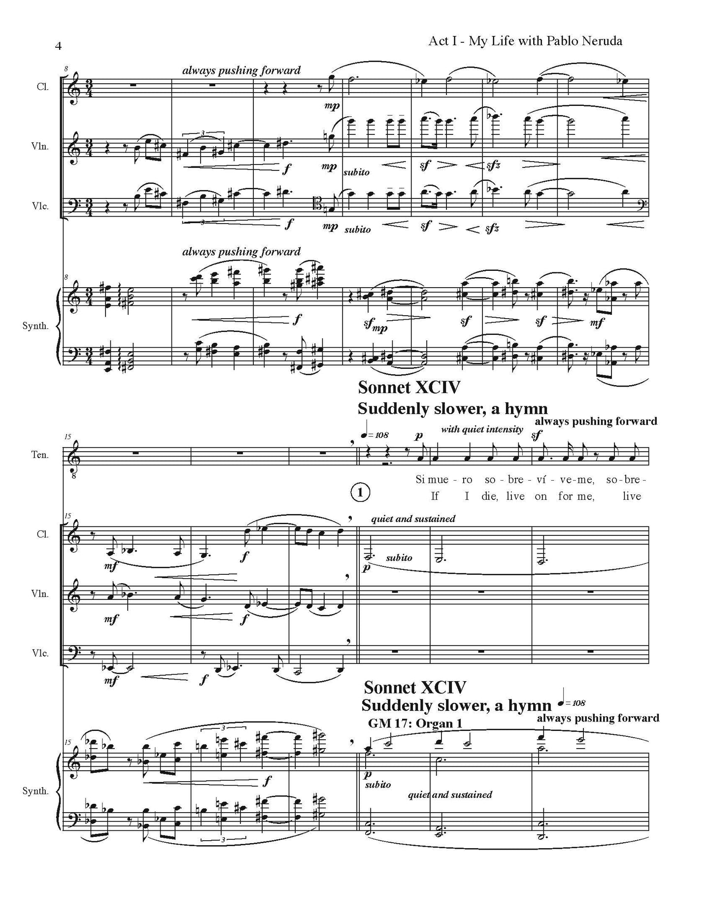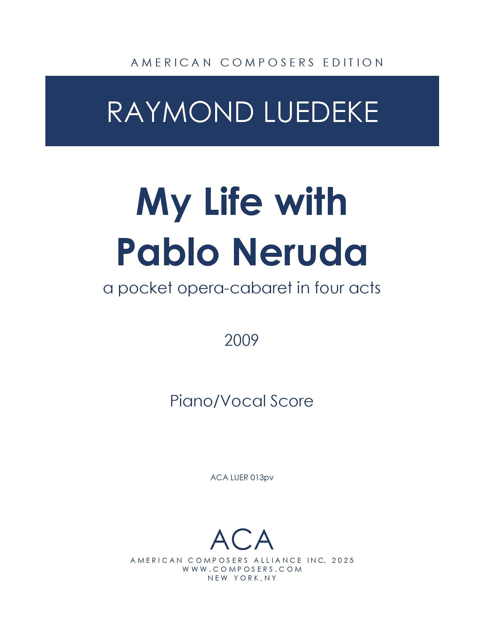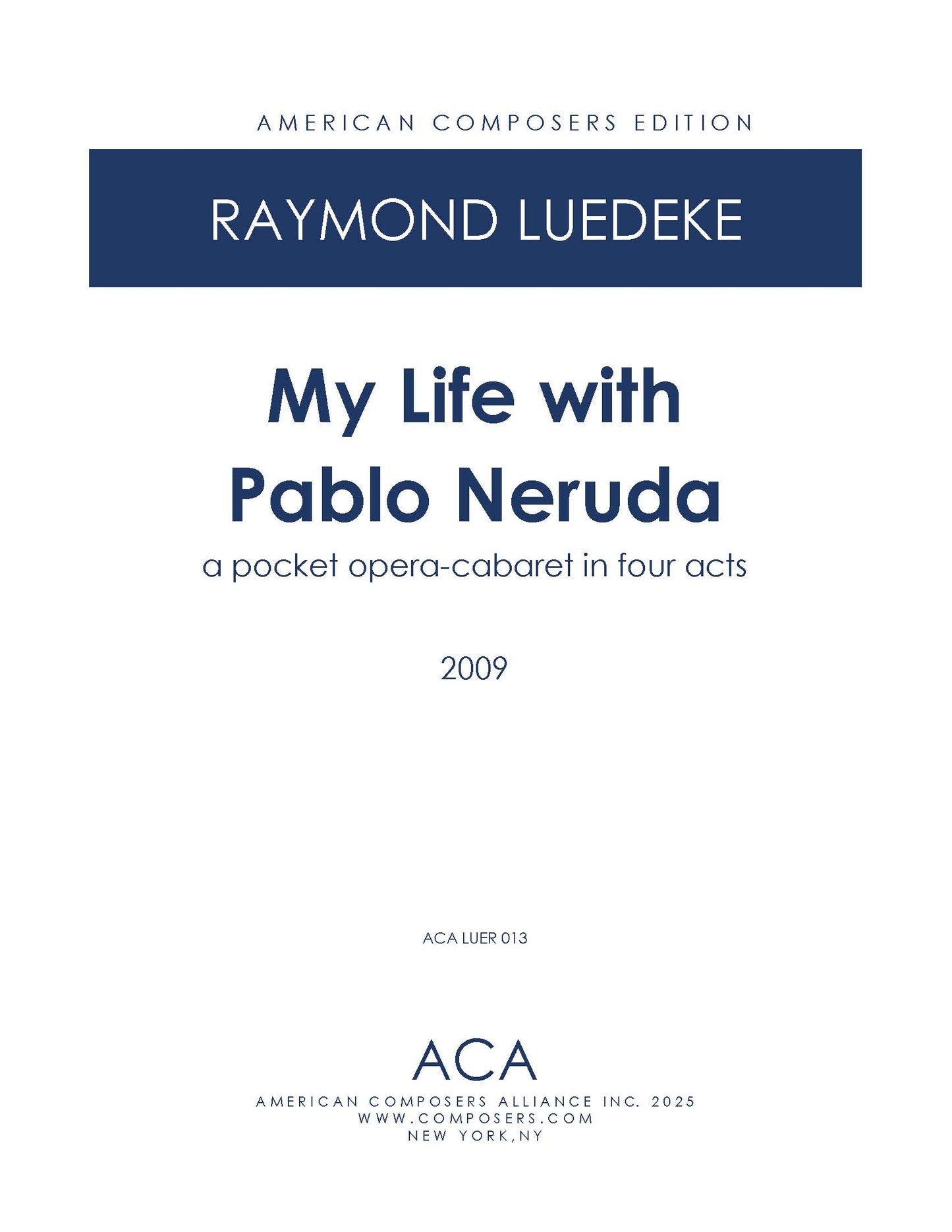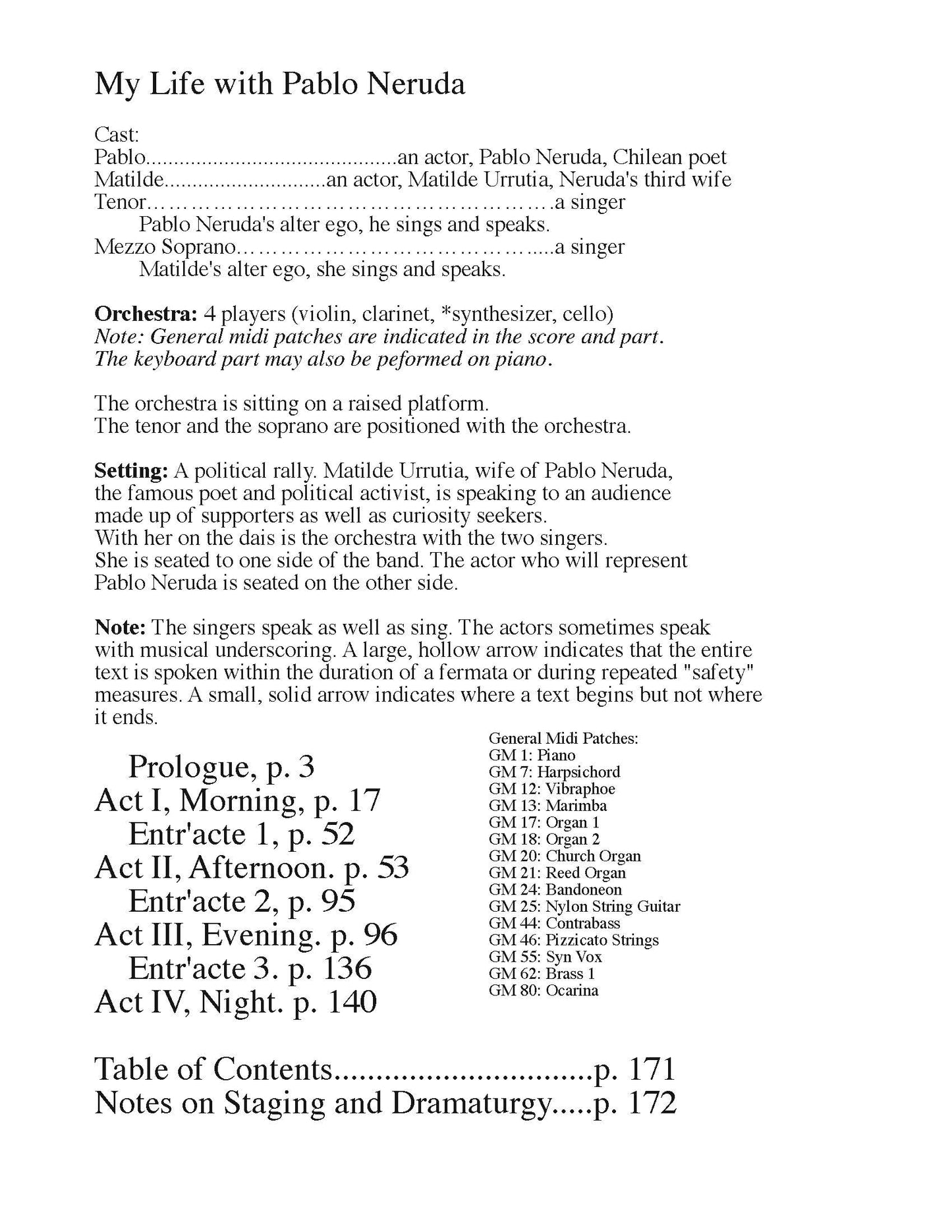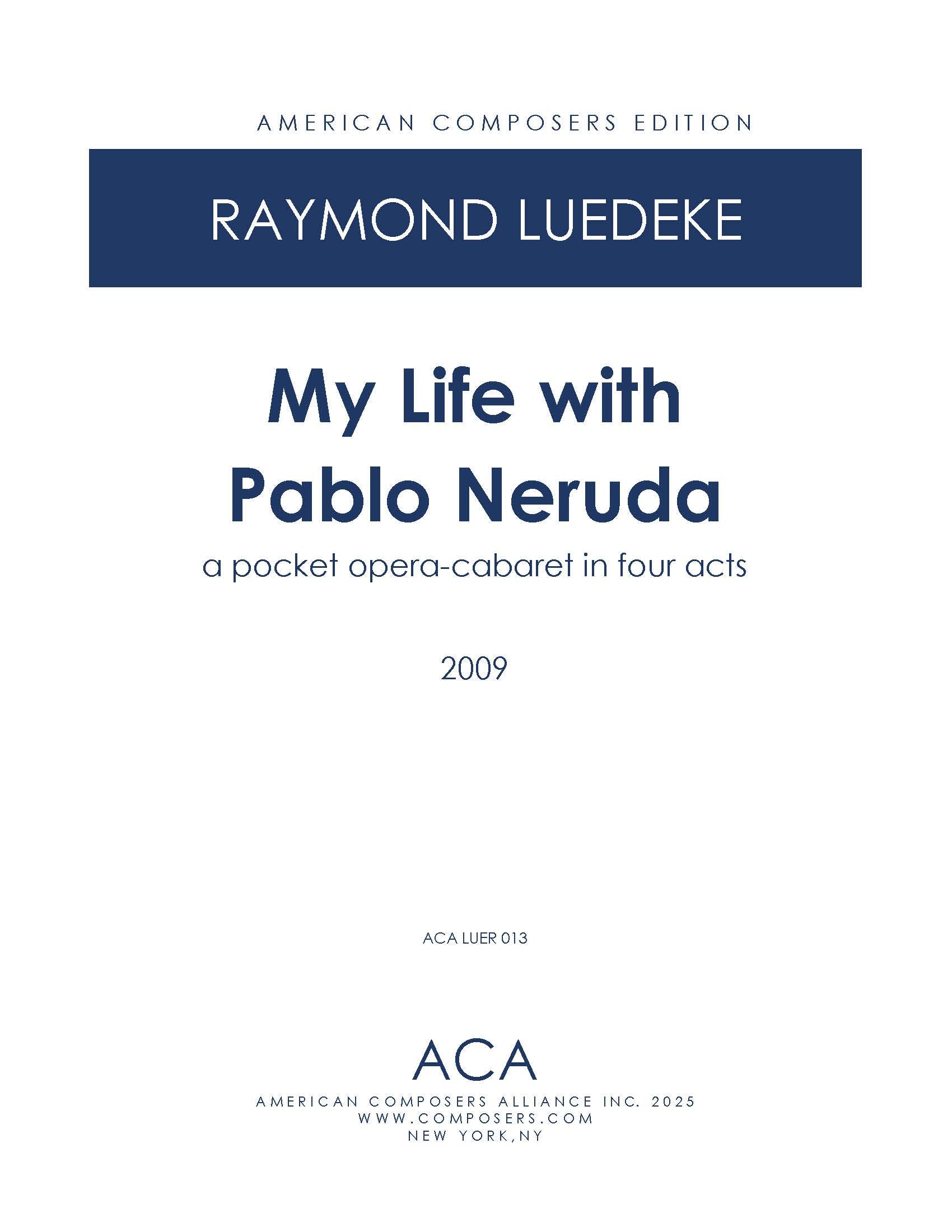 My Life with Pablo Neruda is a full evening, 4 act "pocket" opera-cabaret for two actors, two singers, and a four person "orchestra" (violin, clarinet, cello, and synthesizer). The libretto is based on 100 Love Sonnets, by Nobel prize-winning Chilean poet Pablo Neruda and on "My Life with Pablo Neruda" by Neruda's wife, Matilde Urrutia. 100 Love Sonnets, the book of poetry by Pablo Neruda, is divided into four sections: Morning, Afternoon, Evening, and Night. These divisions become the four acts of the pocket opera-cabaret