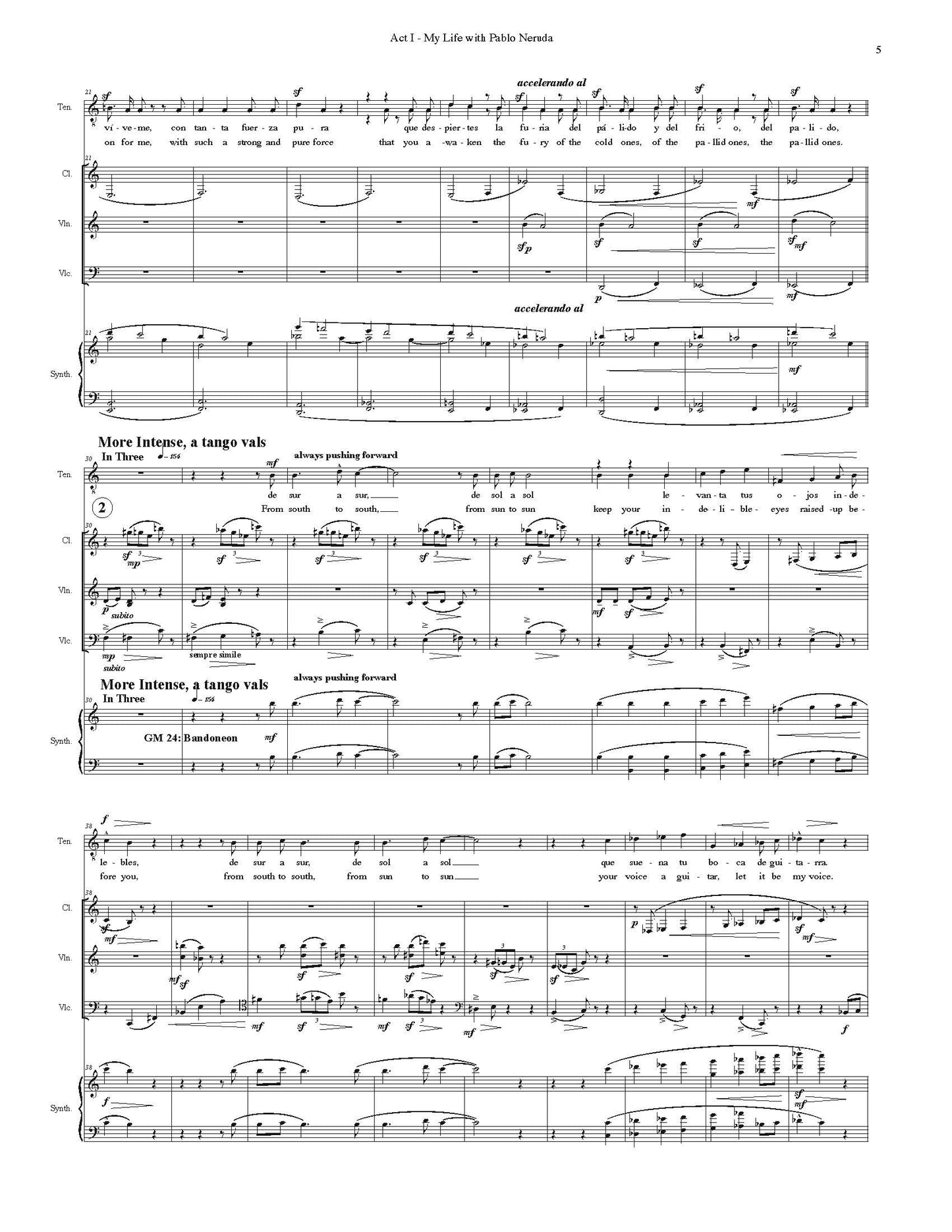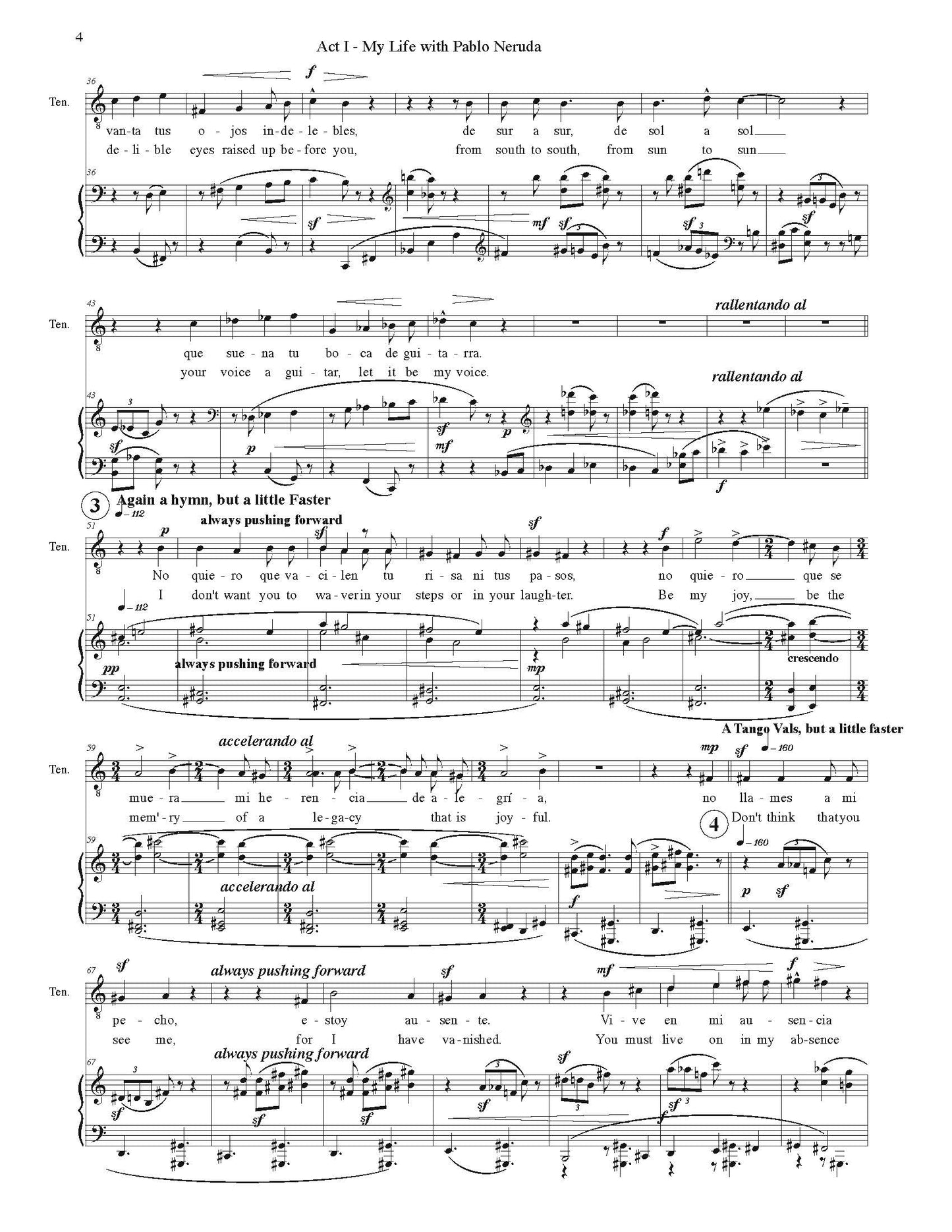 My Life with Pablo Neruda may be performed in either English or in Spanish. The score includes lyrics in both languages. There are also scripts in both languages. The Spanish script includes the Spanish translation of the spoken dialogue in the score.
