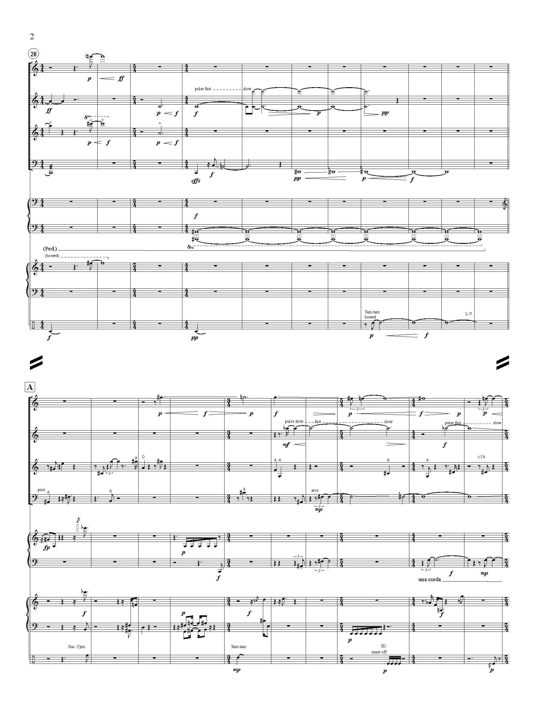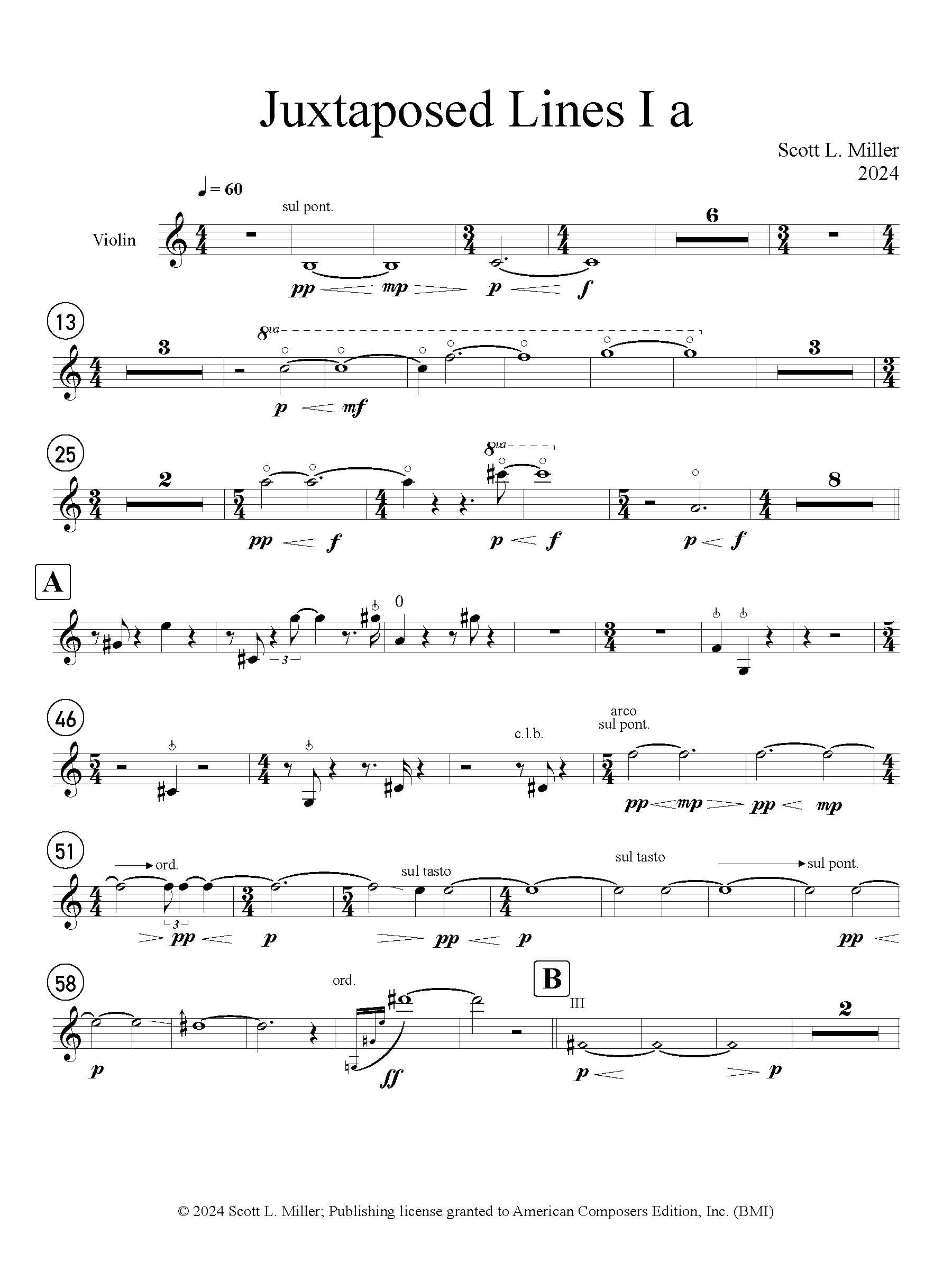 My compositional career has largely featured music involving electronic sound in some form or another, with more than a decade passing at one point between compositions of music solely for acoustic instruments. Juxtaposed Lines is a kind of reckoning with my past, which began with a long reflection on what sonic elements characterize the past three decades of my music. The list is not terribly long, but my goal has been to take these features and realize them using only acoustic means of sound production. One characteristic feature of my sound-world is the juxtaposition of synthetic long-tones with acoustically produced sound, an interest I can trace through my work dating to the mid-1990s. Its origins come from an interest in extracting elements from acoustic sound, which has come to operate for me as a kind of measurement device, the imposition of a baseline against which raw, noisy, organic sound can be understood. These long-tones enter and exit over the course of a composition and provide a structural framework for the piece.