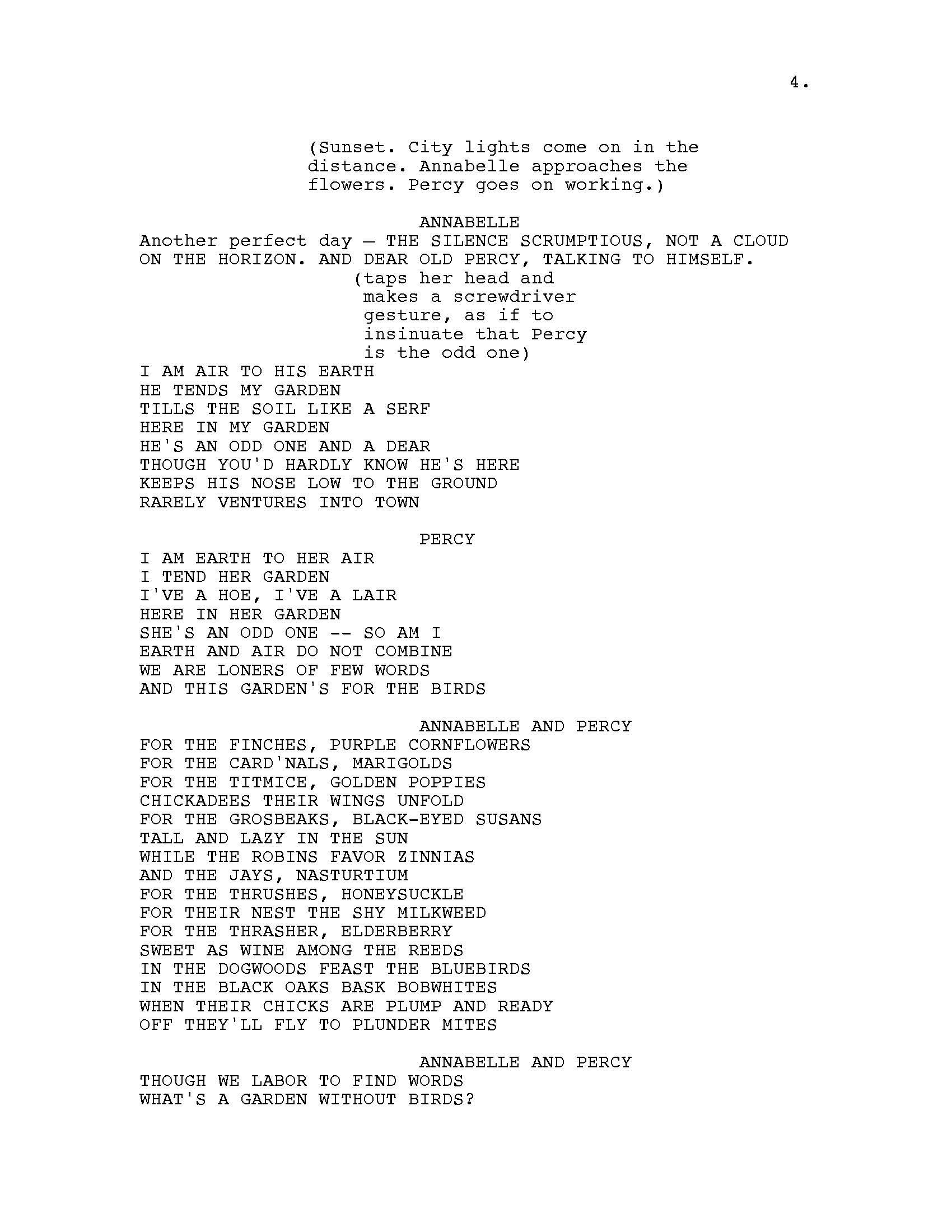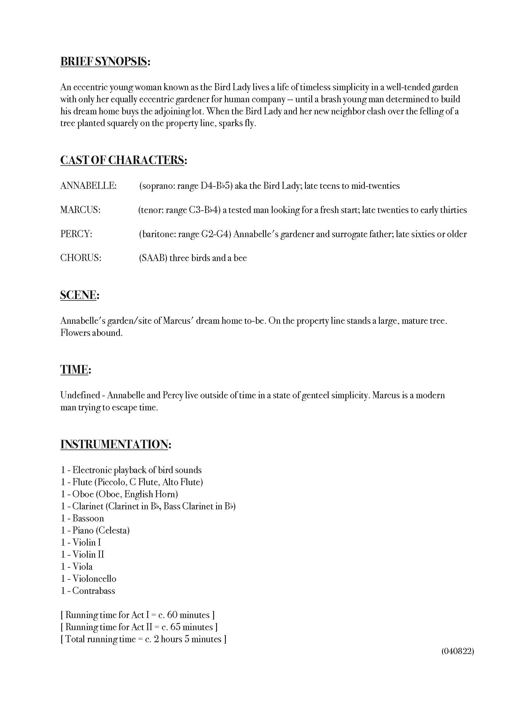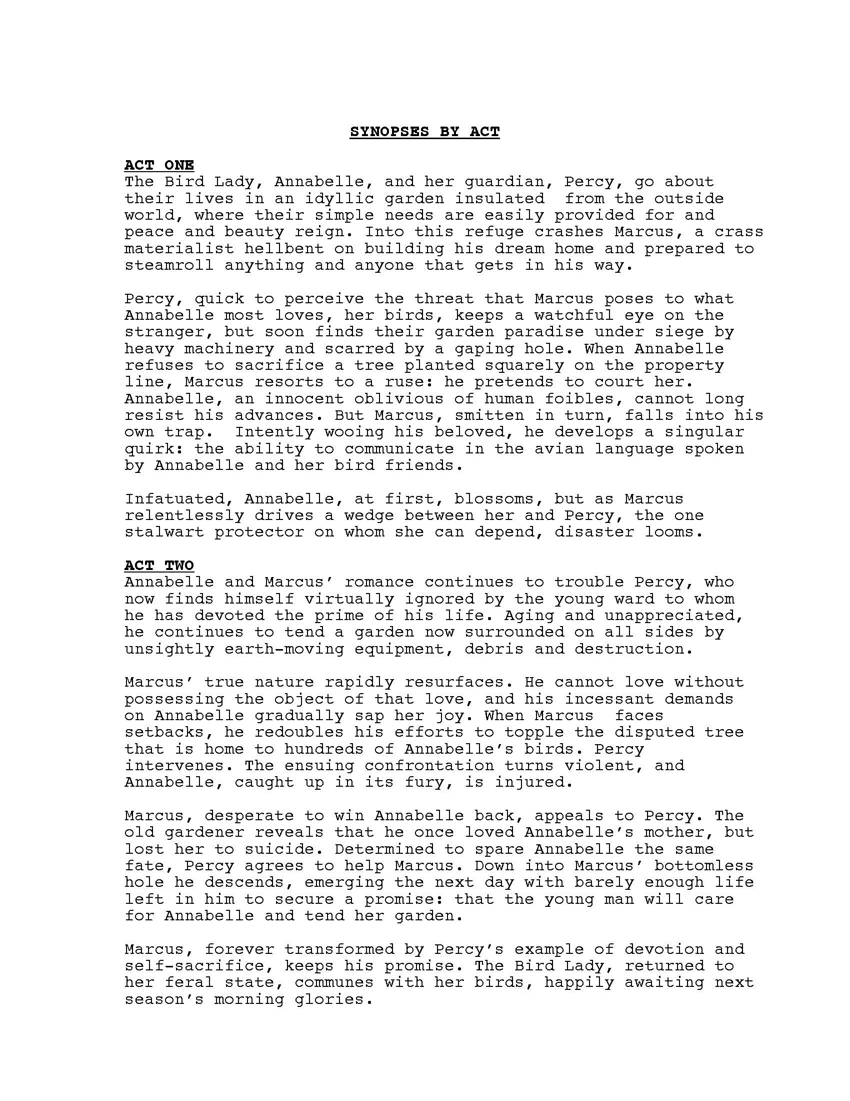 An eccentric young woman known as the Bird Lady lives a life of timeless simplicity in a well-tended garden with only her equally eccentric gardener for human company "” until a brash young man determined to build his dream home buys the adjoining lot. When the Bird Lady and her new neighbor clash over the felling of a tree planted squarely on the property line, sparks fly.