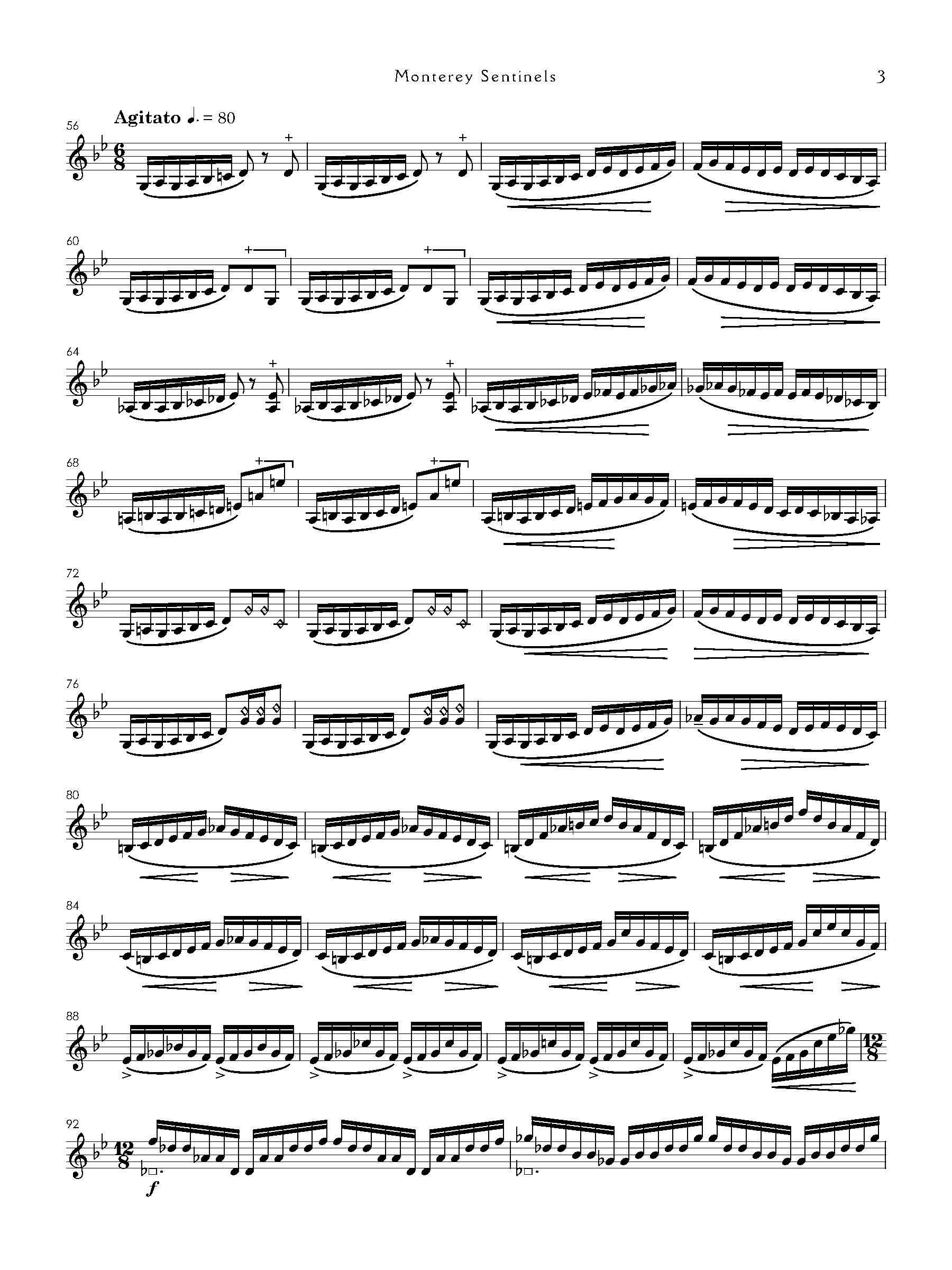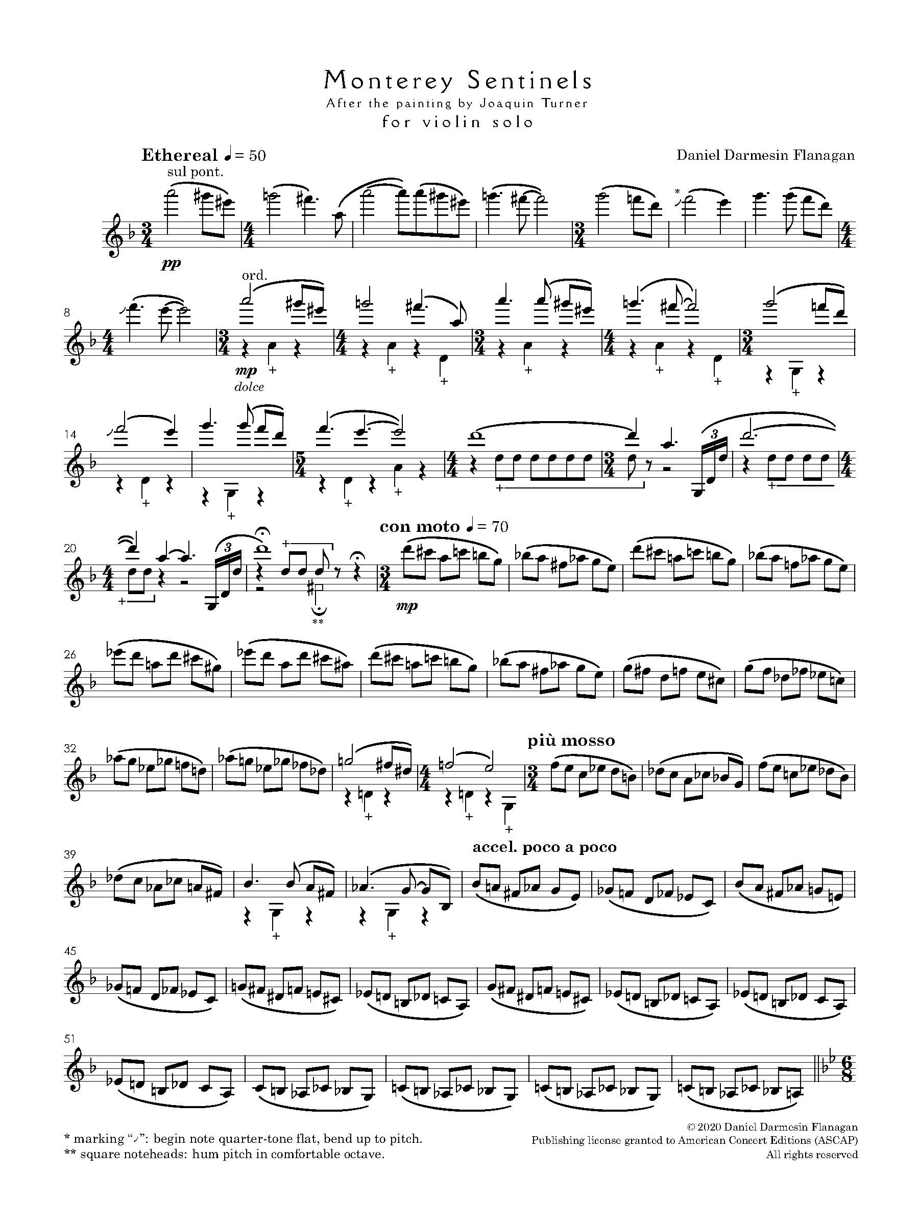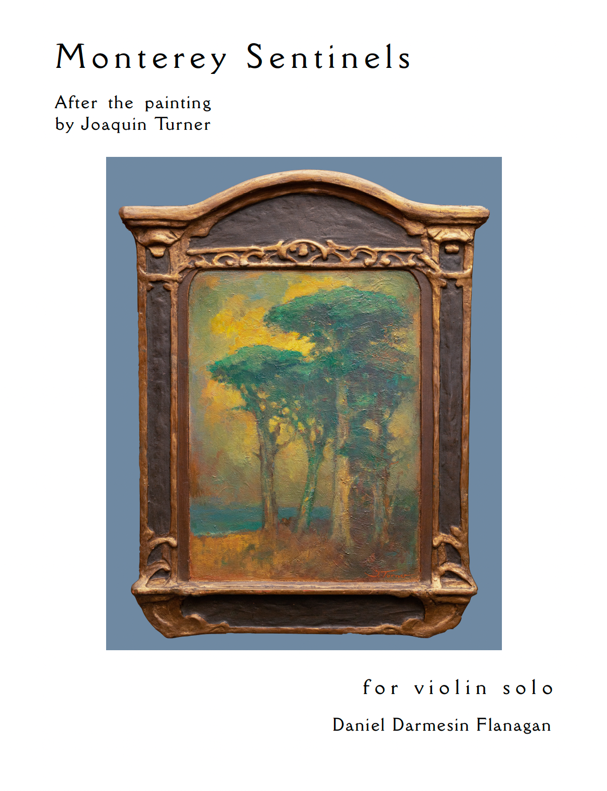 In Monterey Sentinels, I tried to convey the mood of Joaquin Turner’s painting of the same name, aurally conjuring up the same feeling that the painting creates visually. Somewhat programmatic in nature, the music begins with a wispy melody in the trees, slides down the trunks to roll around in the ocean, then climbs back up to climax in the sky.