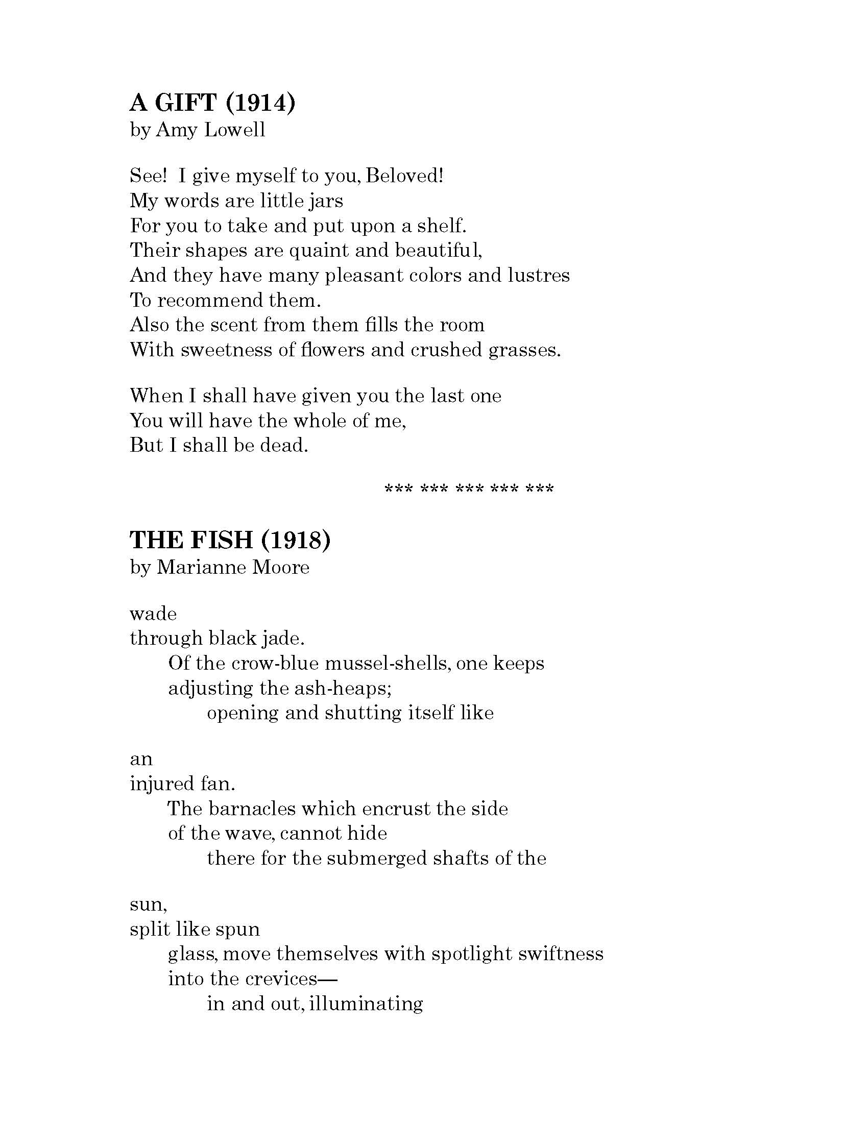 Text source: A Gift (Amy Lowell), The Fish (Marianne Moore), Beauty (Elinor Wylie), Sonnet 29 (Edna St. Vincent Millay)