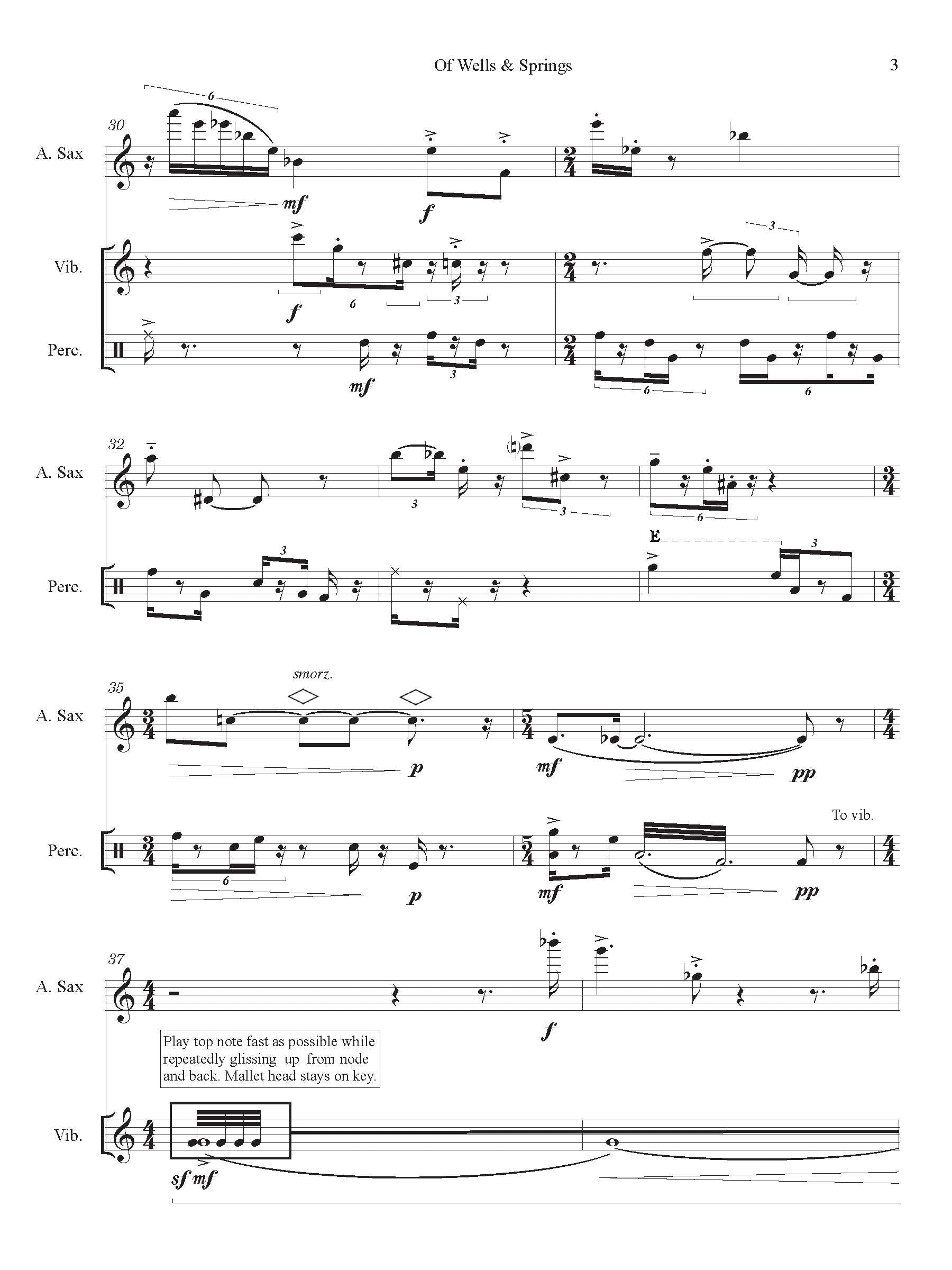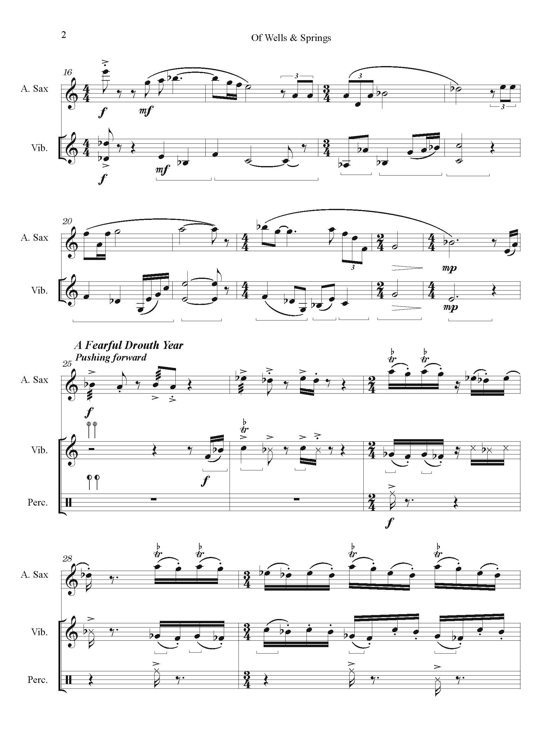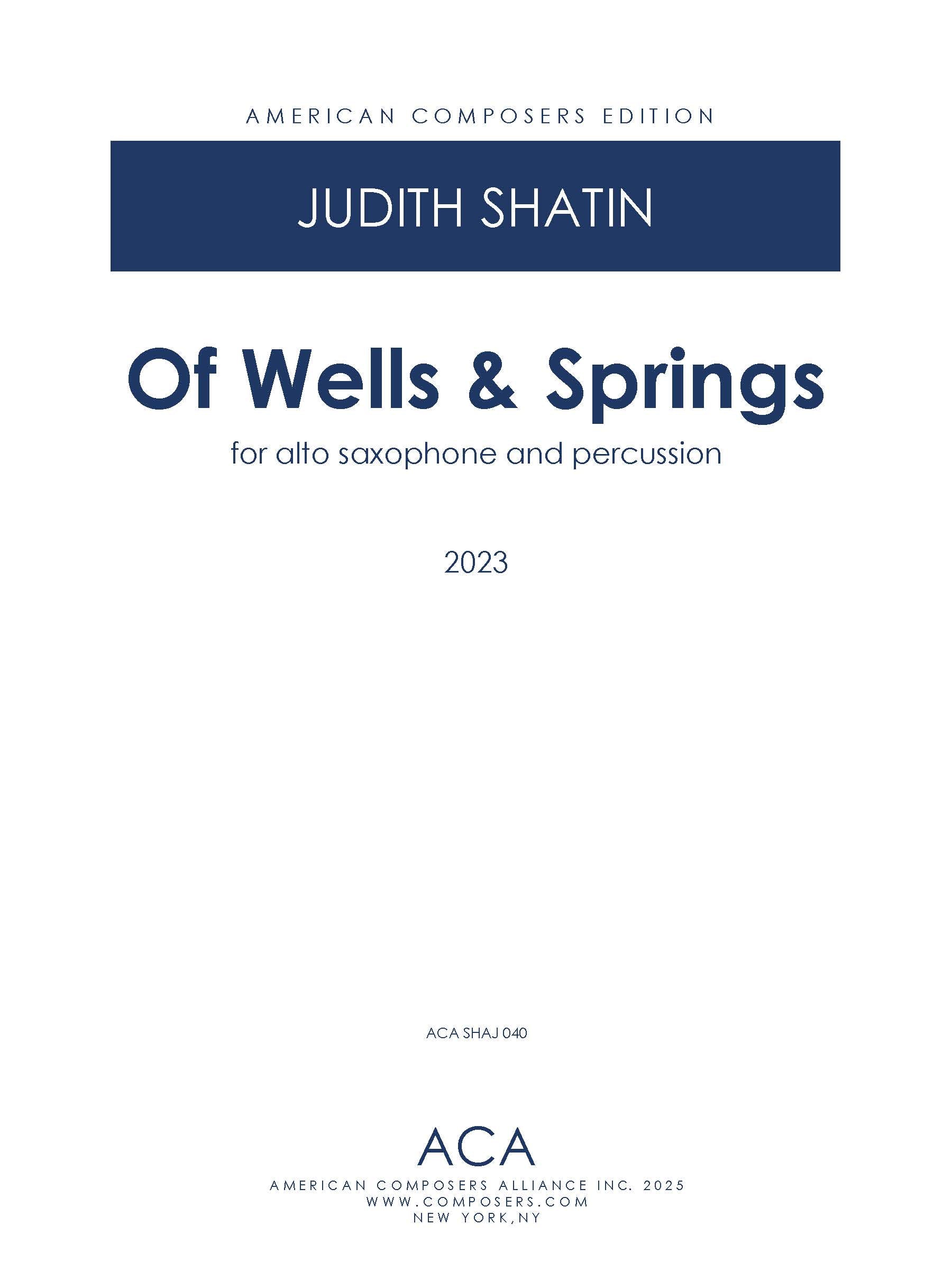 Of Wells and Springs was commissioned in consortium with the lead Bent Frequency Duo of saxophonist Jan Baker Berry and percussionist Stuart Gerber and saxophonists Nicole M. Roman, Kevin Norton and Drew Whiting.