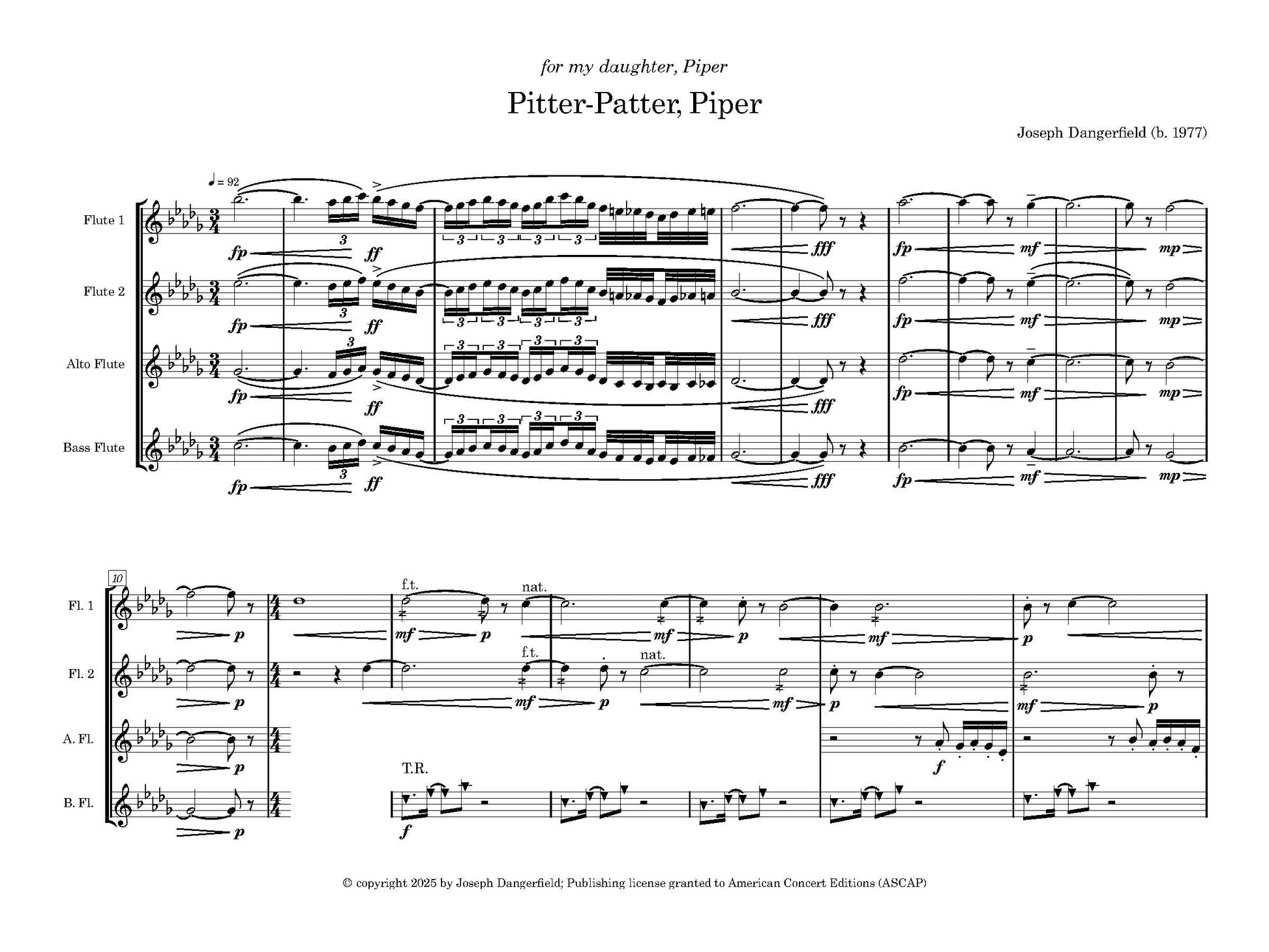 This work was composed for Nina Assimakopoulos and the flute studio at West Virginia University, and is dedicated to my daughter, Piper. It is intended to be a fast-paced, fun exploration of timbre and various extended techniques, representing the whimsical daily explorations of her cat, Nova Poe.
