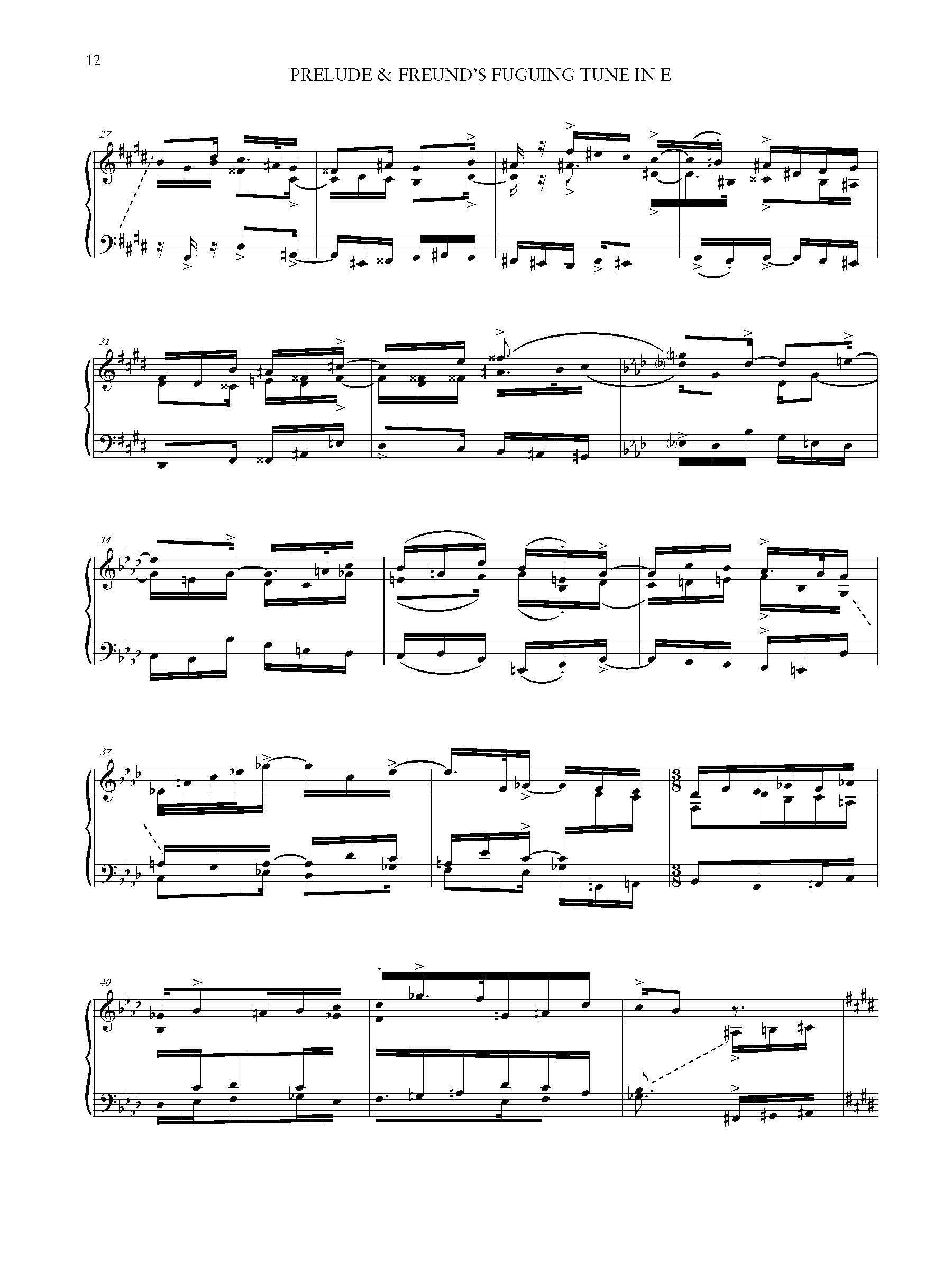 Prelude & Freund’s Fuguing Tune in E is very loosely modeled on the E-Flat Major Prelude and Fugue from WTC, Book I, which consists of an expansive first part that is considerably longer and more serious than the much briefer and—in all candor—rather delightfully flip and irreverent fugue that follows. My prelude begins maestoso (perhaps veering towards pomposo) and ultimately winds up going to some much darker and somewhat blues-tinged places by its conclusion. The three-voice fugue employs a subject built on the interval of a perfect fourth, derived from a melodic line I had used years ago in a setting of Psalm 23 for soprano and piano. It proceeds in the manner and tempo of a gigue. While it is in general somewhat closer to Bach’s own harmonic practice than the Prelude, it moves to more distant tonal areas than would be the norm for Bach. Just before the final statement of the subject, a passage emerges from the texture that exploits even more nebulous harmonic territory, including some rather unhinged sounding diminished seventh chords; in the score I describe the intended affect of this passage as “numb, disembodied, disconnected.”