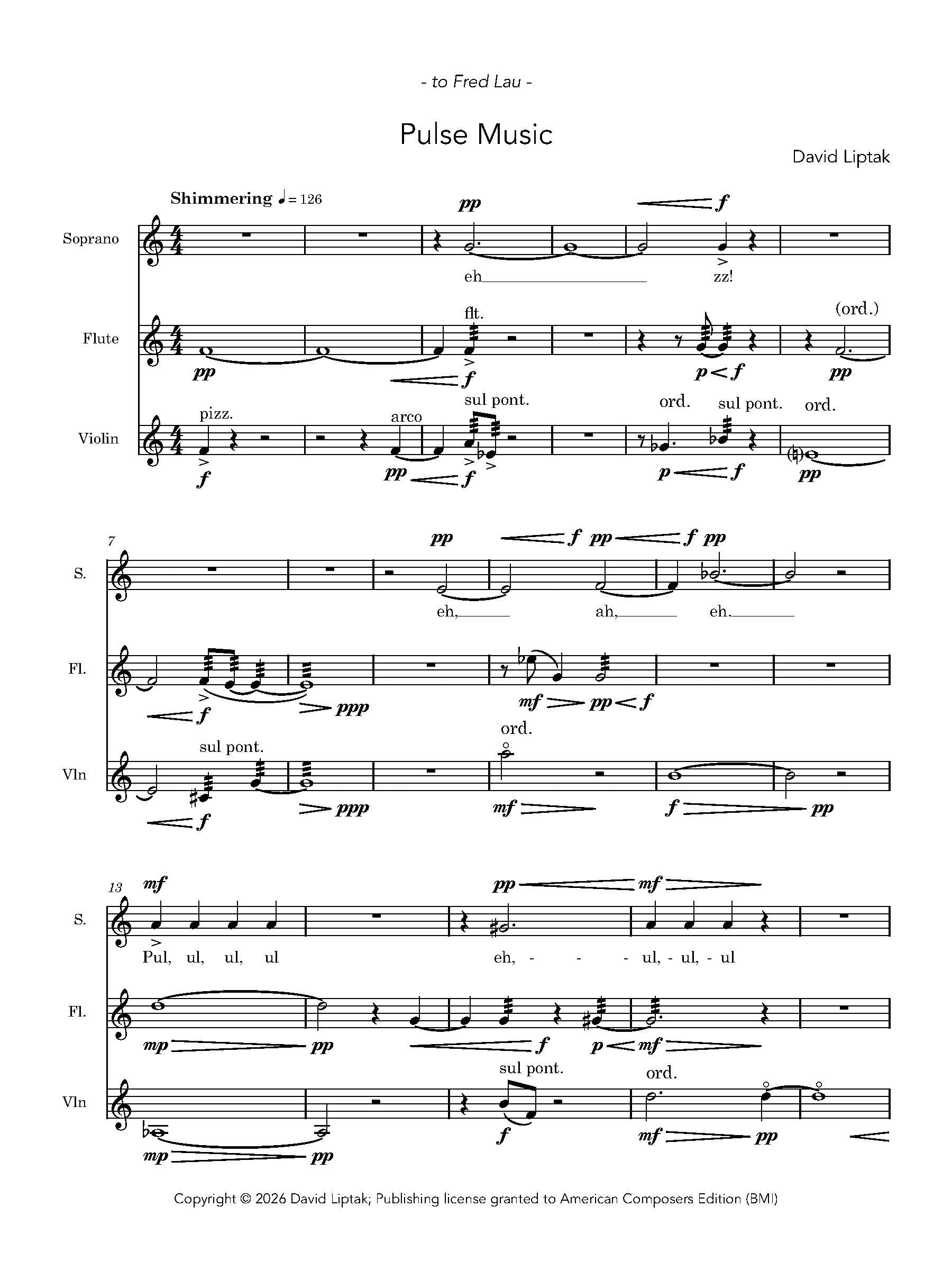 For performance, the soprano should use the score, and parts are provided for flute and violin. The 2026 edition of Pulse Music is dedicated to Fred Lau, ethnomusicologist, flutist, and performer in the premiere of Pulse Music on March 28th, 1984, in Urbana, Illinois.