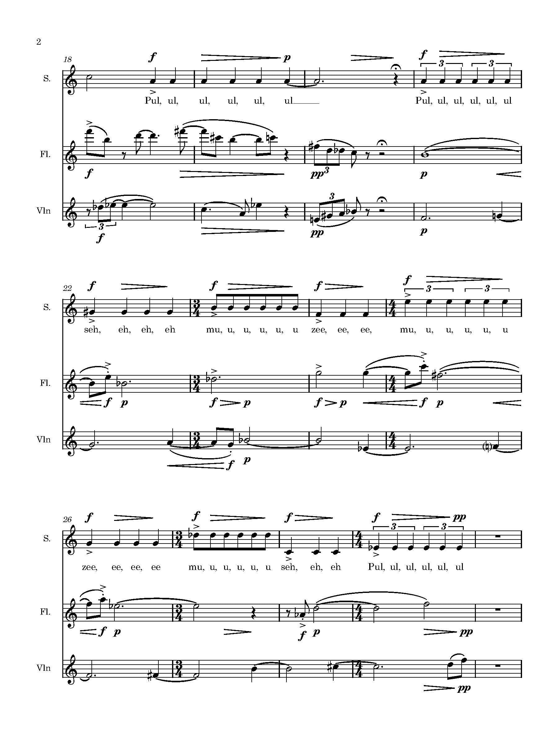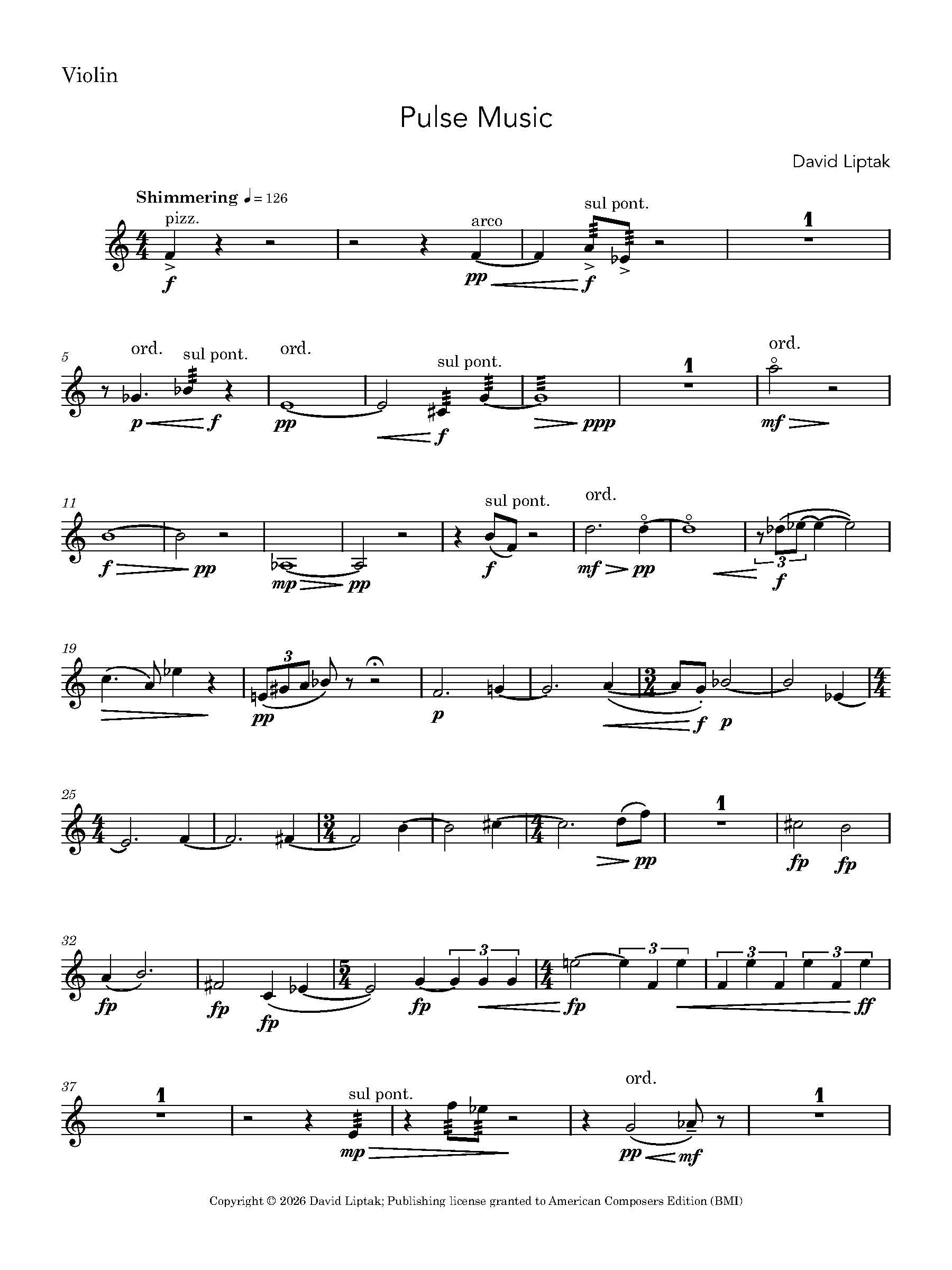 Pulse Music, for soprano, flute, and violin, was written for student performers from the University of Illinois Contemporary Music Ensemble. The three parts are equal in importance, and the soprano part is set to syllables derived from the title or other phonetic sounds and effects. The “pulse” is always present, but not always regular. It weaves its way forward with stops and starts, changing its pace along the way.