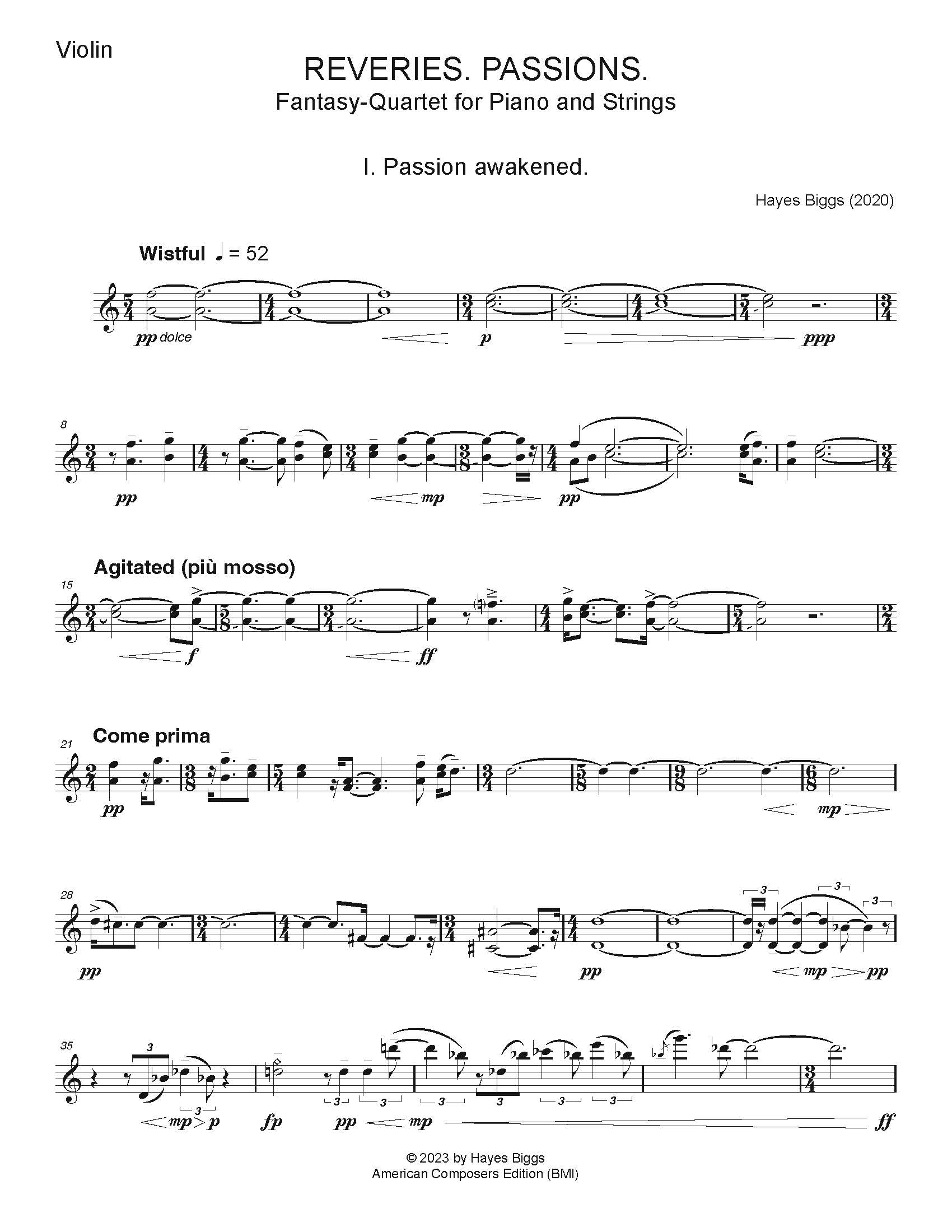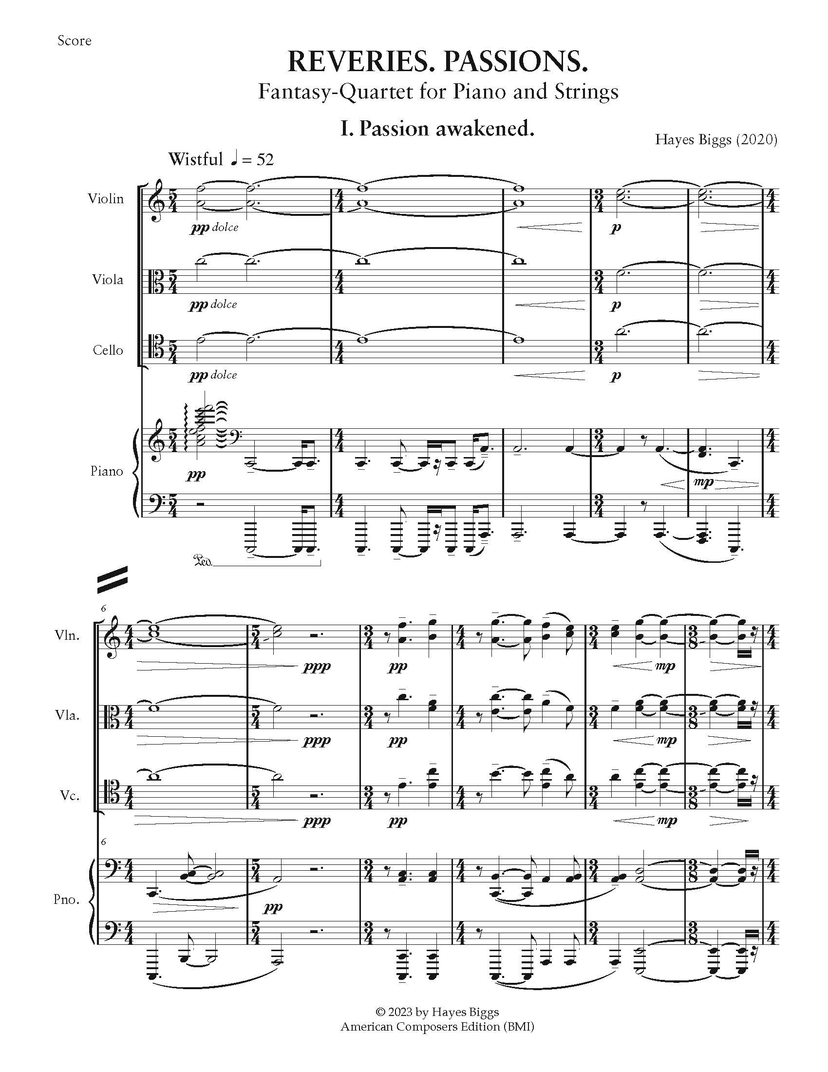I. Passion awakened. The first movement, bearing the indication “Wistful,” starts softly and tentatively and becomes increasingly agitated, building to an outburst in the cello, marked appassionato, accompanied by tremolo figures in the other instruments. Once this has subsided, a lyrical tune is introduced in the viola and developed, ultimately leading to a recapitulation of the opening material and a subdued, somewhat austere and desolate sounding coda.