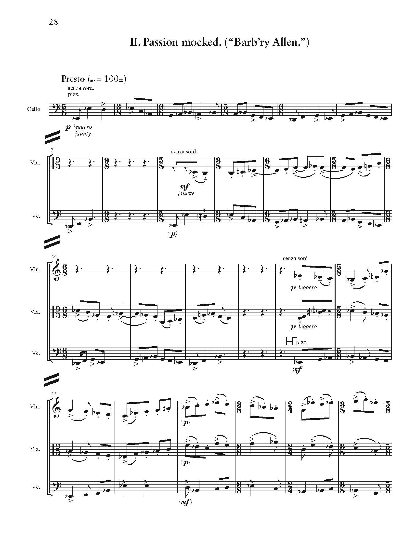II. Passion mocked. This scherzo is a flippant, sardonic take on the folksong “Barb’ry Allen.” The lyrics of that song — which with the right performer can be a very sad, beautiful and moving one — concern a young woman spurning the love of her suitor, who lies on his deathbed. She is angry that he once slighted her while drinking toasts with and to his friends at a tavern, and on her arrival at his bedside she greets him coldly with the words, “Young man, I think you’re dying.” After she leaves and the young man proves that her observation was indeed correct, Barb’ry Allen hears his funeral bells tolling and dies of a broken heart. In many versions of the song, the two end up buried in the same churchyard, and a rose growing from his grave intertwines with a briar growing from hers in a “true lovers’ knot.” My treatment of the song ignores these more heartwarming parts of the story.