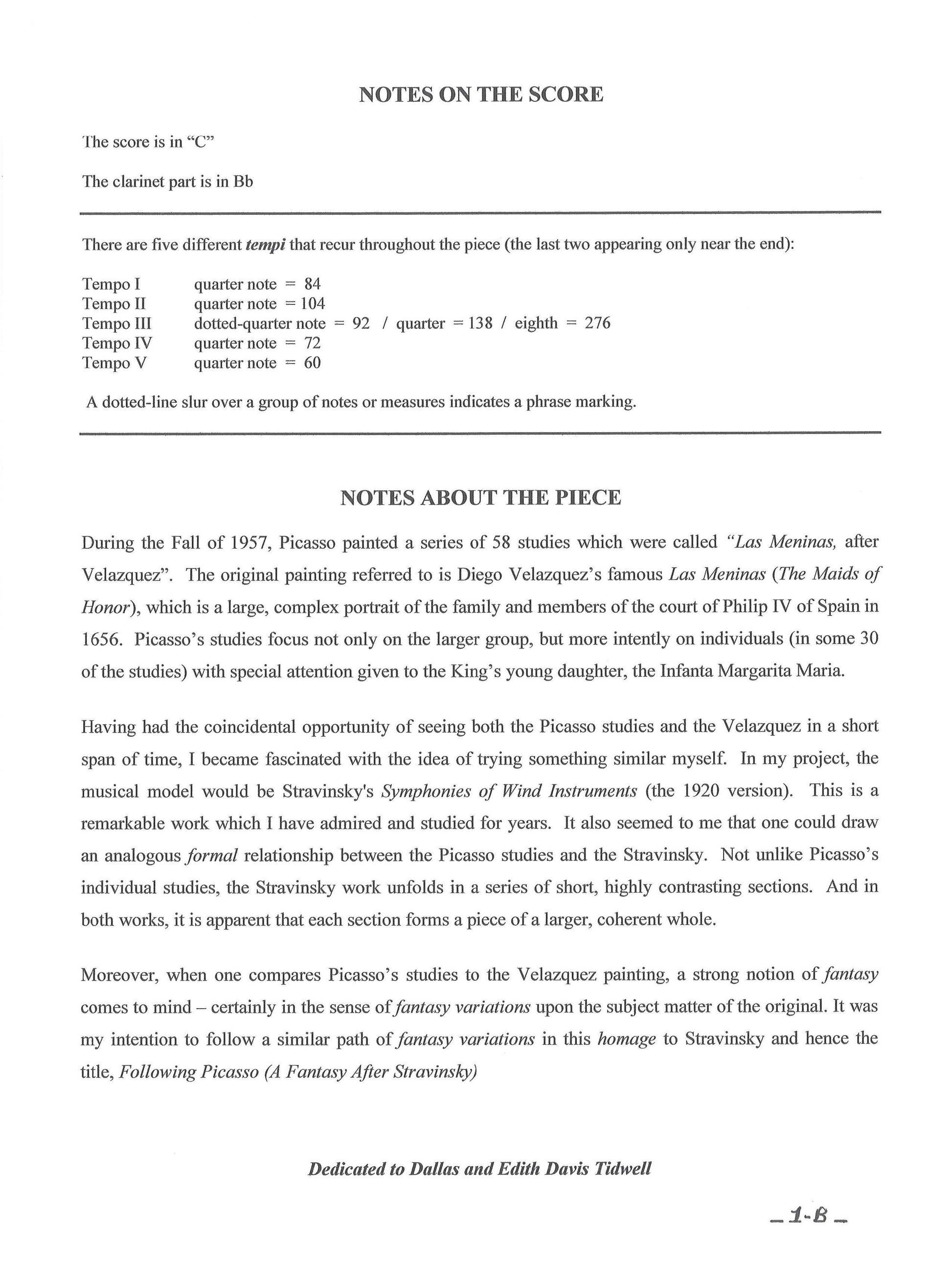 On vacation in Spain, Rhodes had the coincidental opportunity to see Diego Velazquez's famous painting of the family and court of King Phillip IV of Spain, Las Meninas, as well as Pablo Picasso’s 58 studies on the work, Las Meninas, after Velasquez. Inspired to follow a similar process, Rhodes selected Igor Stravinsky’s Symphonies of Wind Instruments as his musical model - a work, like the Picasso studies, that is constructed from short, highly contrasting sections that are nevertheless clearly part of a cohesive whole. When looking at the Picasso studies, a strong feeling of fantasy came to Rhodes’ mind, and he chose to follow the same path with regard to his musical study of Stravinsky’s Symphonies of Wind Instruments; hence the title Following Picasso (A Fantasy after Stravinsky).