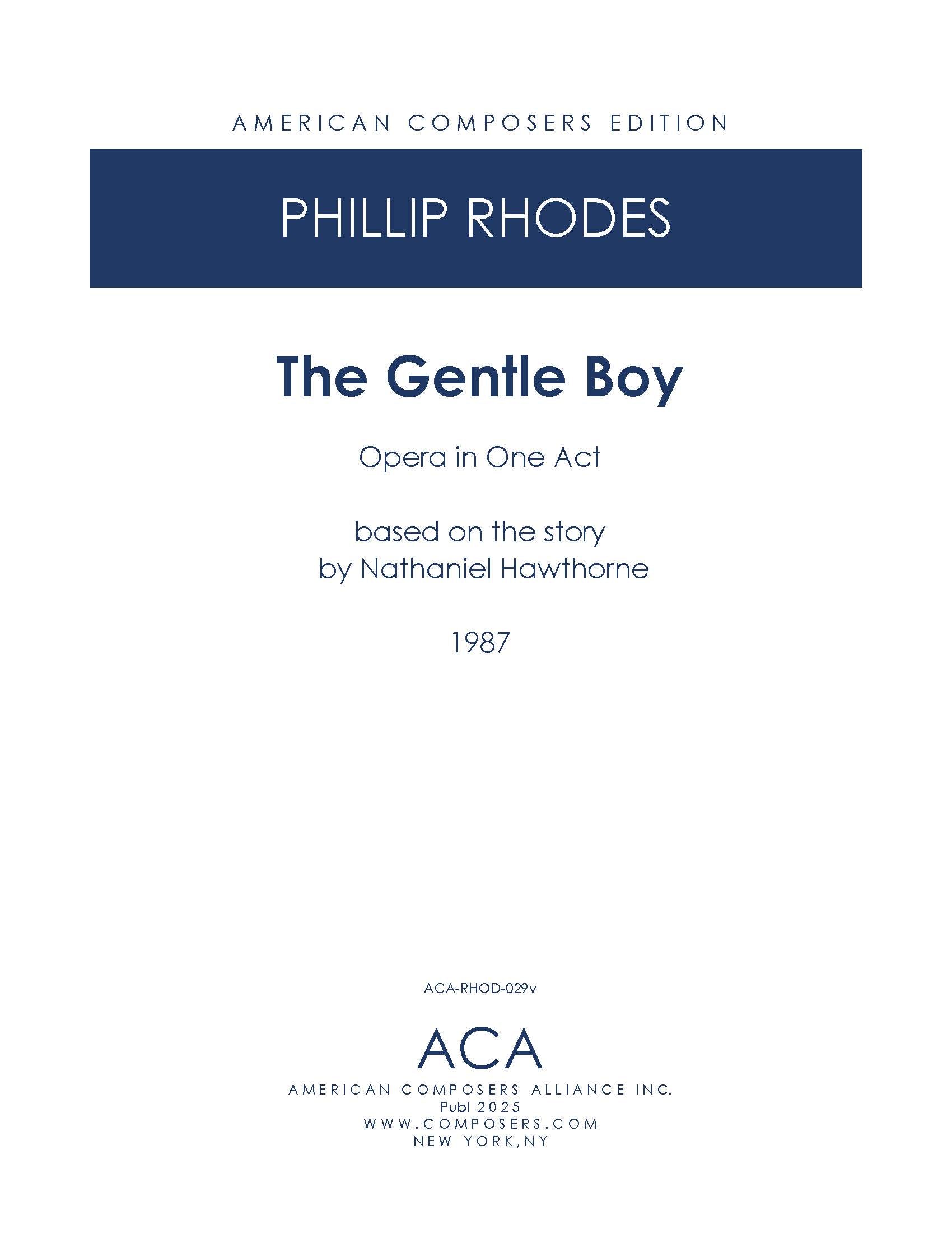 1980, revised 1987 Composer's note: The One Act Opera, THE GENTLE BOY, was the project for which I was granted a Guggenheim Foundation Fellowship in 1979-80. It is the first of a pair of one-act operas based on short stories by Nathaniel Hawthorne. THE GENTLE BOY is a tragic story about the persecution of the Quakers by the Puritans in 17th Century Massachusetts and the death of a young boy. THE GENTLE BOY was the winner of the National Opera Association Prize for a New Chamber Opera in 1986. (Its companion piece, on the other hand, is a “comic” opera called THE MAGIC PIPE (1990) based on the Hawthorne story called “Feathertop.” THE MAGIC PIPE was one of three finalists in the National Opera Association competition in 1992.)