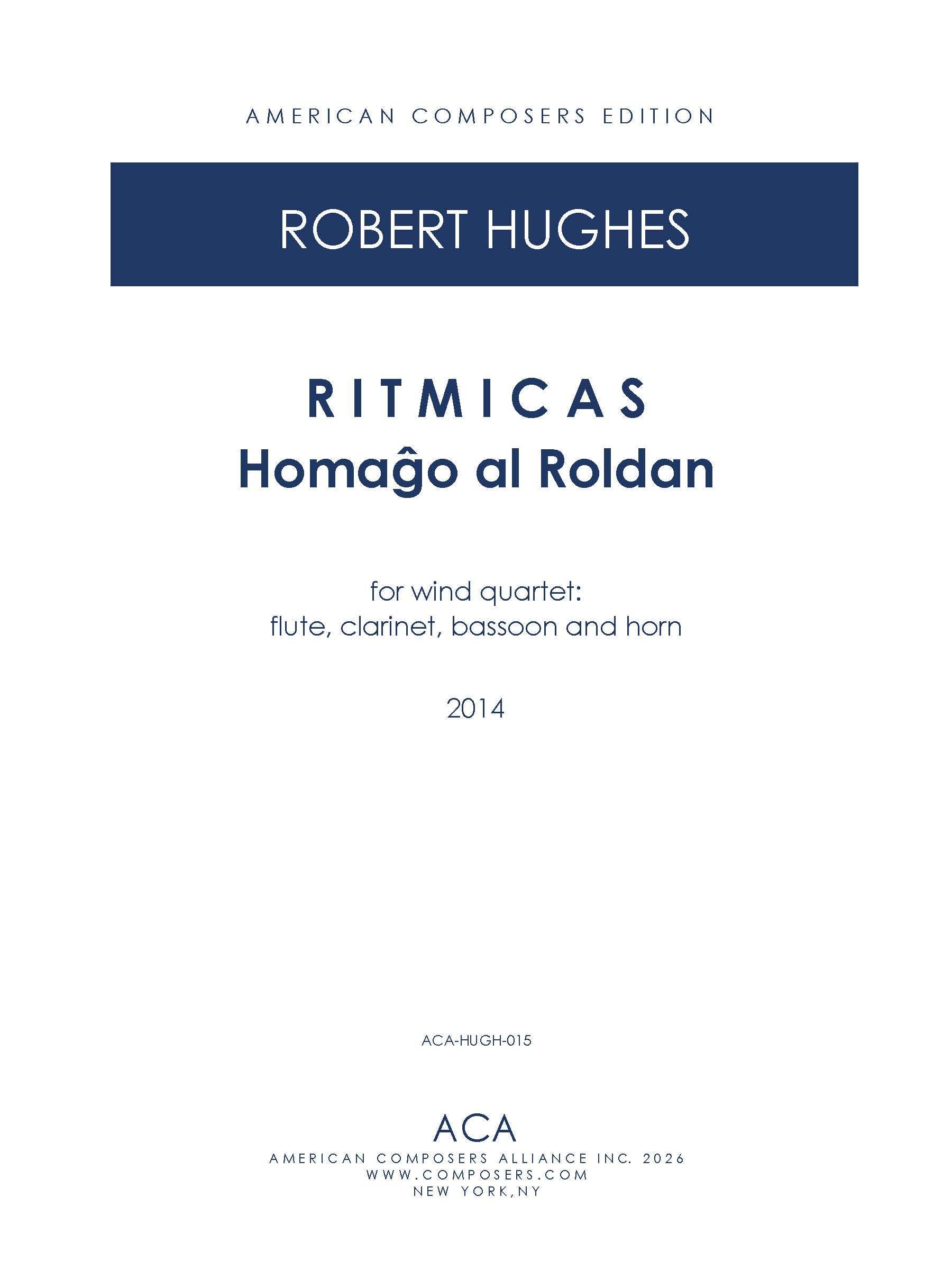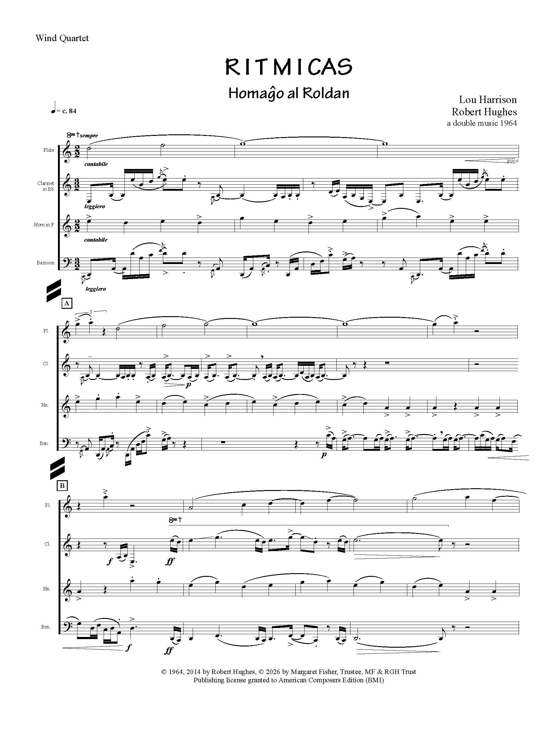 As indicated by the subtitle, written in Esperanto, it is an homage to the Cuban composer Amadeo Rold y Gardes (1900–1939), who had written four Ritmicas for winds and piano in 1930. Hughes composed the parts for flute and horn, and Harrison composed the parts for clarinet and bassoon. The work certainly emerged from Harrison’s lessons for Hughes, as the interest in both Esperanto and exposure to Roldán’s music originated with Harrison. Originally a quintet, the work remained unplayed until the 1990s when Hughes premiered it as a wind quartet while touring with the ensemble on an Alaskan cruise ship.