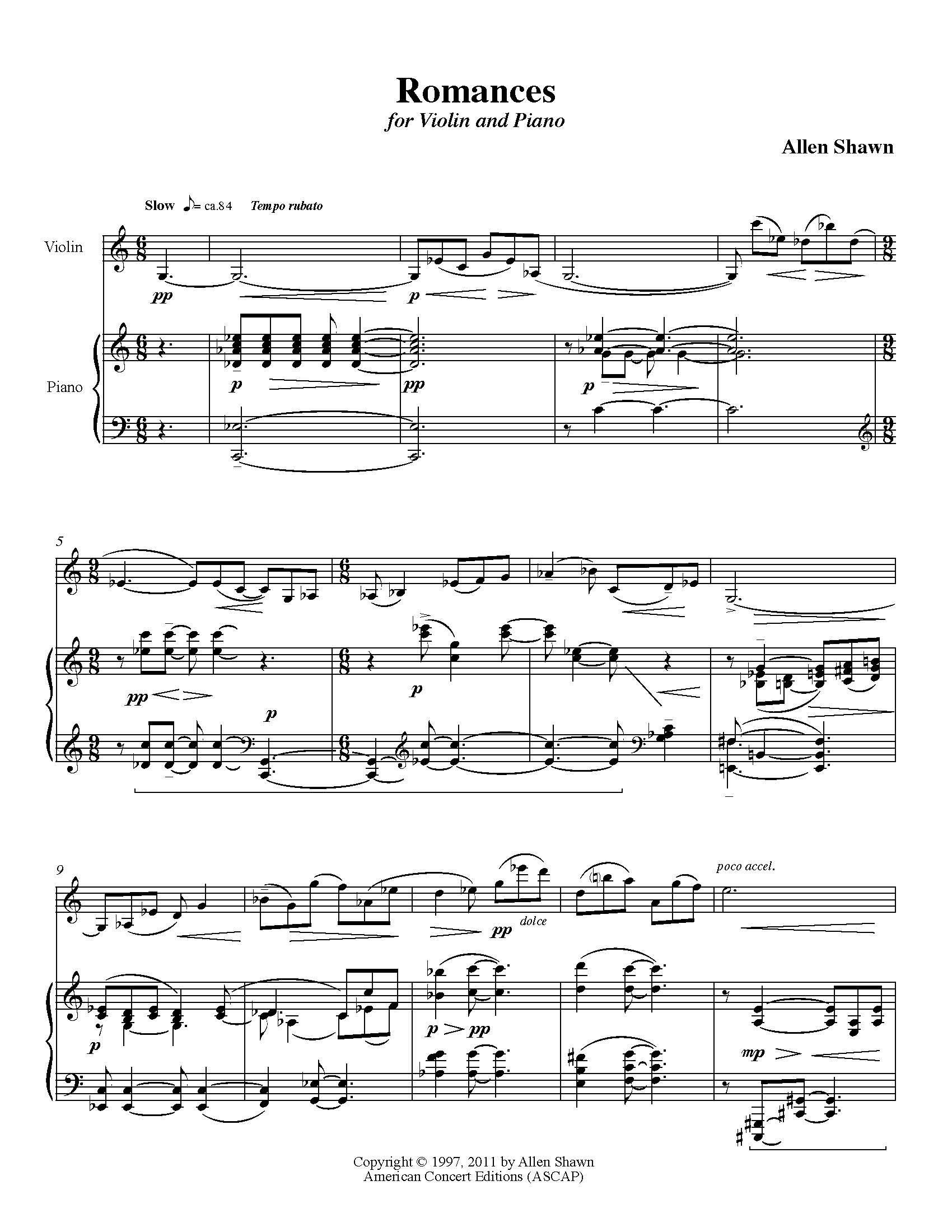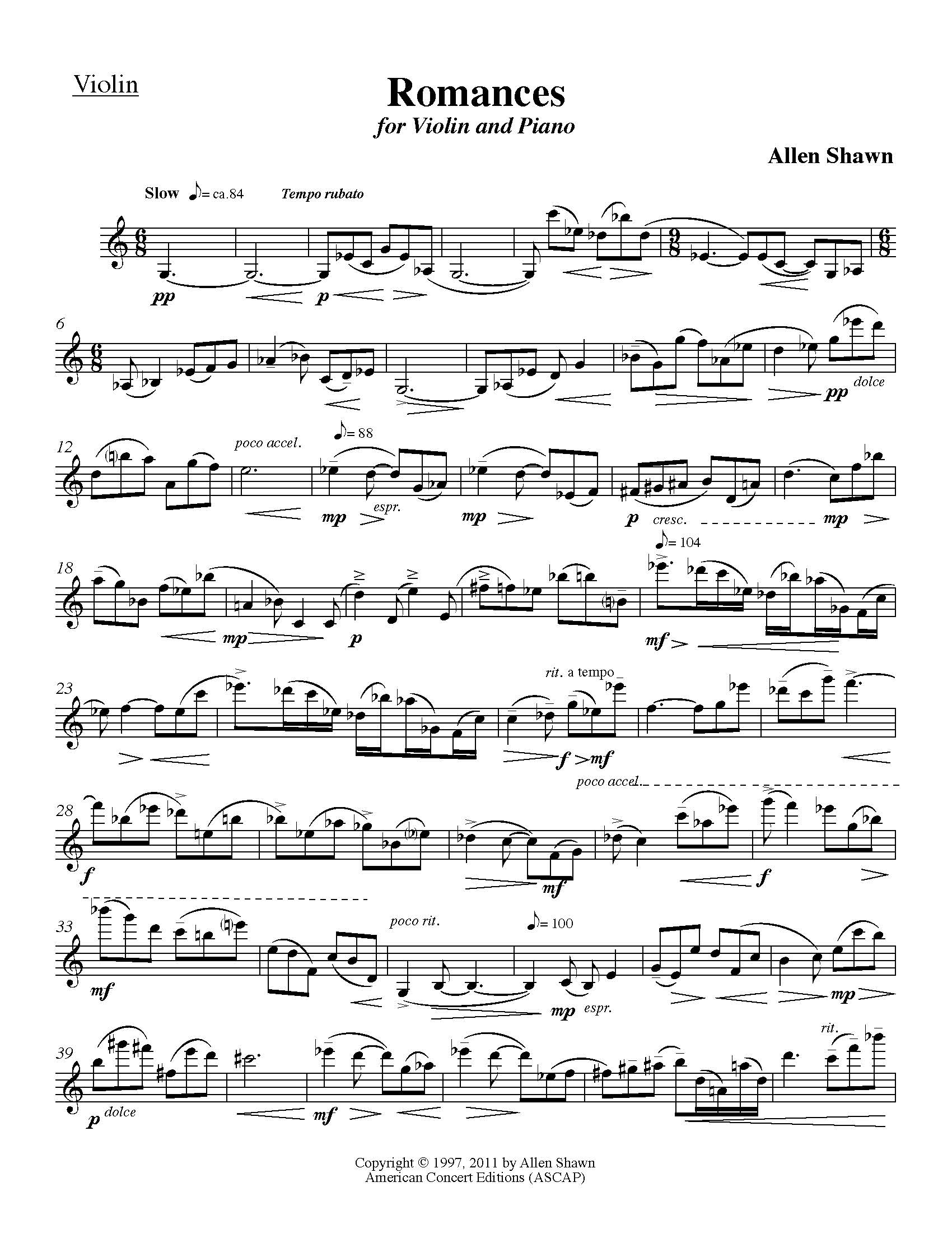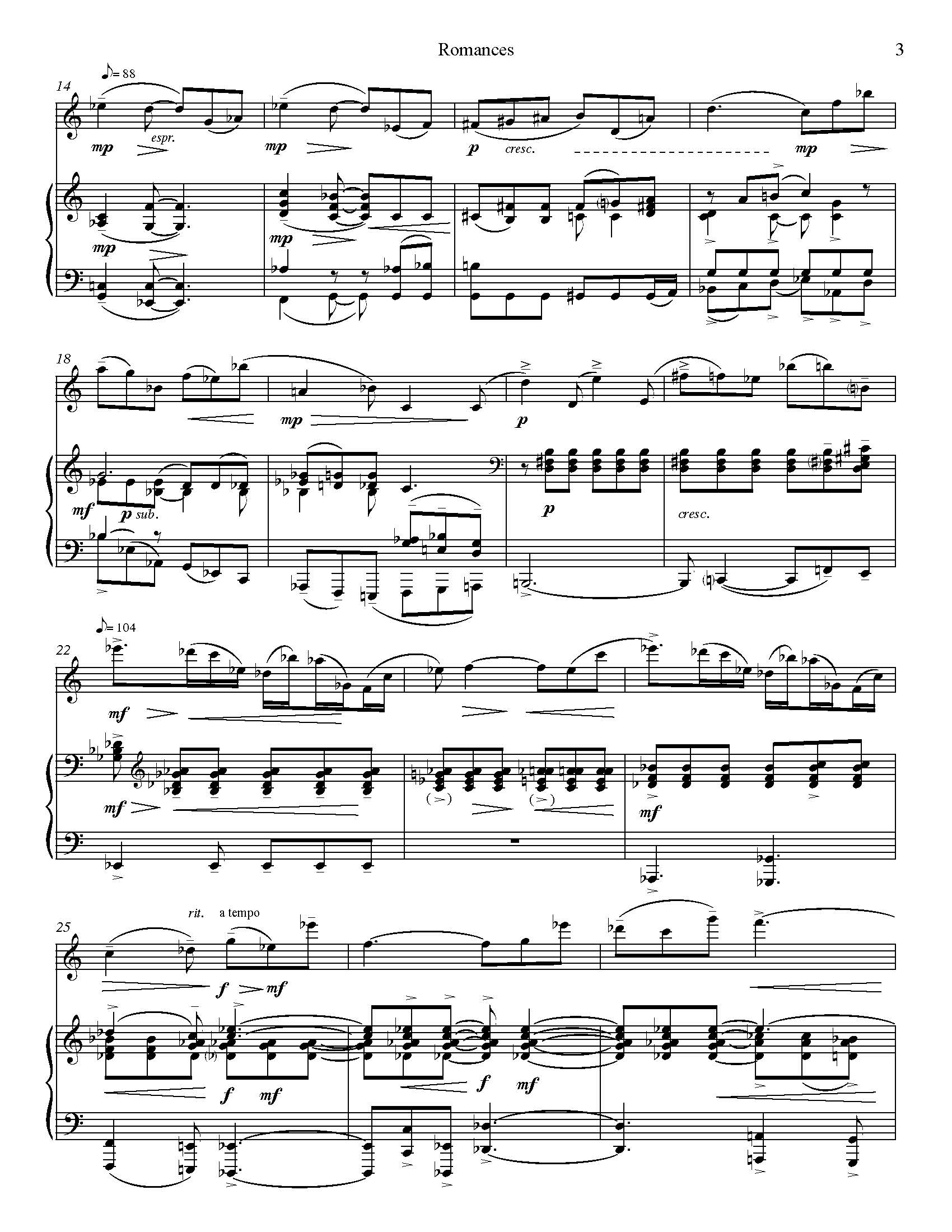 "Romances" was written in Winter 1996 at Yaddo artist colony. It was dedicated to Jamaica Kincaid (to whom I was married from 1979-until 2001). It is a single movement piece lasting fourteen minutes, in three distinct sections (slow-fast-slow) that could be viewed as three aspects of a love relationship, three romances, one romance interrupted by another--or, if one prefers, simply as a piece of music. The three part form is not a traditional "ABA" structure, but is a progression. The music of the first section is like a long rhapsodic Aria, full of youthful longing and ardor. In the middle section one might hear adventure, dialogue, and quarrels. The music of the final pages is not a return to the beginning, but has a more intimate, searching, resigned and mature character.