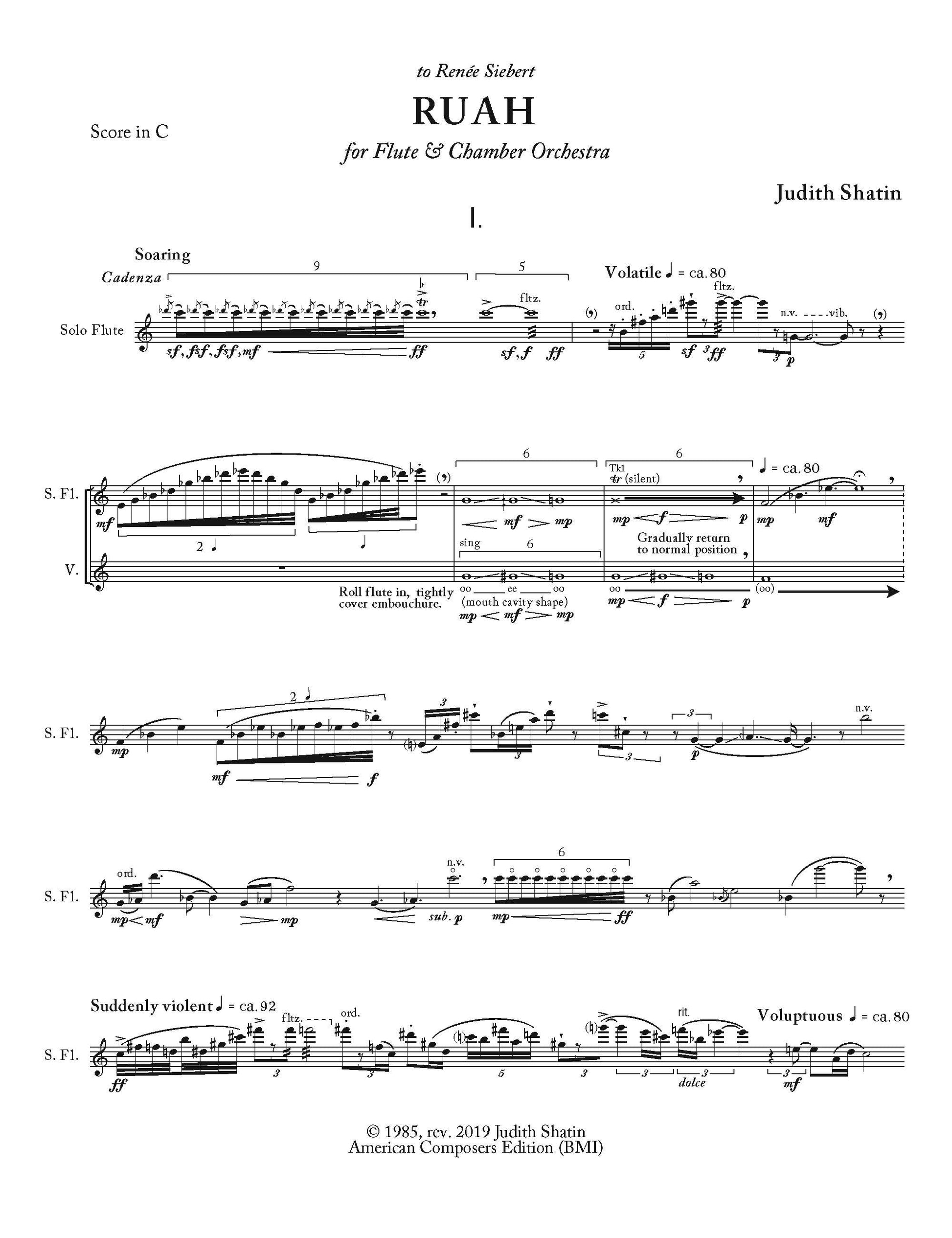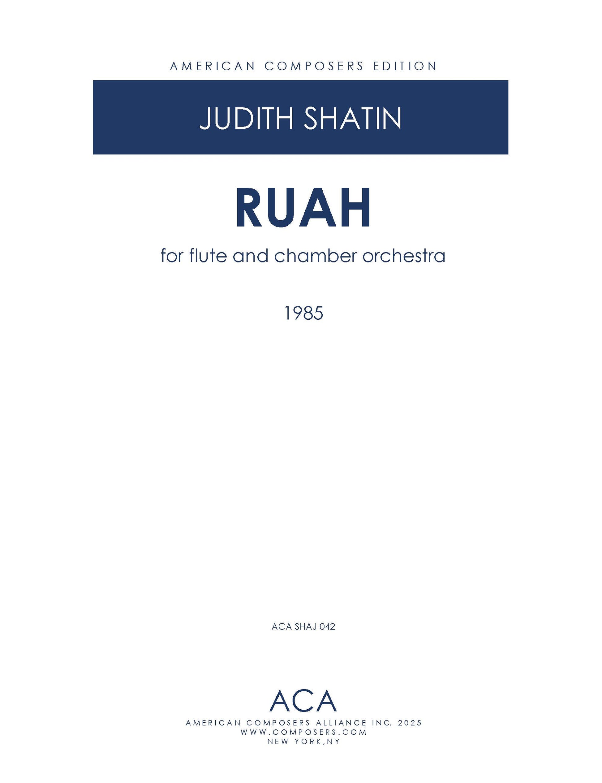 Ruah, with the ‘h’ pronounced like the ‘ch’ in Bach, is a flute concerto inspired by the Hebrew word that translates as air, wind, or breath. In Cabalistic mysticism it also refers to the part of the soul that mediates between the body and the spirit. Both the colloquial and spiritual meanings are at work here. The images of breath and air inform the timbral stretching of the flute's sound, with the flutist using the voice and its breath flow in conjunction with played tones. The image of the wind is captured particularly in the swirling lines of the first movement, marked Soaring, and in the third, titled Impassioned. The second movement, Tender emerges from a dynamic stillness, with far-flung registral limits, and large internal spaces. Its three-part organization mirrors the larger-scale three movement plan of the entire piece. The final movement is a more furious spin through space, and reflects a more tightly wound, assertive character than the first two movements. However, it also refers to them. The spiritual reference is embodied in the role of the flute as it variously springs forth from and mediates between the instruments of the ensemble. Ruah was composed for flutist Renée Siebert, who premiered and recorded it for the CRI label with the Prism Chamber Orchestra, conducted by Robert Black. Its composition was made possible in part by an NEA Composer Fellowship and by a residency at the Virginia Center for the Creative Arts. This version of the piece includes a percussion part which I added at the request of conductor Timothy Weiss for a premiere performance by the Aspen Contemporary Ensemble at the Aspen Music Festival on August 3, 2019. It may be performed in either version.
