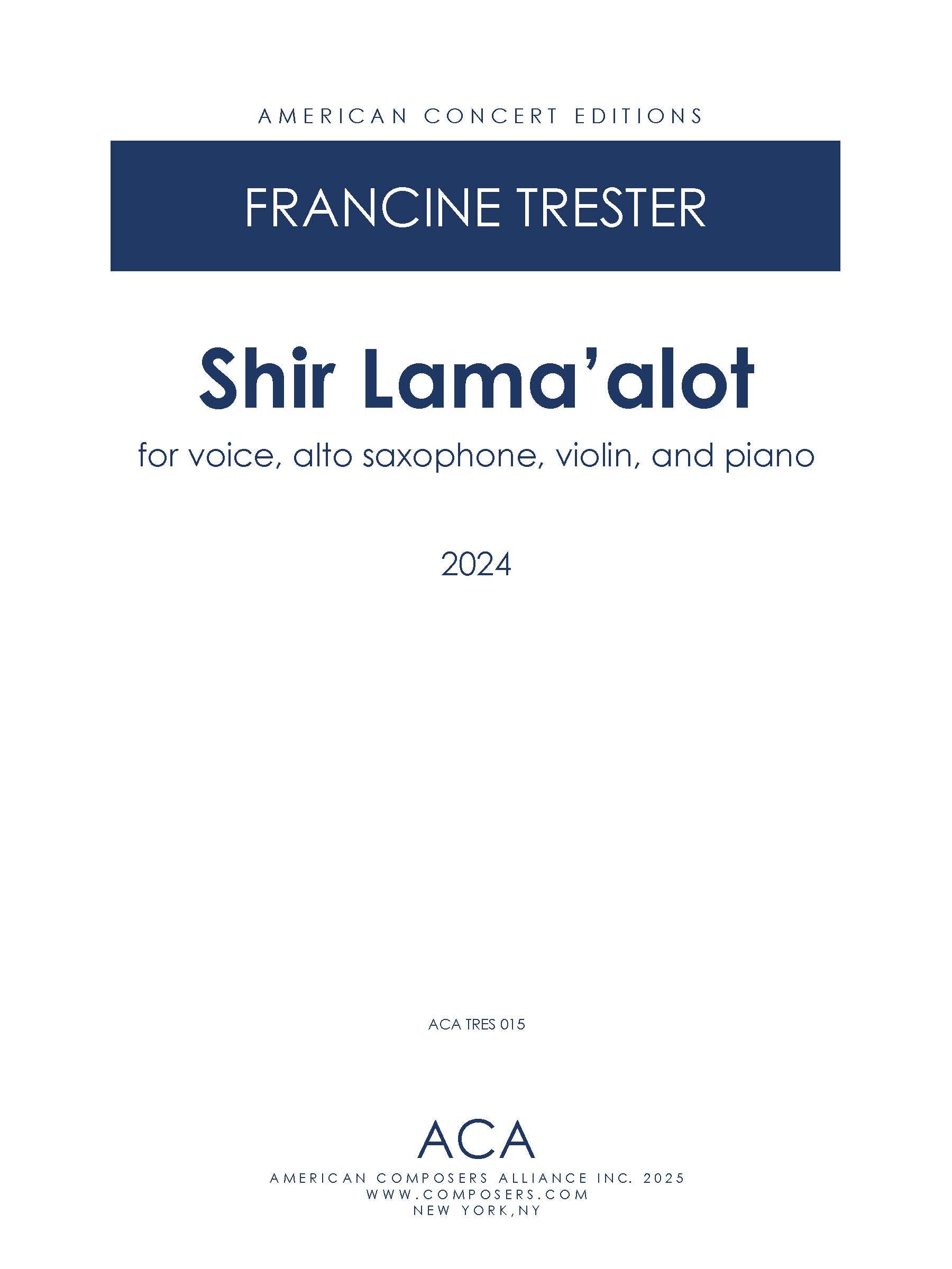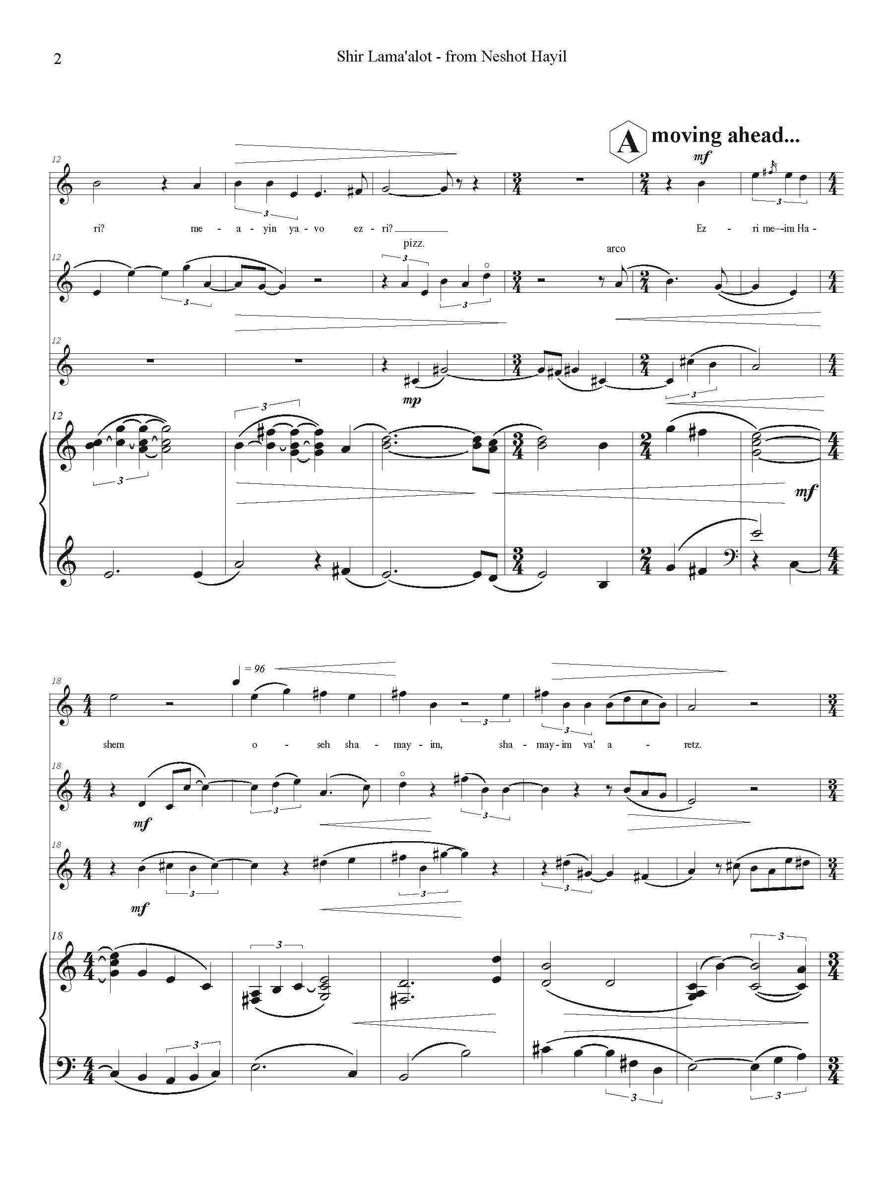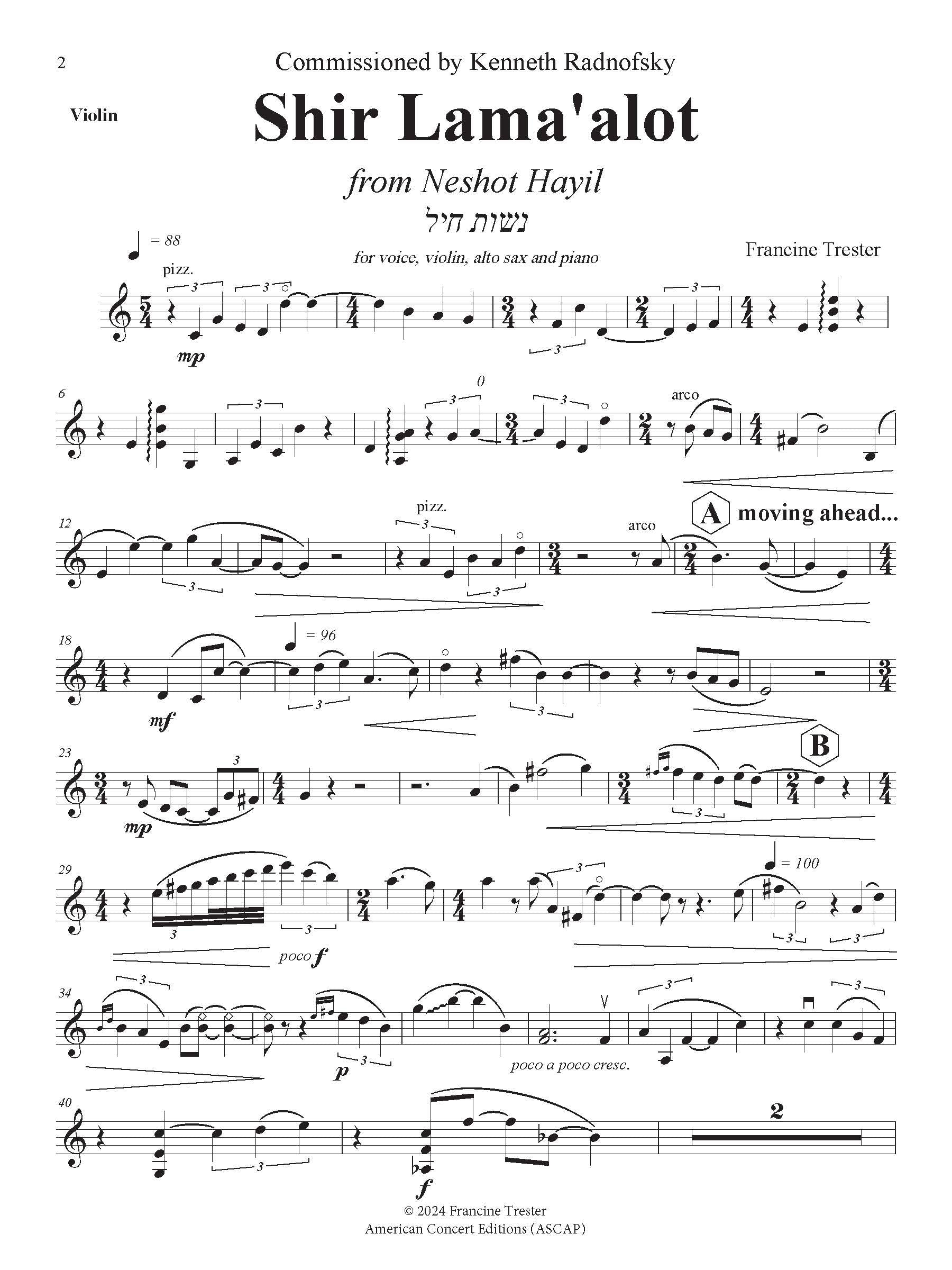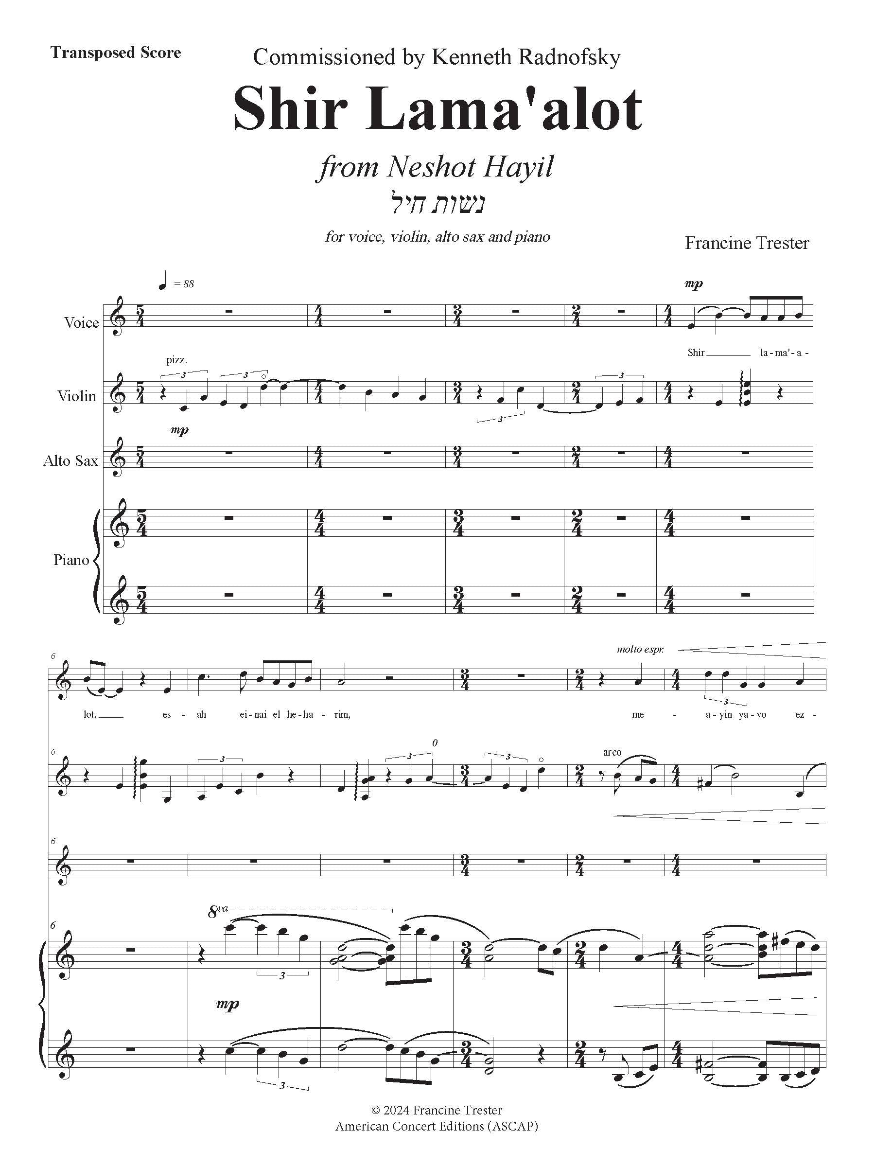 “Shir Lama’alot” is the second of three songs in composer Francine Trester’s "Neshot Hayil" (Women of Valor). The cycle was commissioned by saxophonist Kenneth Radnofsky and is a piece based on Jewish texts that honor women. Violet Gilboa Radnofsky, curator of the Harvard Judaica Division at Harvard University Library, chose the three texts of "Neshot Hayil." In the program notes from the premiere performance, Radnofsky writes: “’Shir Lama’a lot,’ written by King David, about 3000 years ago, asks help from God at a time when the Jewish people were in horrific pain during war in Gaza. All three poems have been sung or chanted in prayers around the world by Jews (both Ashkenazim and Sephardim) from the time they were written and up through today.”