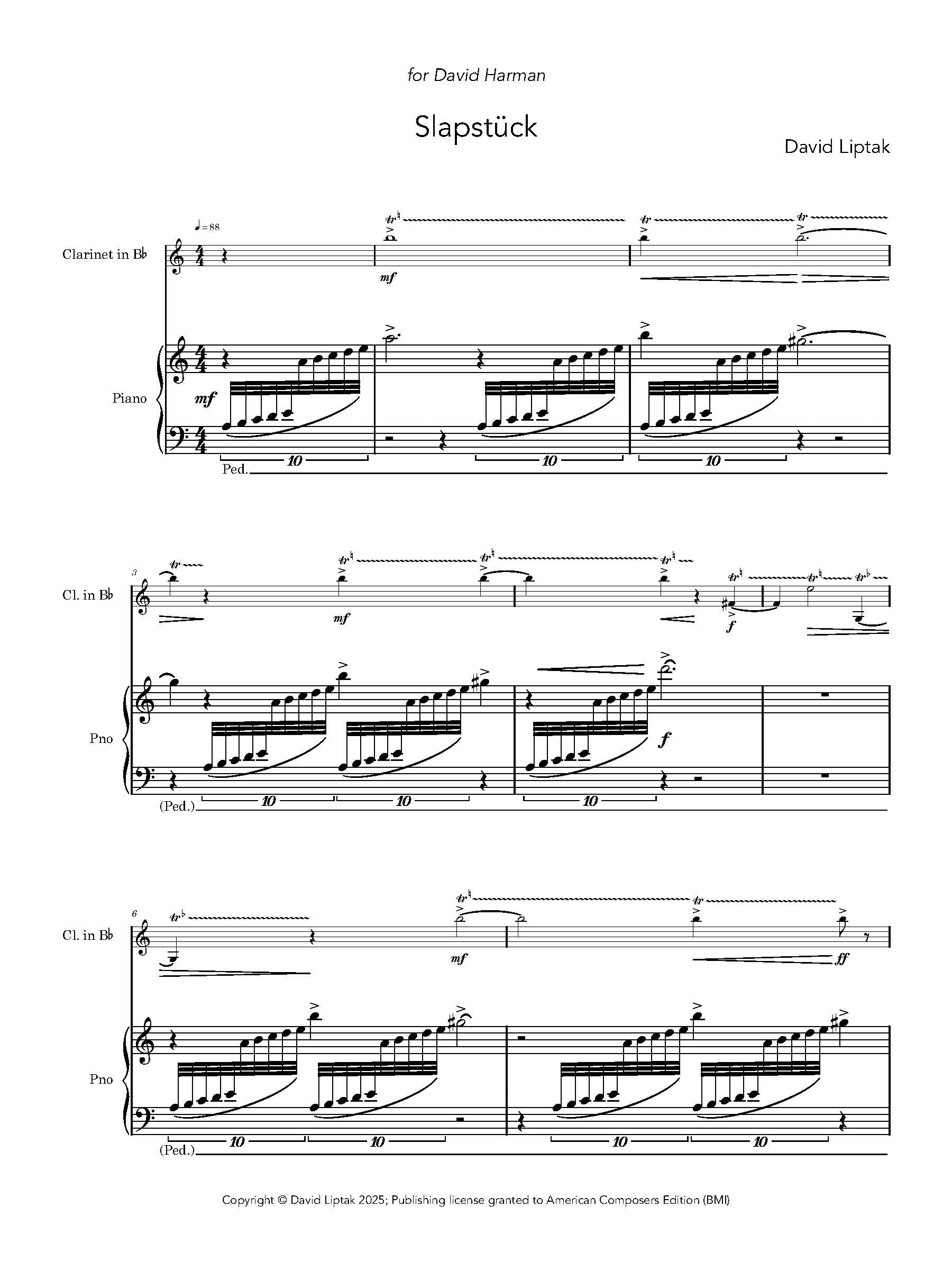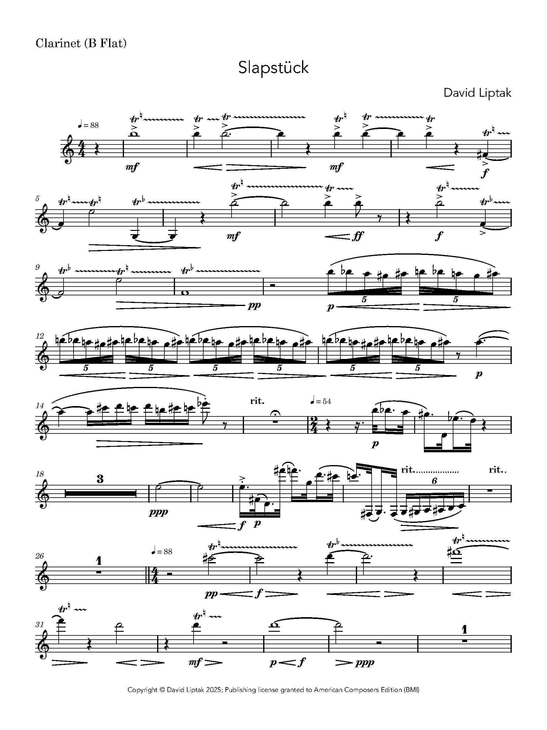 Slapstück, for clarinet and piano, was completed in the spring of 1977. Inspired by slapstick comedy, Warner Bros. cartoons, ragtime, and the multitude of incongruities found in 20th-century concert music, Slapstück presents a surreal cross-section of these influences within the context of a more-or-less unified composition. The work features an abundance of trills for the clarinet, glissandos, clusters, and a mix of different styles. Slapstick was premiered in Paris in June, 1977 by clarinetist David Harman and pianist John York.
