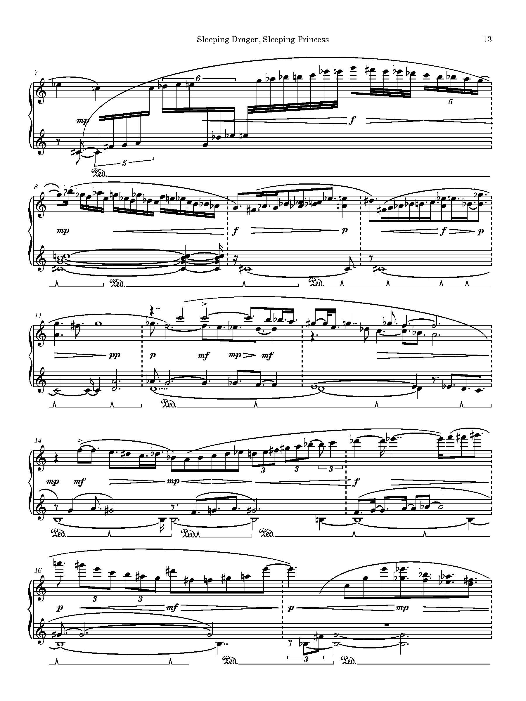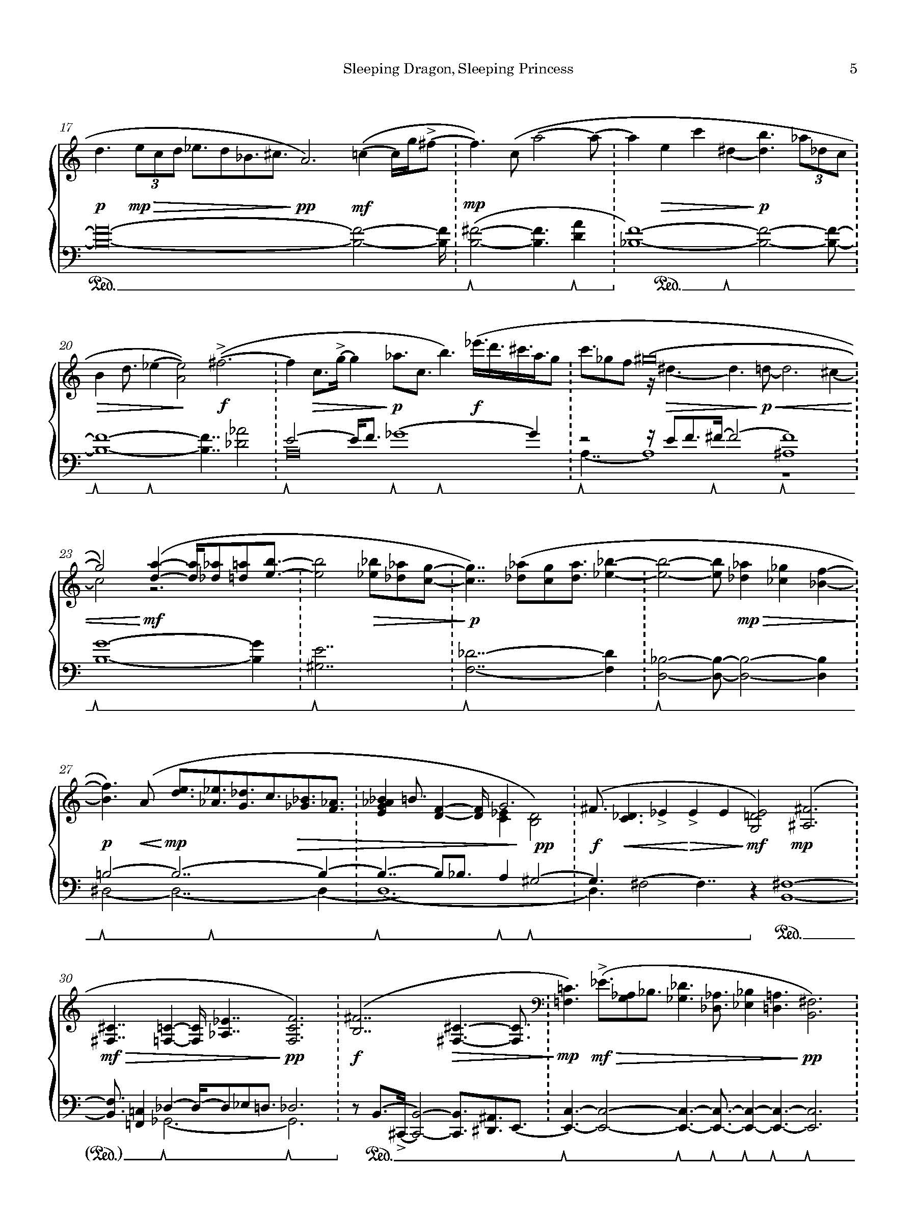 Several years later, after producing several solo piano albums, I decided to try to transcribe some of the tracks.  Because of their amorphous character rhythmically, this turned out to be a difficult task.  I tried many different written approaches to creating not only the music but its note-to-note intuitive character.  After 10 or 15 years, I finally landed on the notational approach which is featured in these two pieces.  Each note is given a real time rhythmic pulse which preserves the original performed values while allowing me to group and phrase the music coherently.  With no coherent pulse or meter, the length of the notes become intuitive.  The strict vices of rhythmic performance are loosened and the music begins to form by itself.