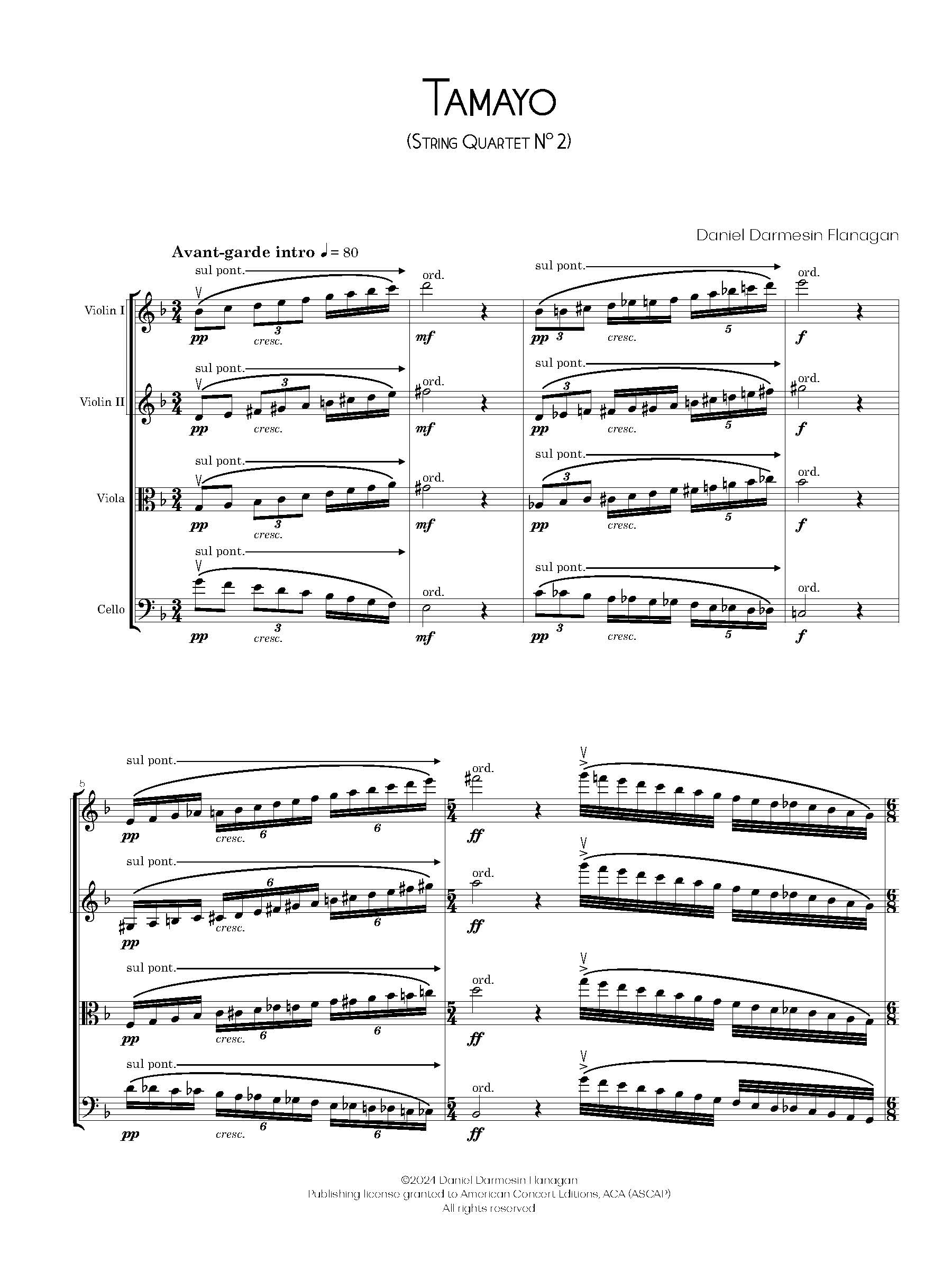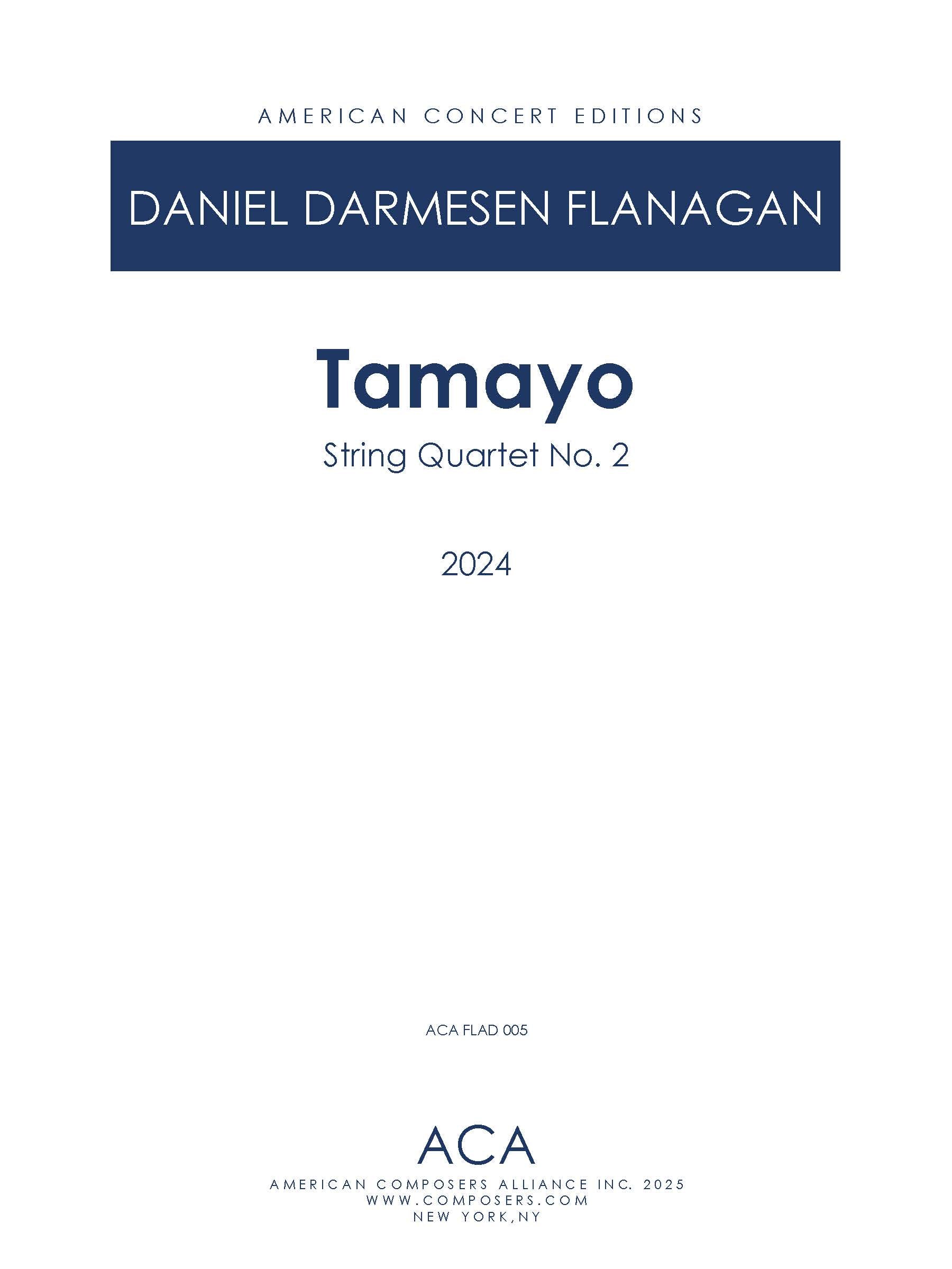 Tamayo is the second string quartet by Daniel Darmesin Flanagan. Originally written for string trio, it was composed in 2024 for a performance by Trio Solano at the Crocker Art Museum in Sacramento, California. The piece was reconfigured for string quartet shortly thereafter. The work is inspired by Rufino Tamayo’s painting Laughing Woman, in the permanent collection at the Crocker, and is part of Flanagan’s project, “The Bow and the Brush.” The mood of the piece, like the mood of the painting, is a combination of vibrance, silliness, and fun. After a splattering introduction of dissonant scales, the humor begins with a limping bluesy melody. This tune gets passed between players, interspersed with jovial digressions, gradually picking up speed and volume until the introductory scales return for a dynamic finish.