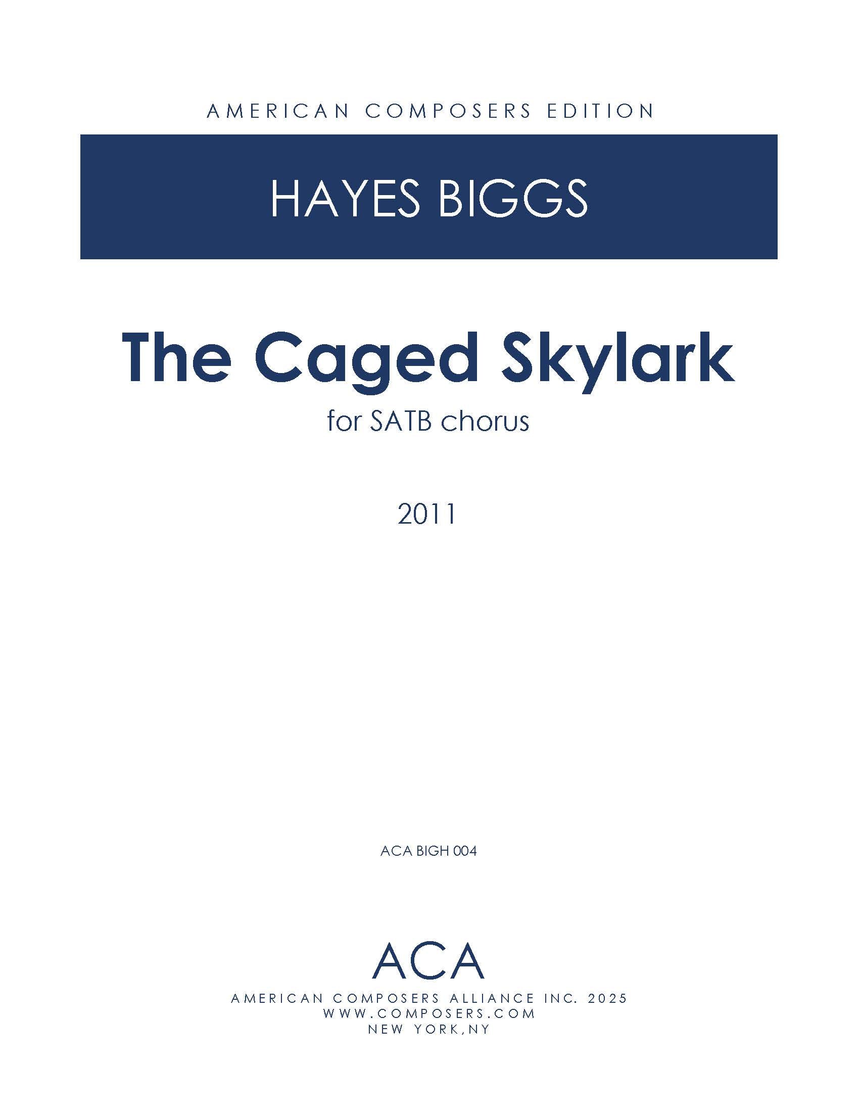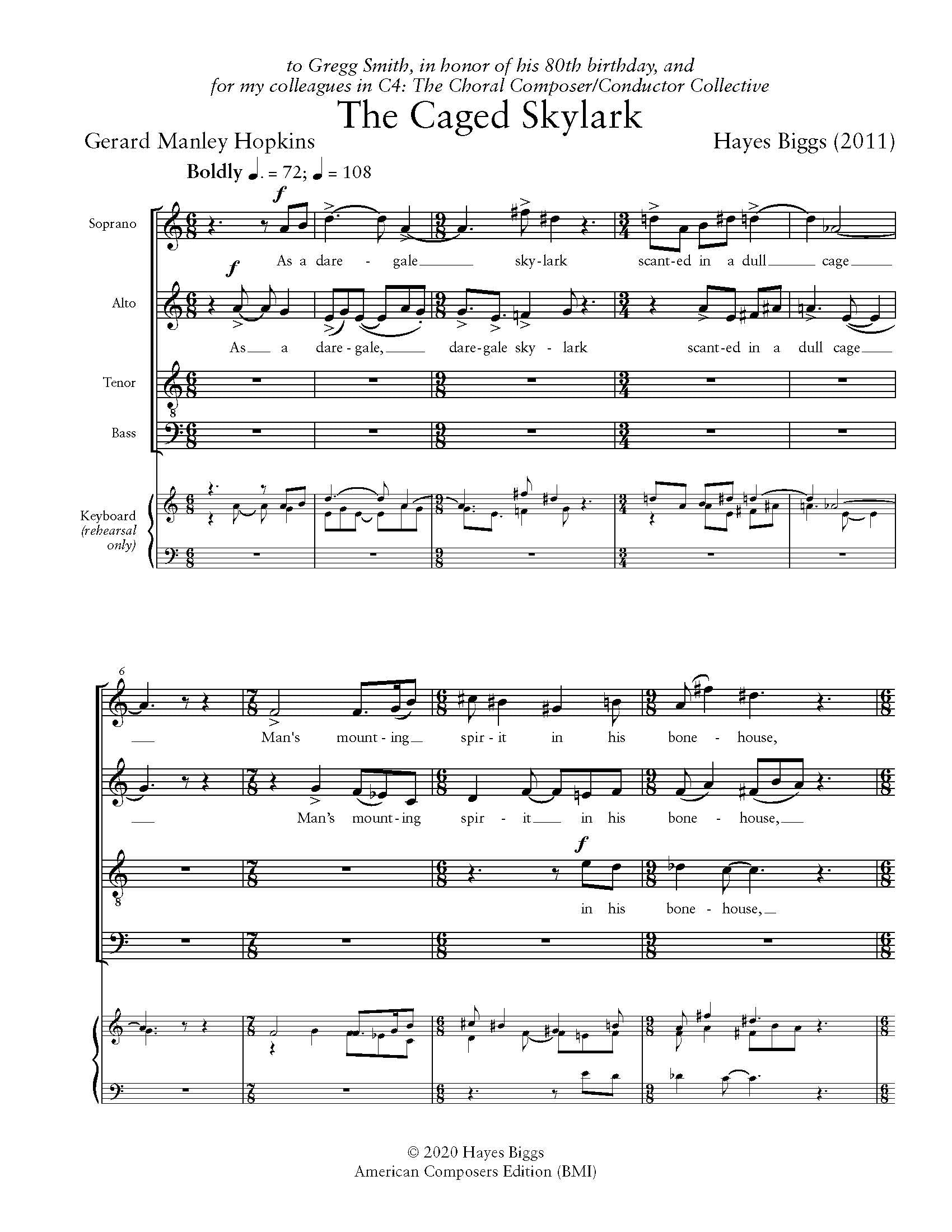 My setting of Gerard Manley Hopkins’s The Caged Skylark was begun in the spring of 2011 and completed in August of the same year. The piece is dedicated to Gregg Smith, in honor of his eightieth birthday and with deepest thanks for his unflagging commitment to and support of American composers over the past several decades.