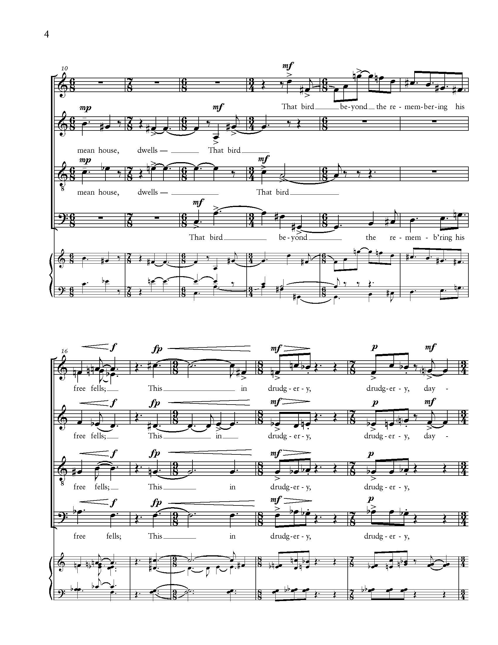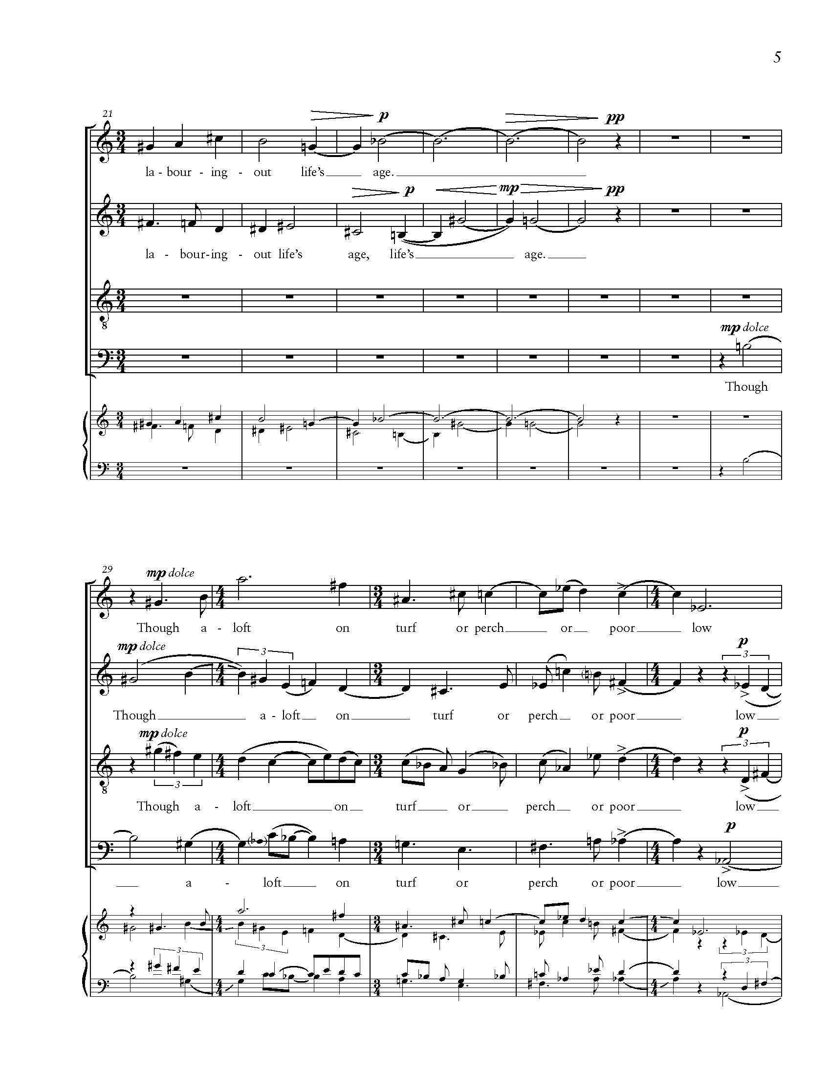 Hopkins (1844-1889), besides being possessed of a vision that made much of twentieth-century English poetry possible, was a convert to Roman Catholicism and a Jesuit priest. The Caged Skylark begins darkly, its first two stanzas juxtaposing the image of the brave, “dare-gale” skylark chafing against the confines of his “dull cage,” with the workaday drudgery of humans, imprisoned in their own earthly bodies. My setting begins with a duet for the sopranos and altos that suggests the aimlessness of the bird in his futile struggle against his incarceration, culminating in chordal “bursts of fear or rage” in the full choir, with the altos hanging on stubbornly after the other voices have abruptly been cut off.