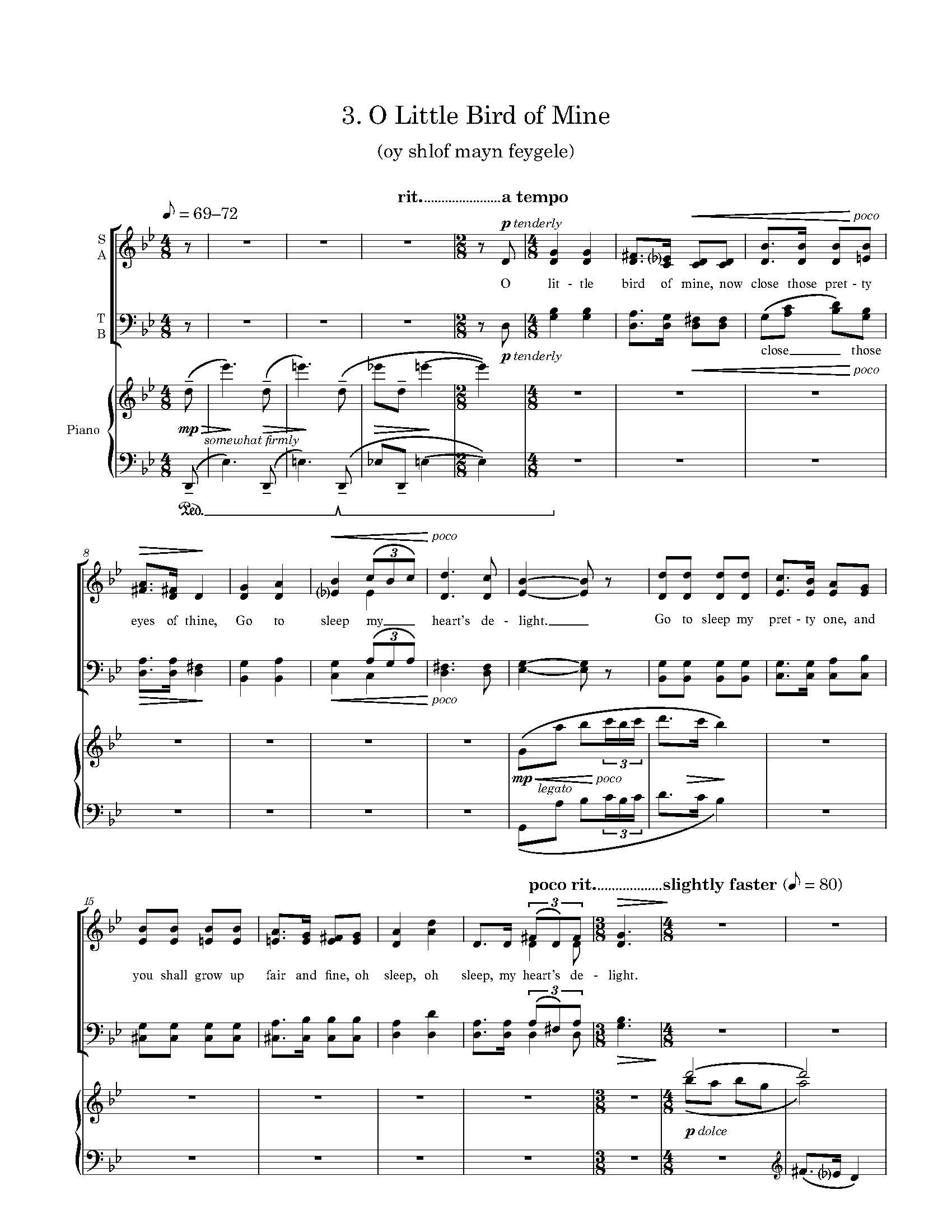 three lullabies is a three-movement work for mixed chorus and piano based on traditional Yiddish cradle songs. The work was composed in the fall of 1989 in Amherst, Massachusetts, for Richard Dubois, Professor of Composition and Choral Music at the University of Massachusetts Amherst and longtime director of the UMass/Amherst University Chorale.