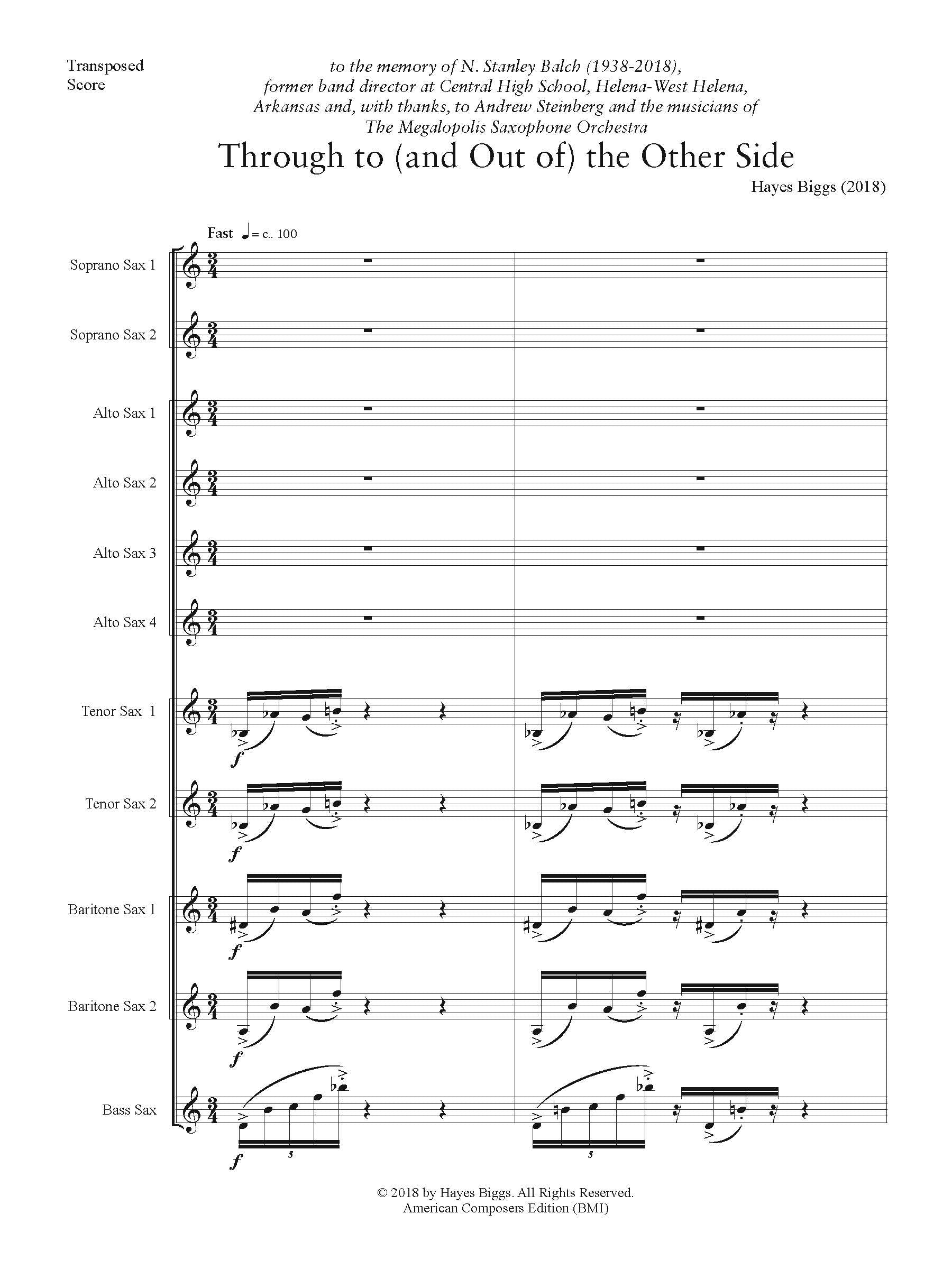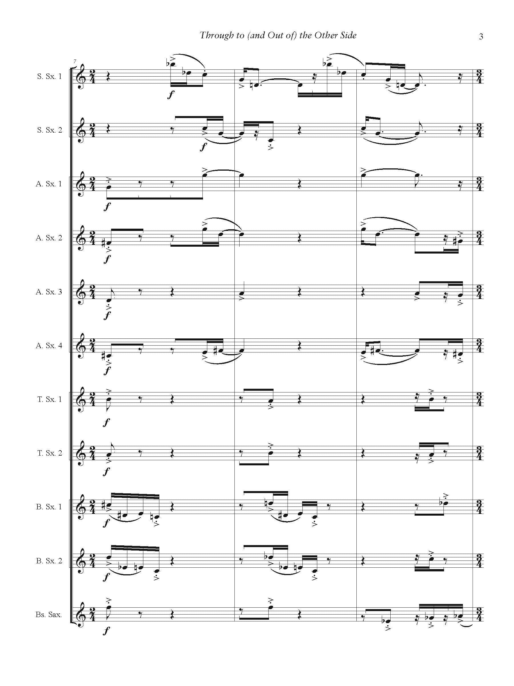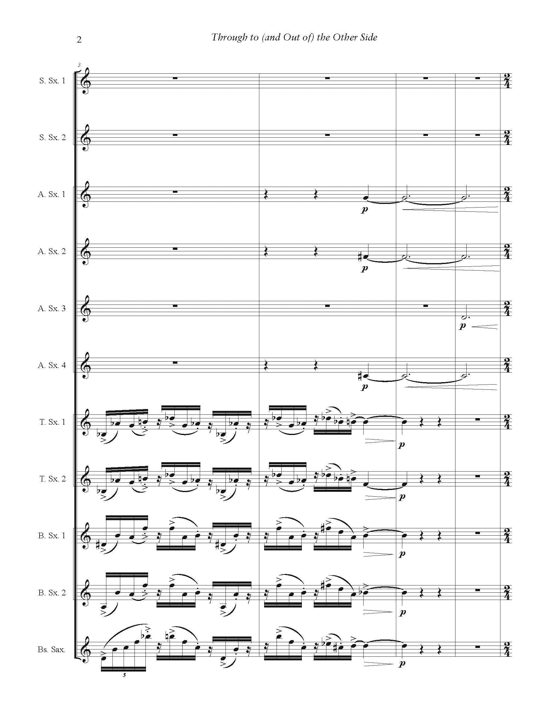 Through to (and Out of) the Other Side is in a single movement comprising several sections. The first is fast, syncopated and edgy, gradually morphing into a gigue-like rhythm. After a series of episodes this section gradually cycles back to the material of the opening, with siren-like wailing in the altissimo registers of the soprano and top two alto parts. A transition ensues, with some rock and jazz elements and a hint of bluesiness, interrupted from time to time by soft four-part harmonies marked “senza vibrato, ethereal, disembodied.” A very brief accelerando outburst yields to the heart of the work, a slow movement that is by turns lyrical and austere, with fairly large pauses interspersed, suggesting vast spaces. The opening sonority of this section is a simple simultaneous interval of a minor third (C to E-flat), which happens to be the opening sound of a haunting late work of Mozart, his Masonic Funeral Music. Not sure how this found its way in — it is not an exact quotation from Mozart’s piece — but somehow it did. After the climax of this section, a stark two part chorale for the entire ensemble asserts itself, before the mood is swept away by the final section in waltz tempo. Besides the Mozart reference, another piece, coincidentally also in the key of C minor,  wormed its way into my thinking at the end of this work: the Waltz No. 2 from Shostakovich’s Suite for Variety Orchestra, familiar to anyone who has seen Stanley Kubrick’s Eyes Wide Shut, where it accompanies the opening scene. Again, there is no direct quotation, and this reference, such as it is, is even less obvious than is the case with the Mozart. The overall trajectory of my piece seems to travel from a more upbeat, if rambunctious opening, through a much more introspective passage, ultimately returning to a mood similar to the opening, with perhaps more of a satirical cast.