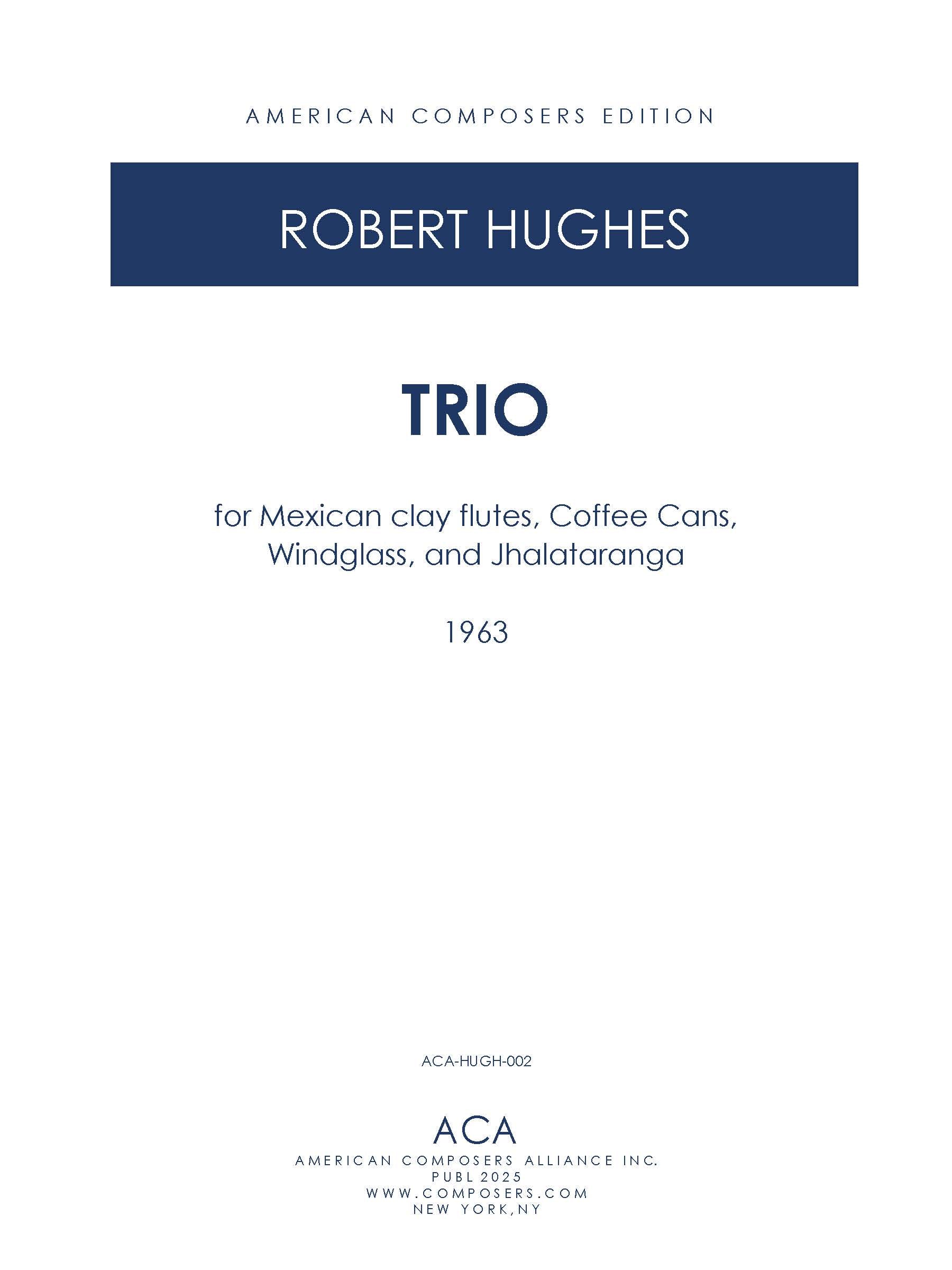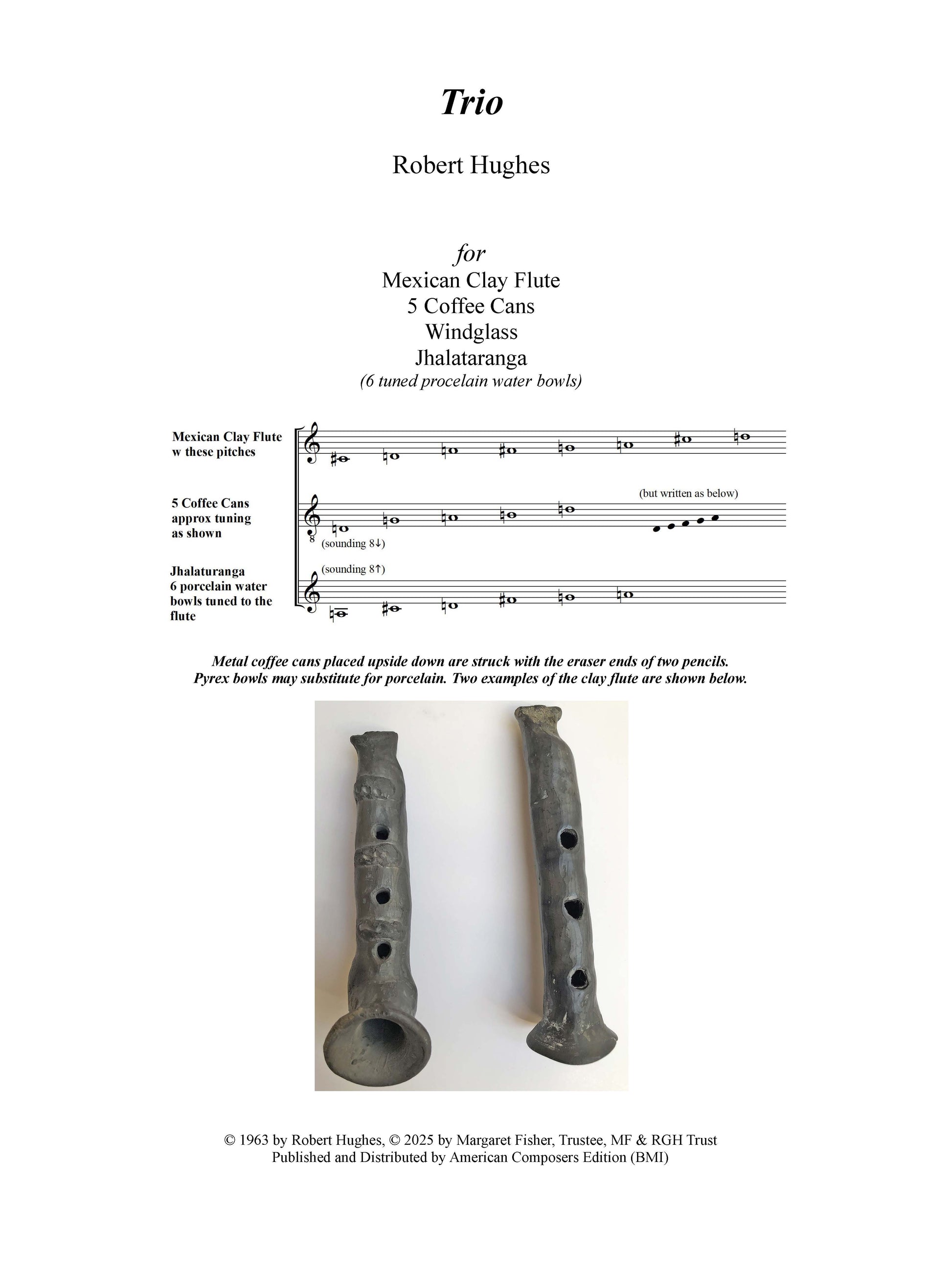 Trio had its premiere in concert version on October 6, 1963 at the legendary Old Spaghetti Factory in North Beach, San Francisco, with the composer on Mexican clay flute. In a rare music review written after leaving New York, Lou Harrison wrote of the Aptos performance that took place a month later, “It is fascinating to hear Hughes’ natural concert professionalism commingling in this work with the earlier wild-and-woolyness of the West-Coast percussion school of the thirties and forties (Cowell, Cage, Strang, and myself) to which it seems to owe a little of its impulse” (Lou Harrison, “Coffee Can Concert in Aptos,” music review, San Francisco Chronicle, Saturday Nov. 9, 1963).